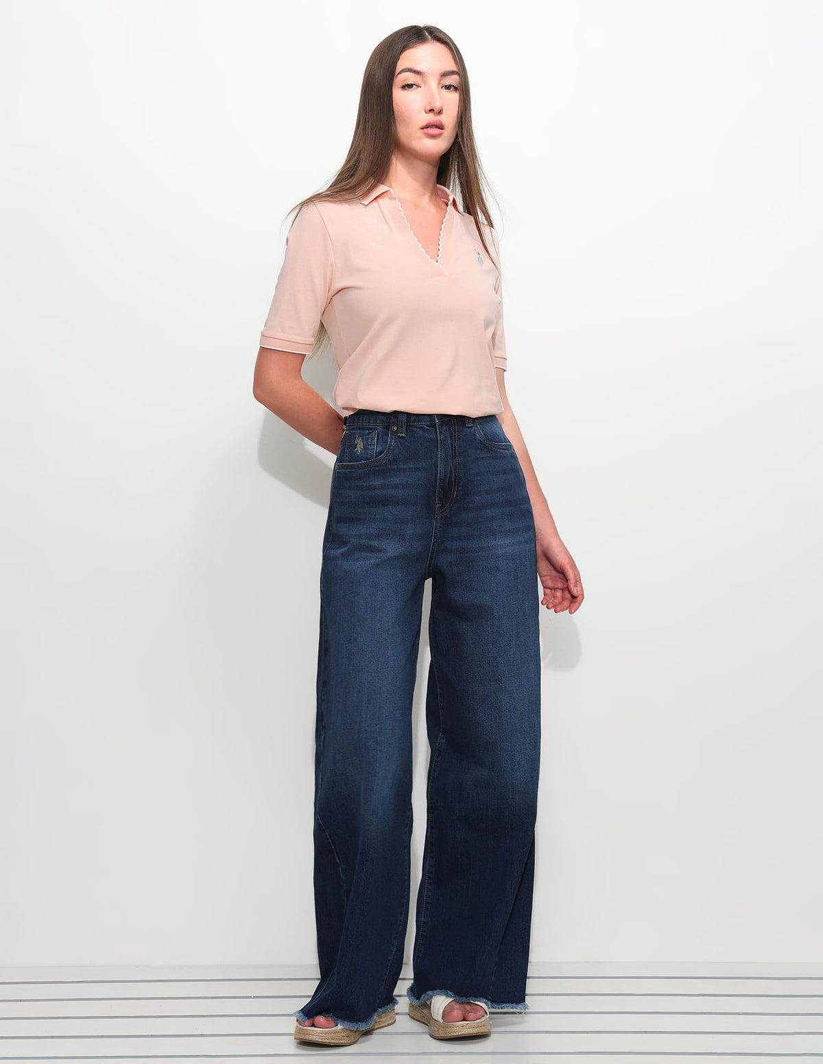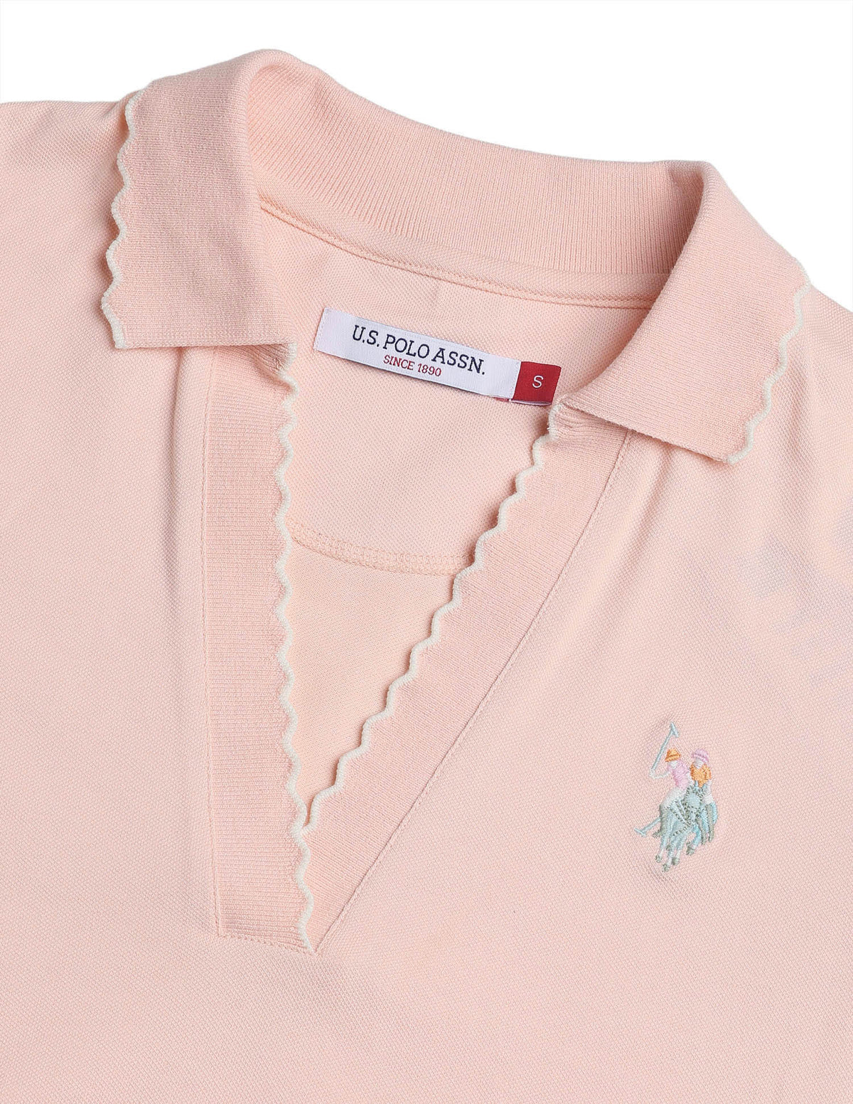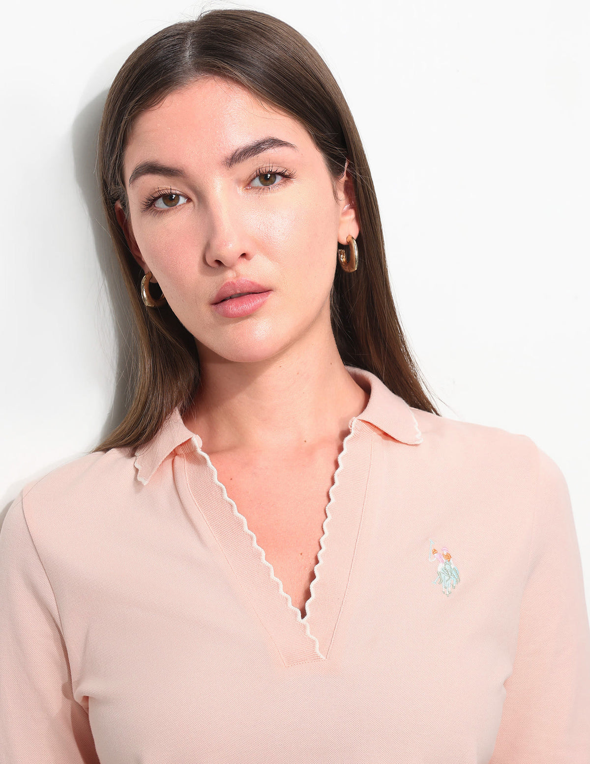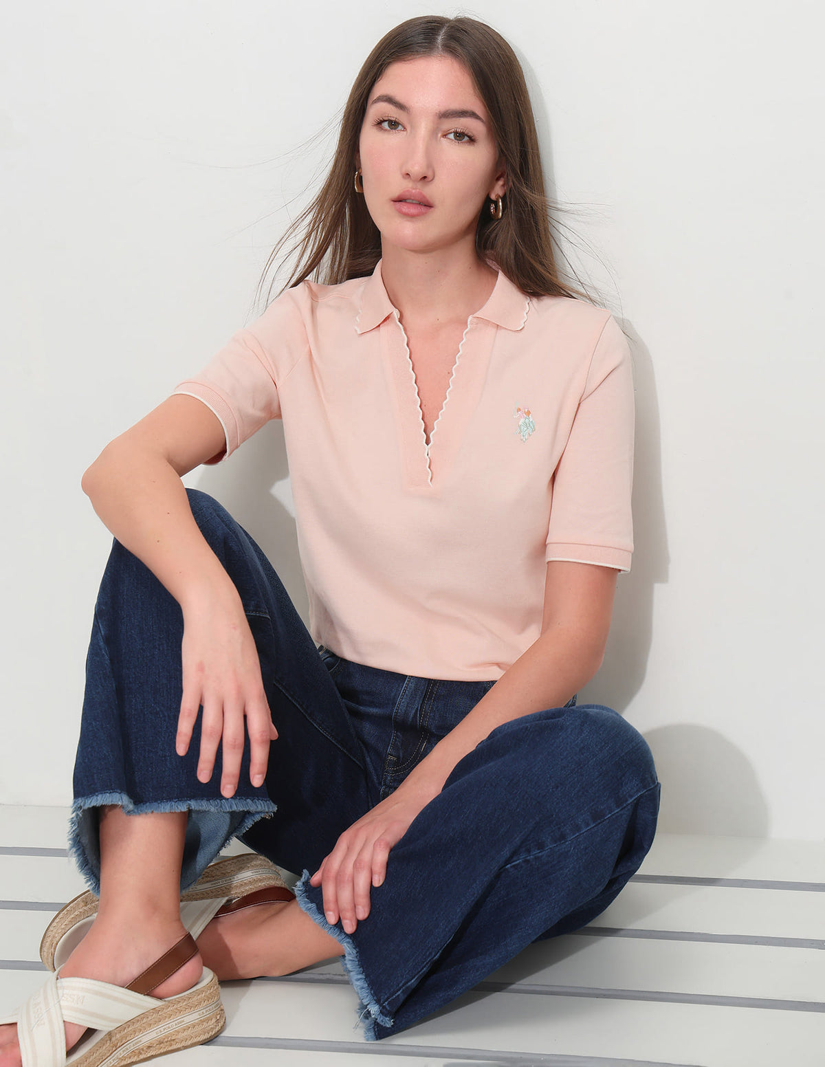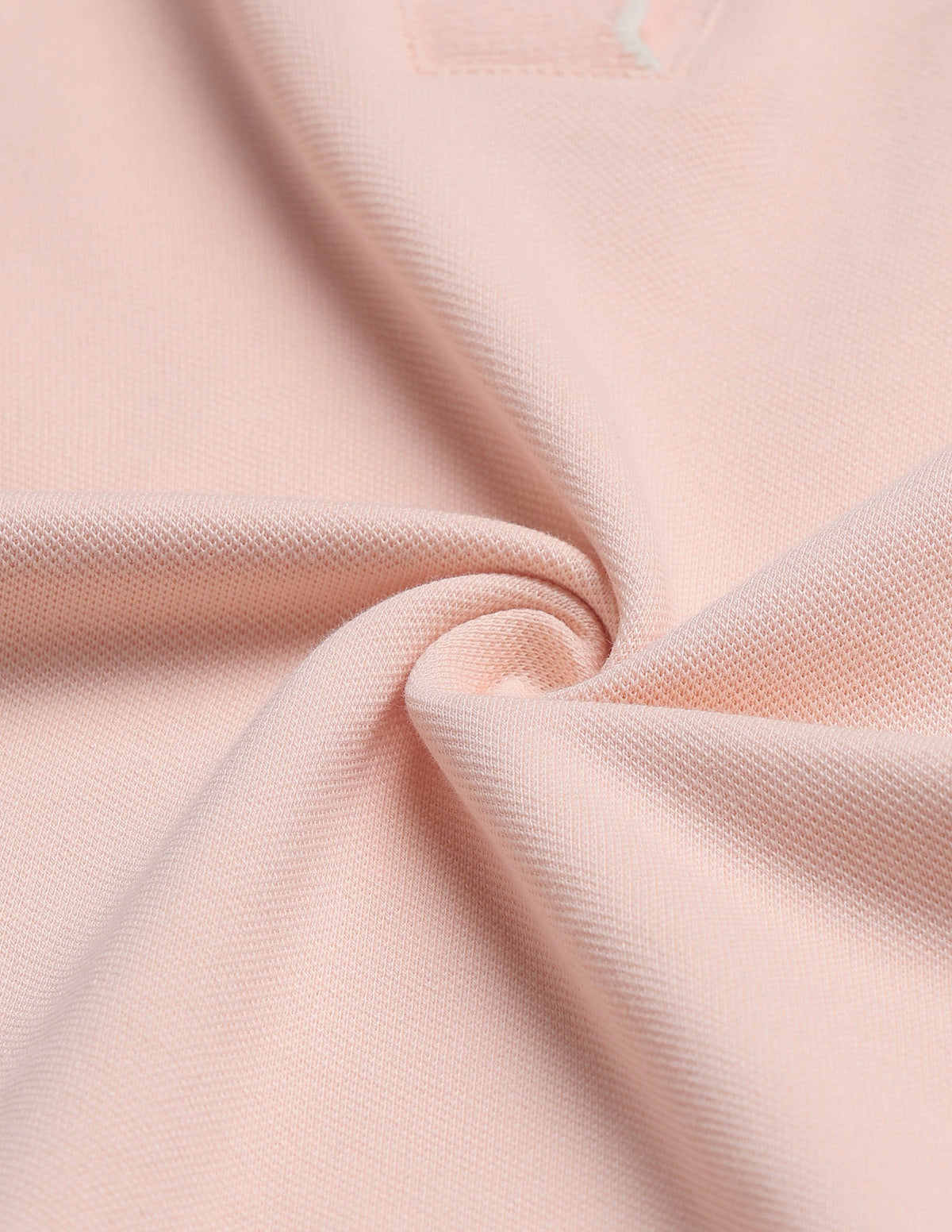 | Polo collar with V-neck | Short button placket | Short sleeves | Ribbed collar and sleeve hems | Uneven vented hem | Textured pattern | Pique knit | Regular fit |