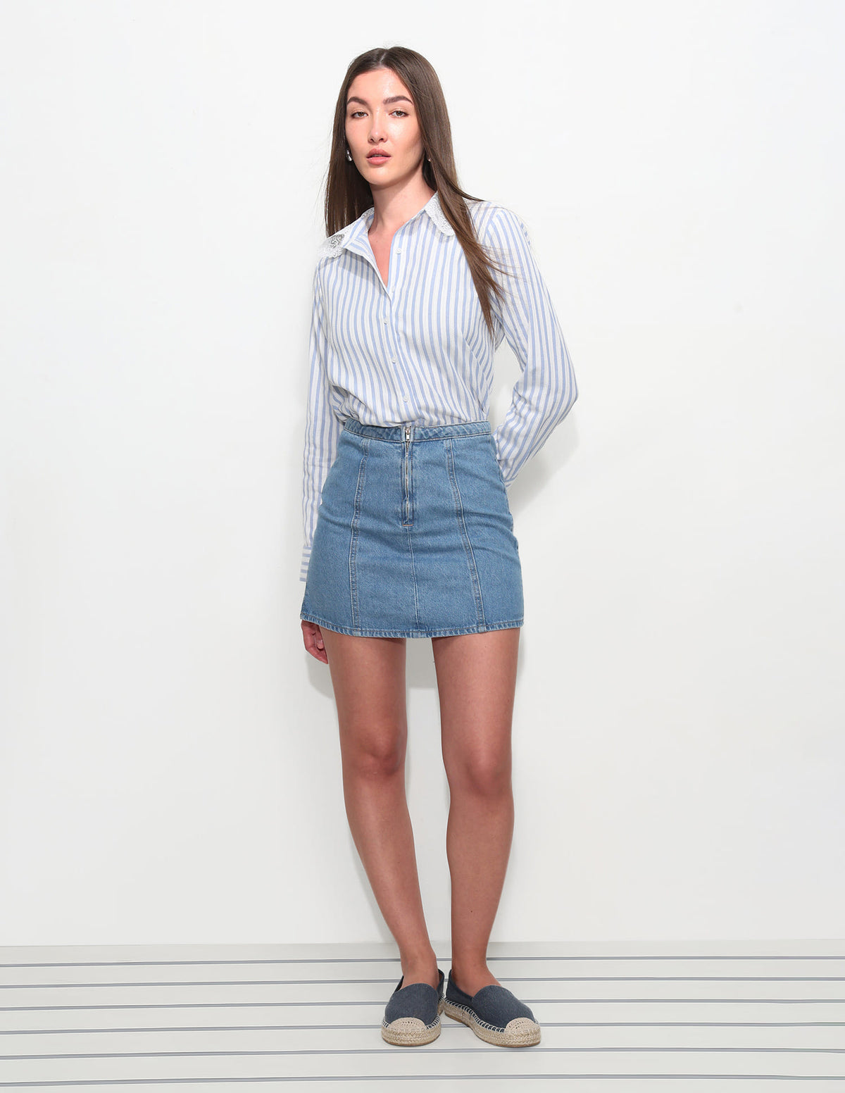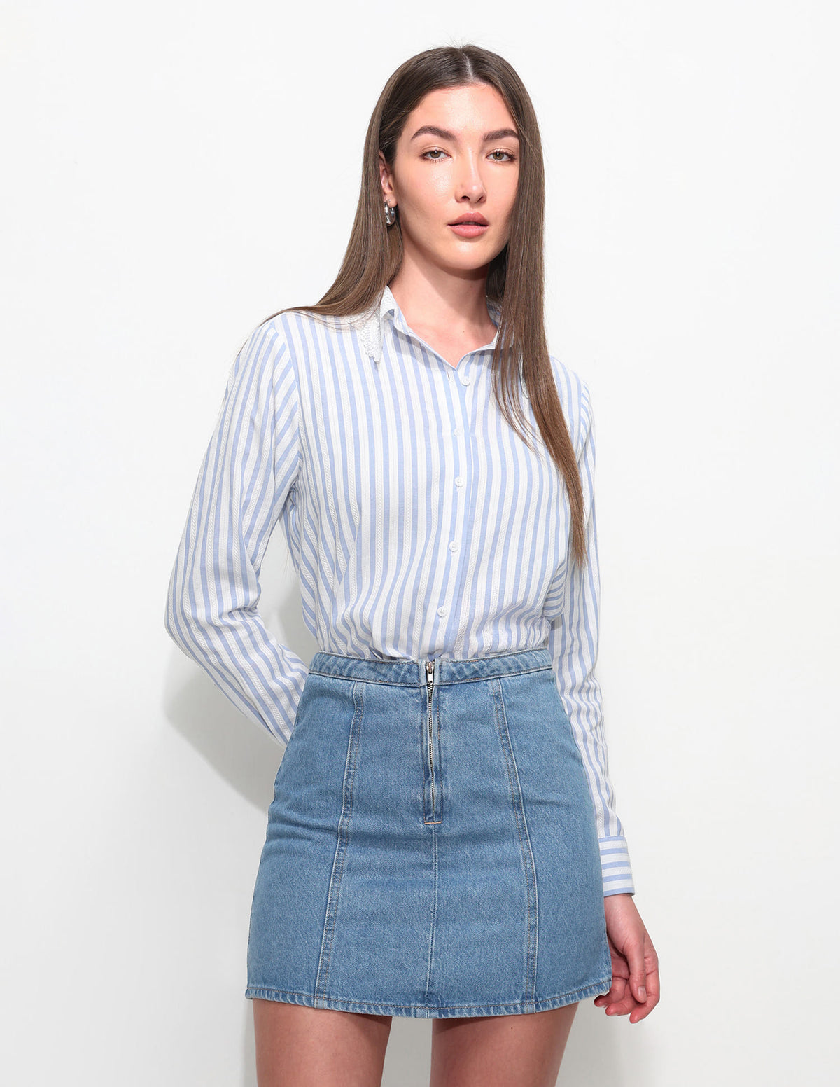 | Spread collar | Full button placket | Long sleeves with barrel cuffs | Curved hemline | Vertical stripes pattern with textured detail | Regular weave | Regular fit |