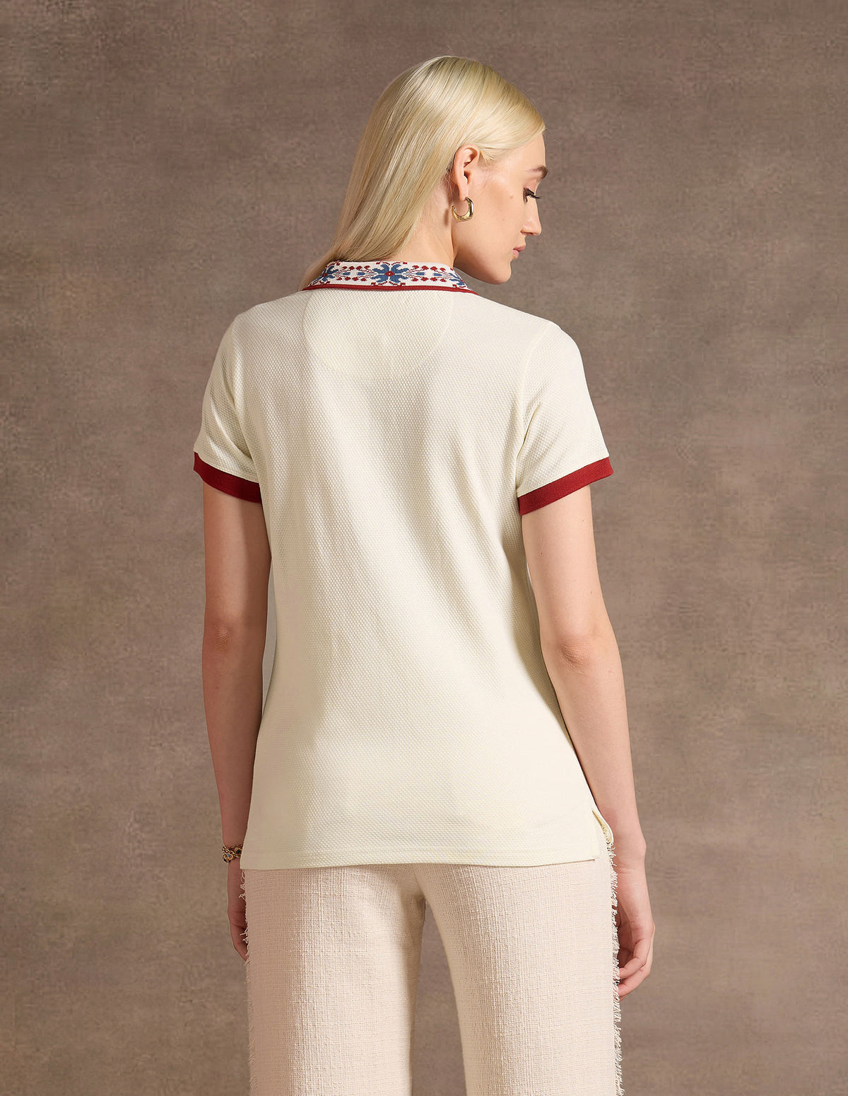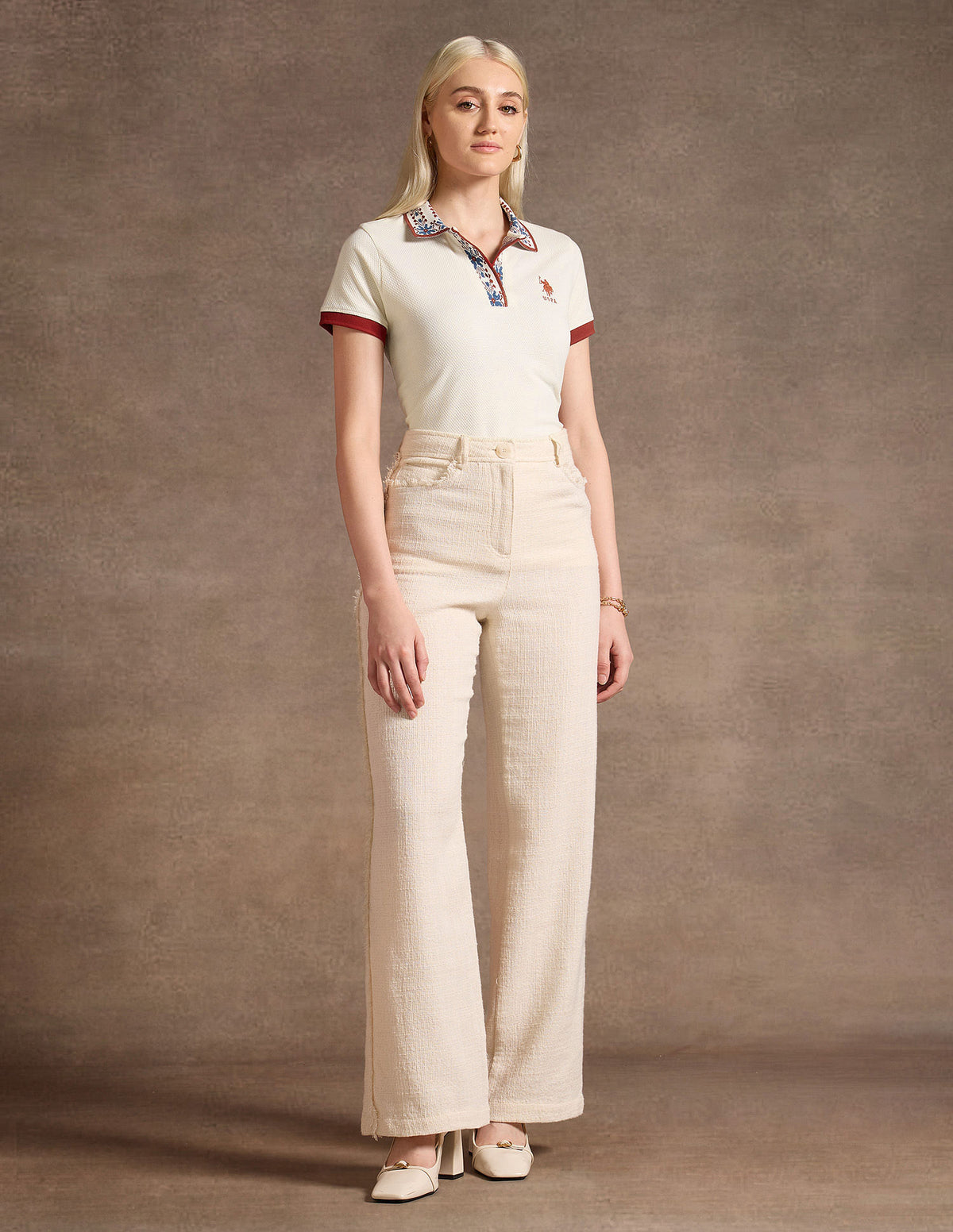 | Jacquard polo collar | Logo at chest | Short button placket | Short sleeves with contrast hems | Ribbed collar and sleeve hems | Vented hem | Textured pattern | Pique knit | Regular fit