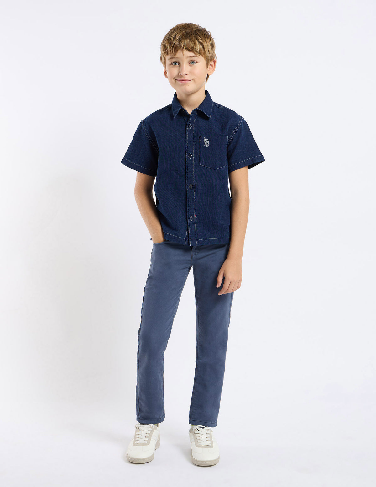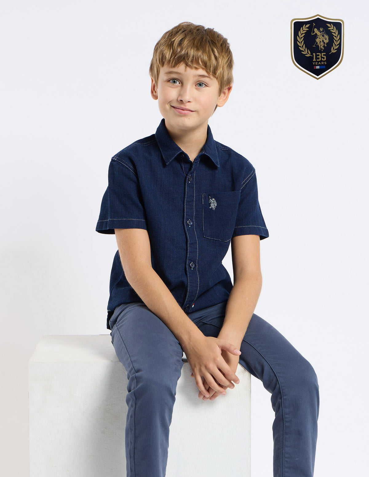 Story: Elevate your boy's style with this solid shirt. A versatile and comfortable piece for casual, everyday wear.
