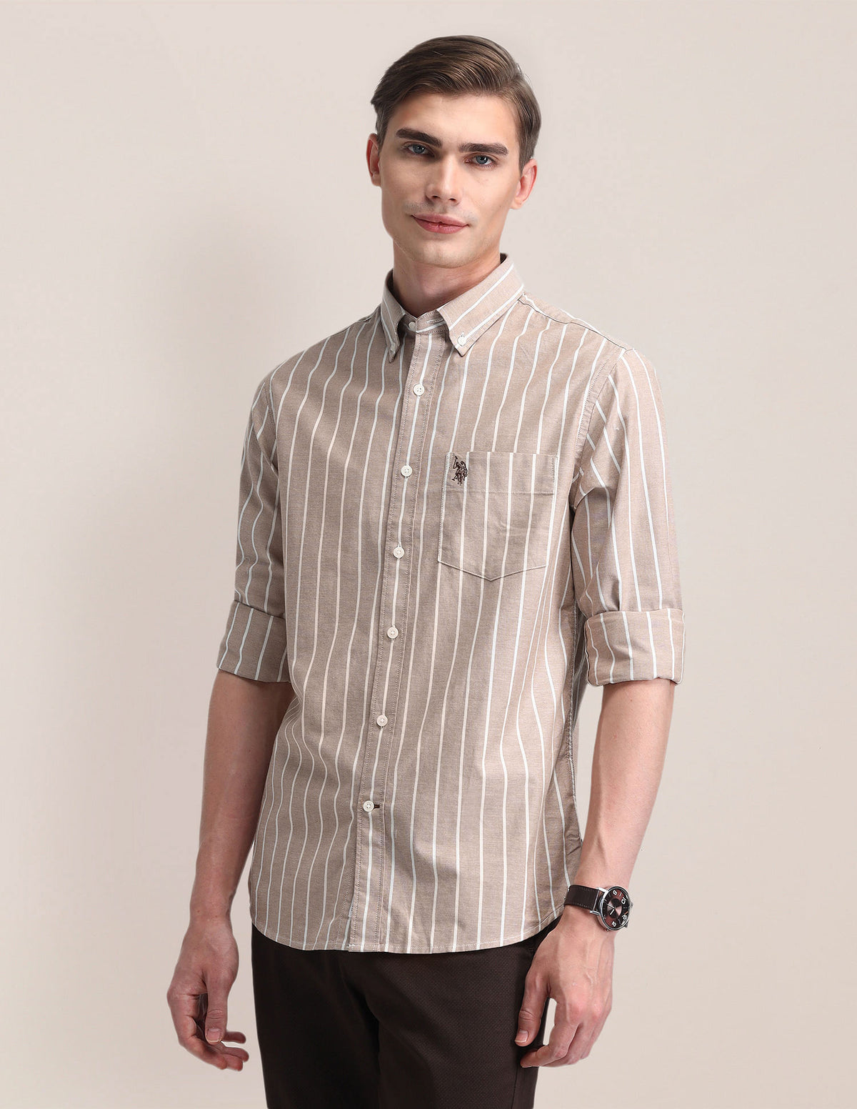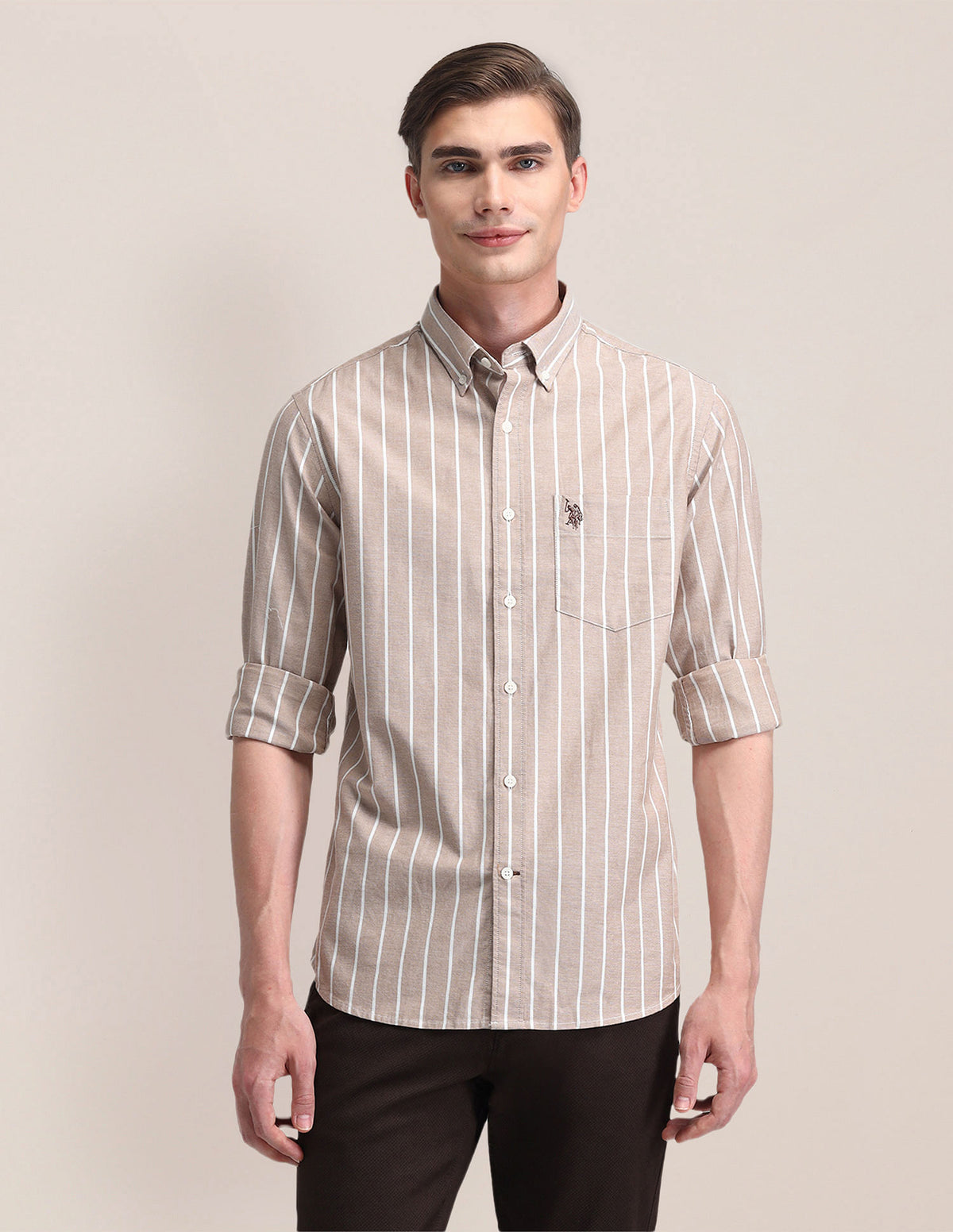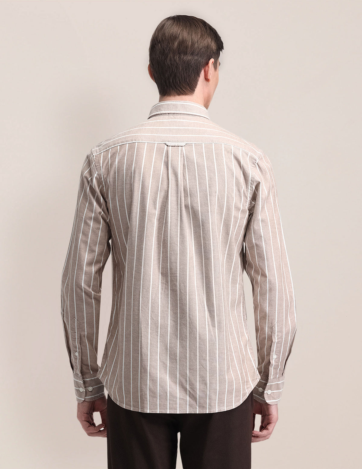 | Semi-cutaway collar | French button placket | Long sleeves | Curved hemline | Striped pattern | Oxford weave | Brand Fit: Tailored Fit | Fit mapping: Regular fit