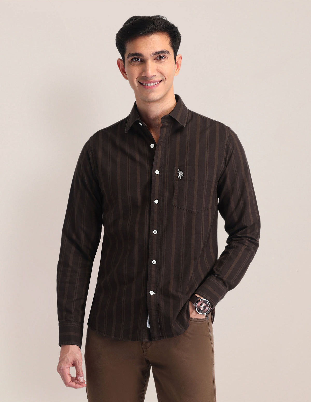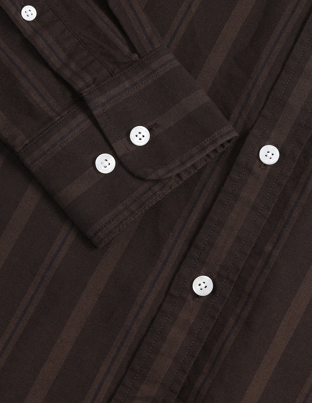 | Semi-spread collar | Logo at chest | Full button placket | Long sleeves with rounded cuffs | Curved hemline | Vertical striped pattern | Oxford weave | Tailored fit |