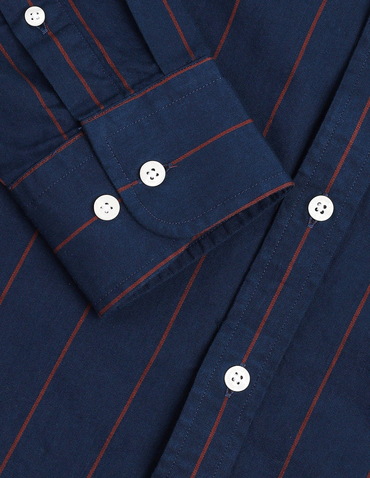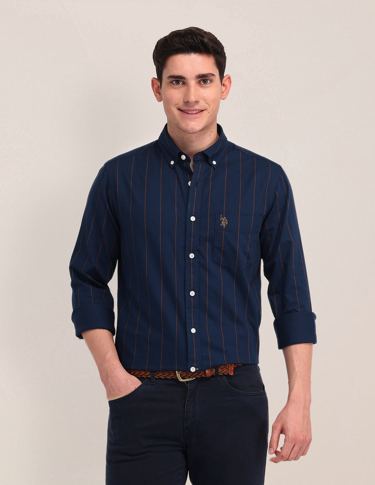 | Button-down collar | Logo at chest | Full button placket | Long sleeves with rounded cuffs | Curved hemline | Vertical striped pattern | Twill weave | Tailored fit |