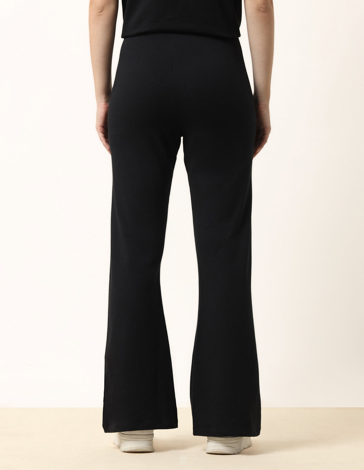 | High-rise waist | Slip-on closure | Flat front | Solid pattern | Flared fit |