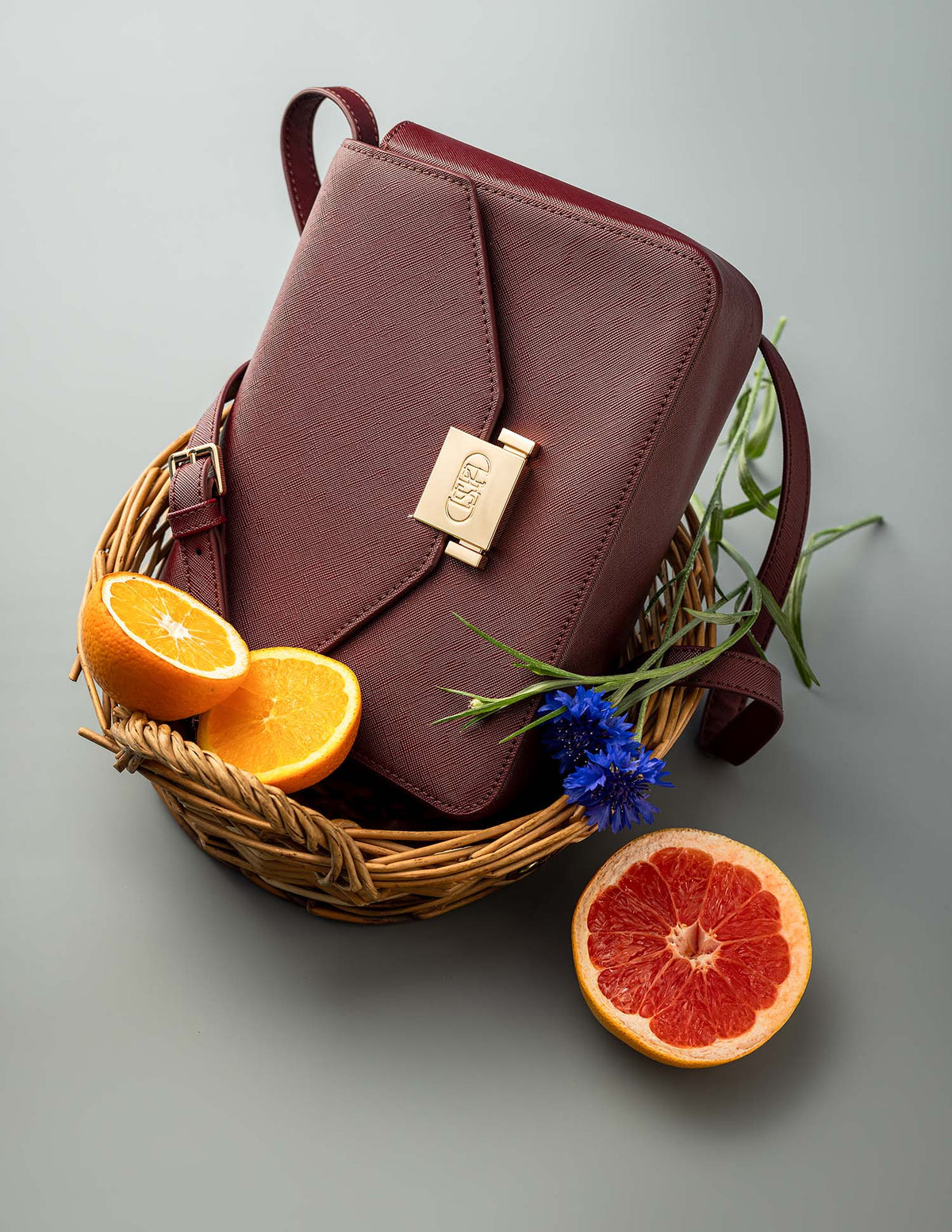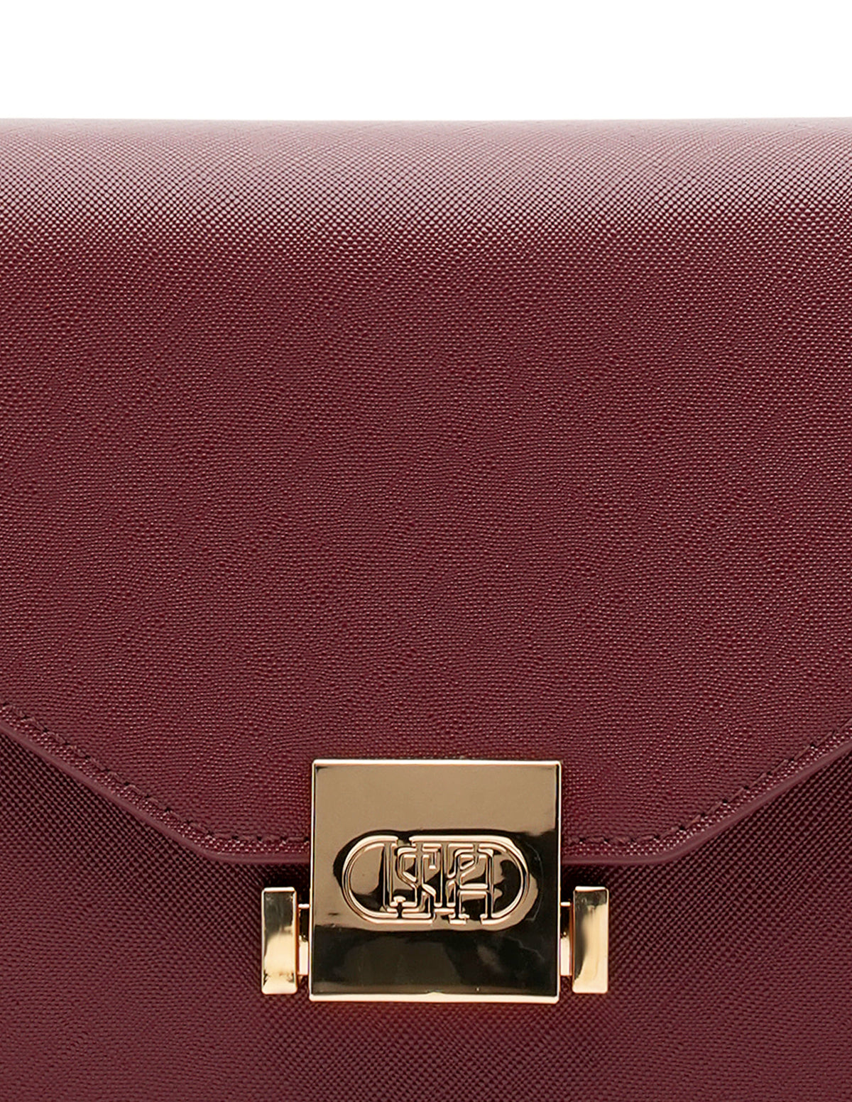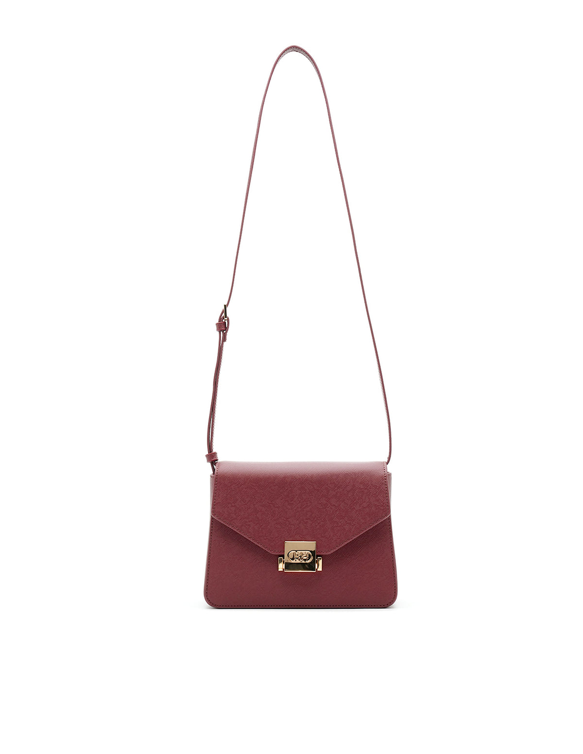 | Adjustable shoulder strap | Metallic logo accent at front | One main compartment with buckle closure | One inner pocket with zipper closure | Solid pattern |