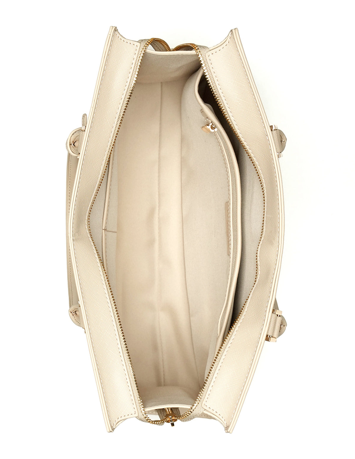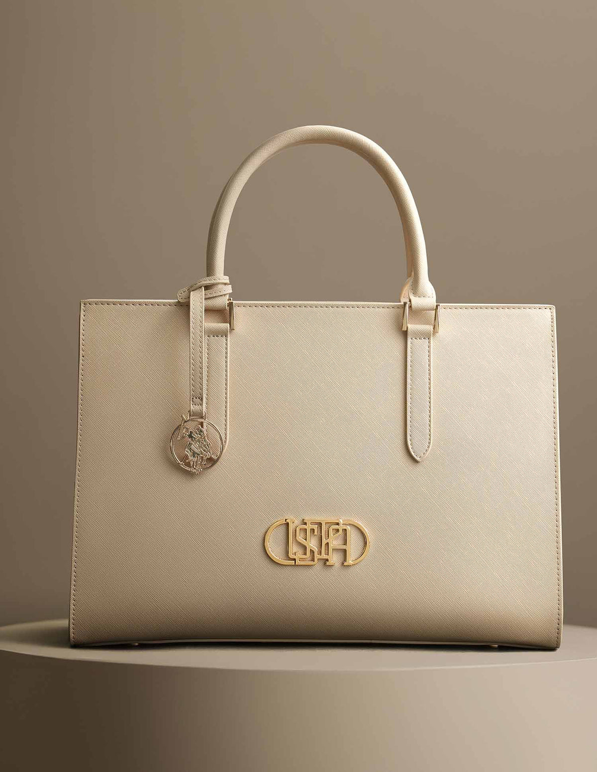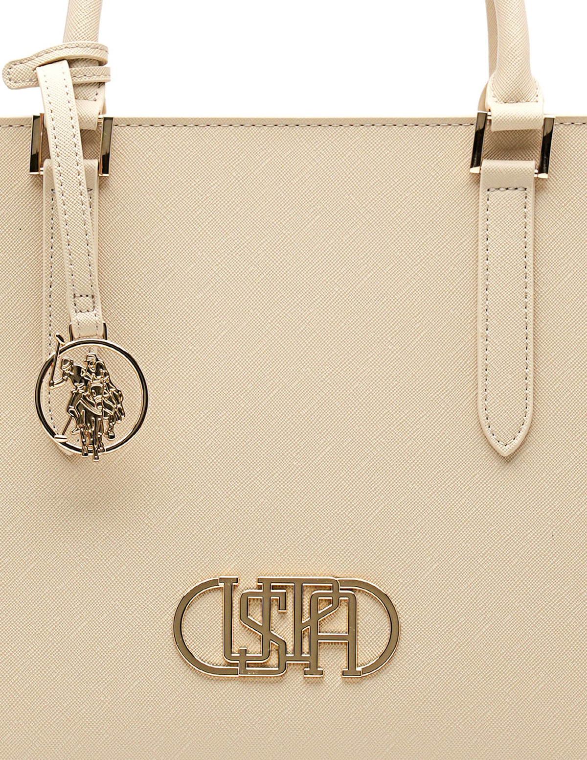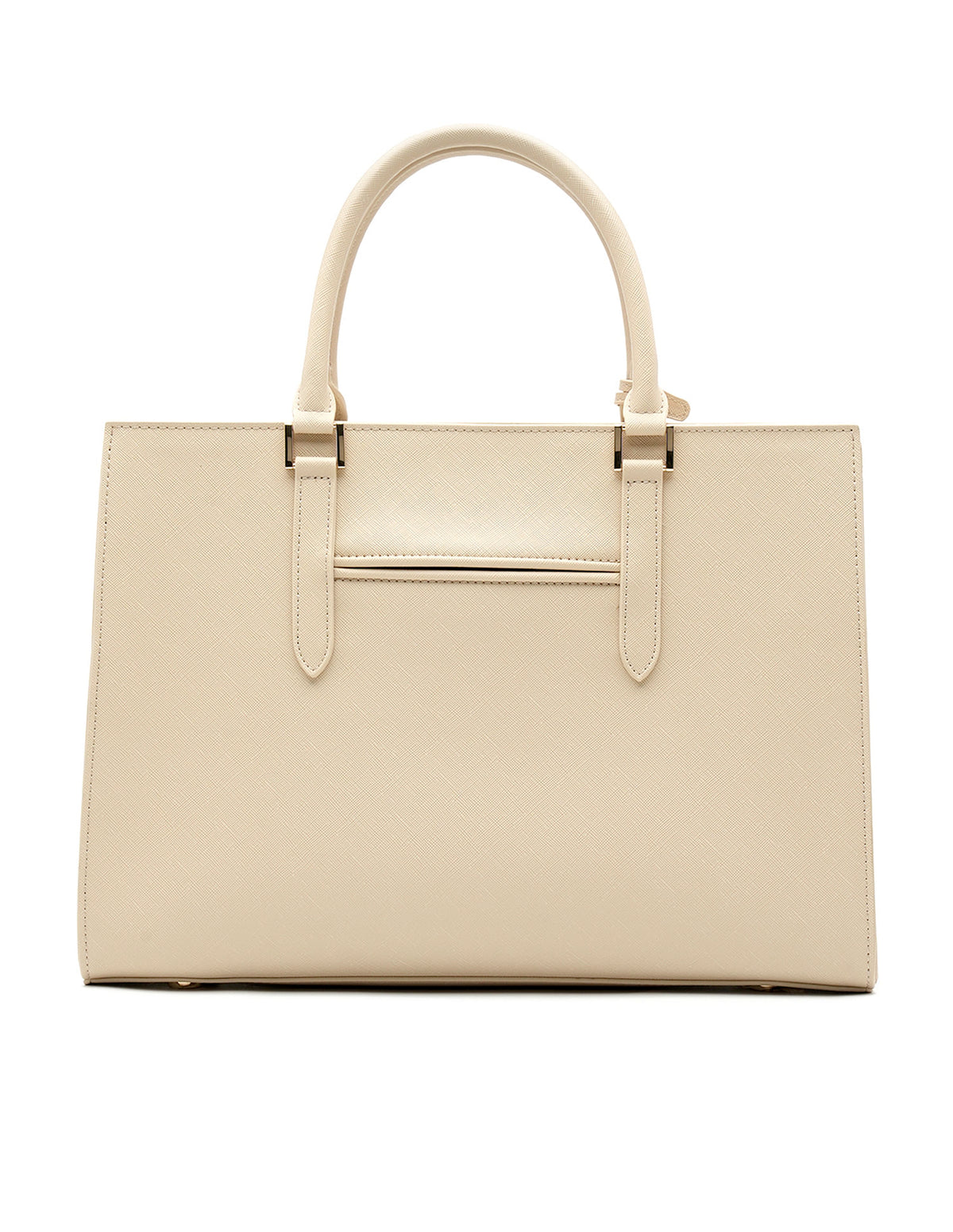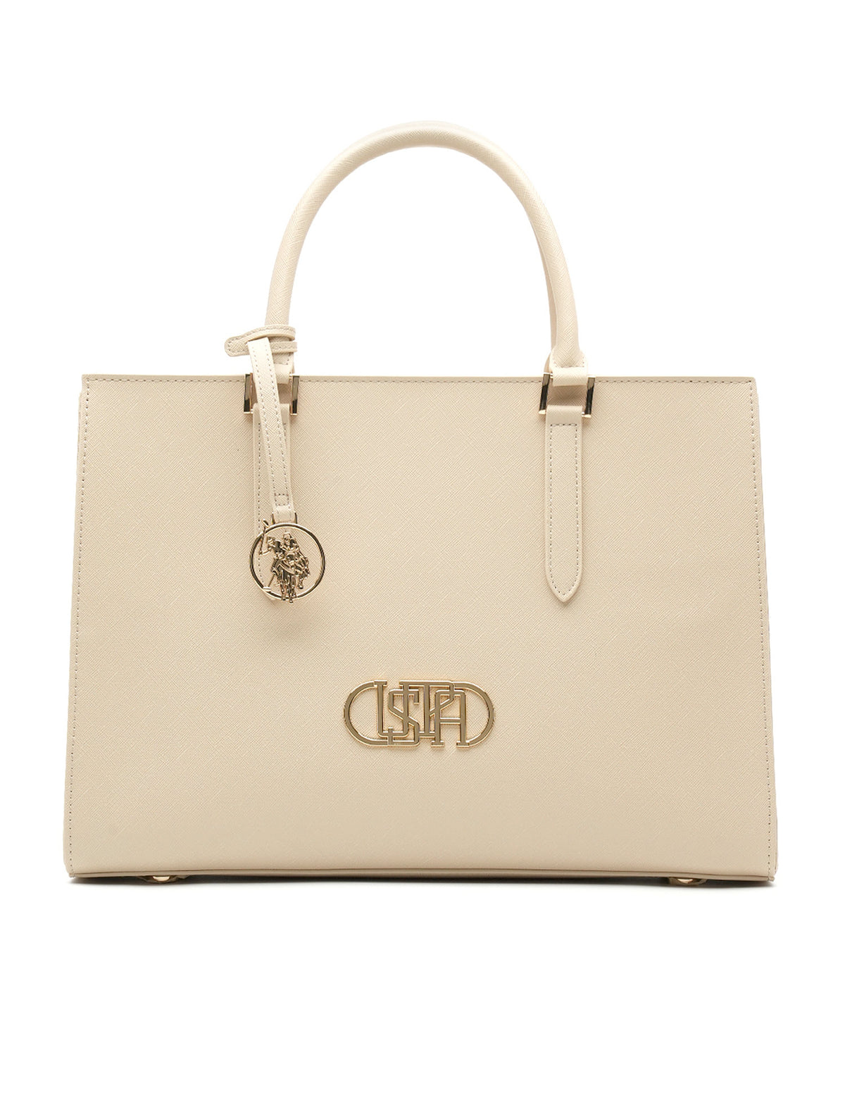 | Top handles | Metallic monogram accent at front | One main compartment with zipper closure | Textured pattern |