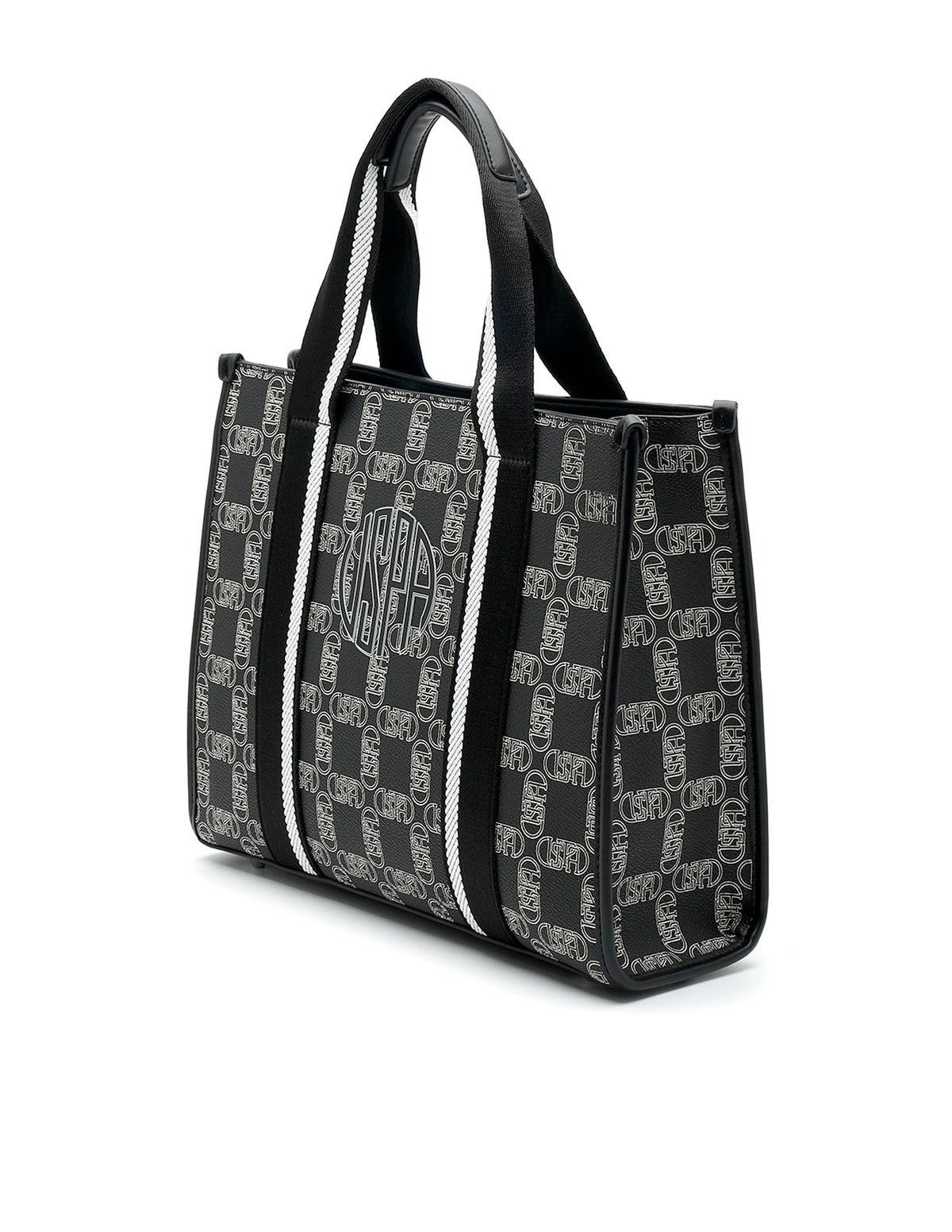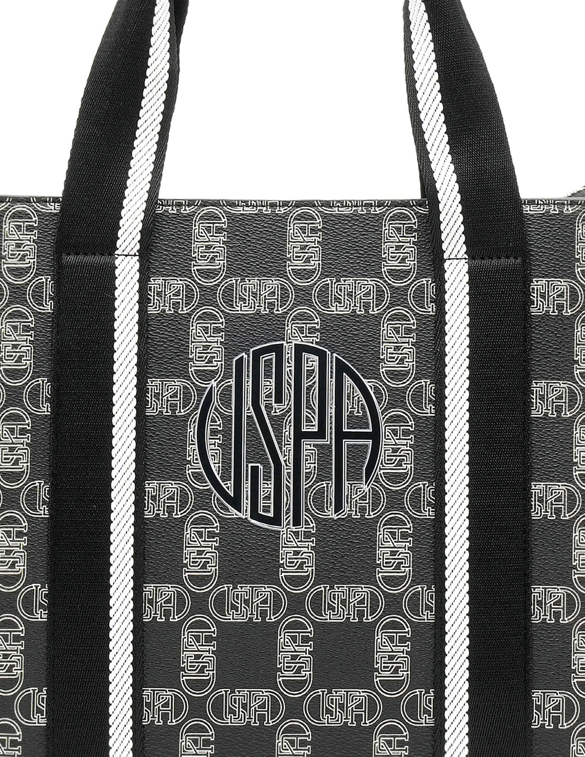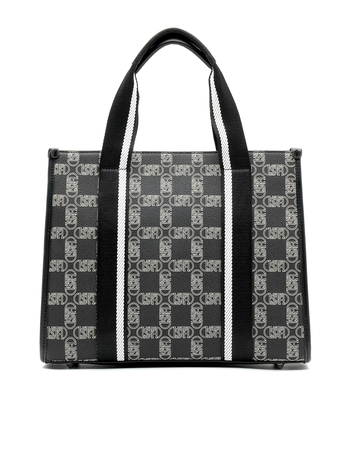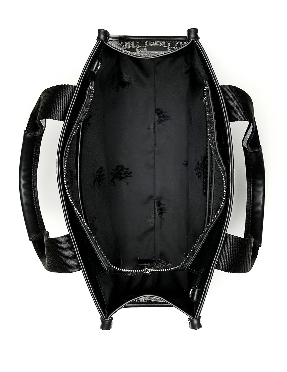 | Top handles | Metallic monogram accent at front | One main compartment with zipper closure | Brand printed pattern |