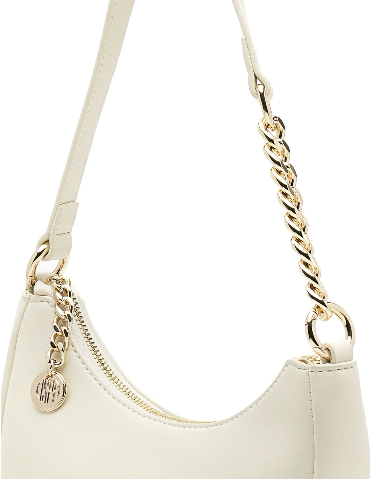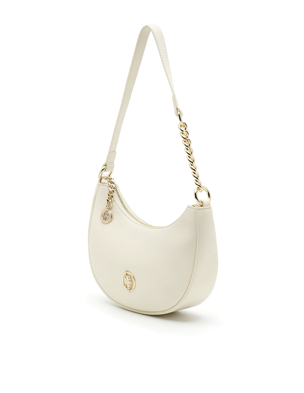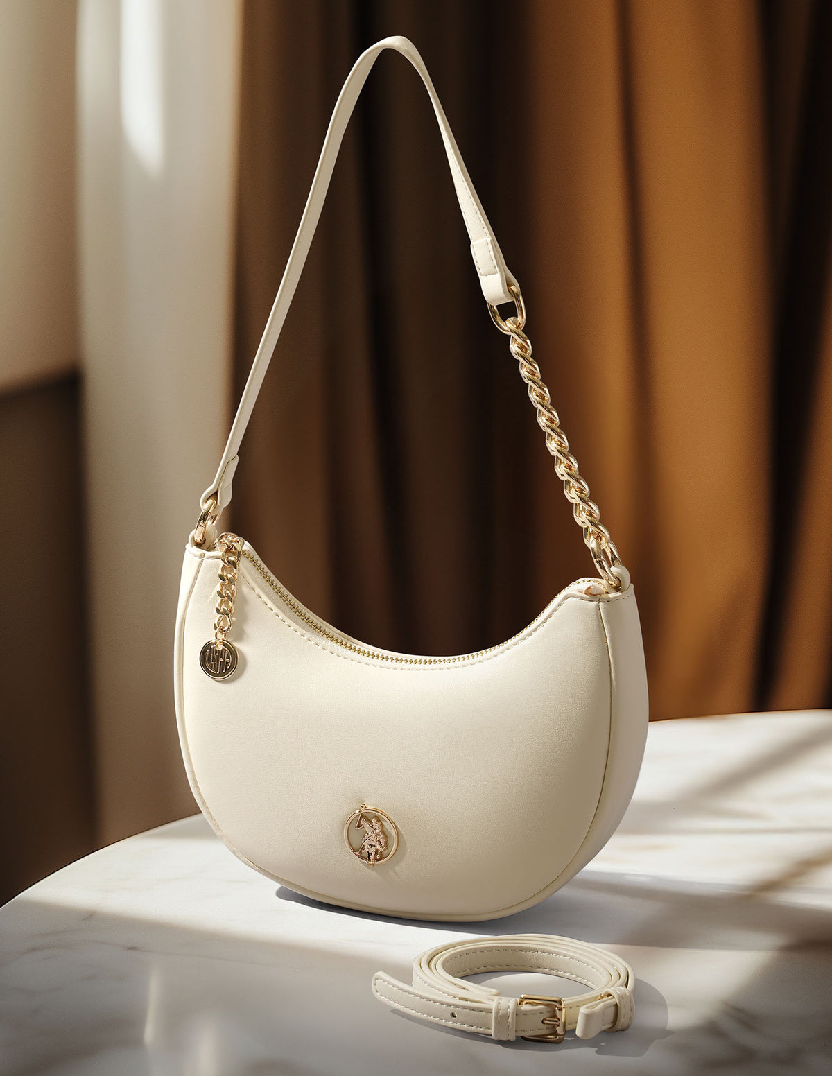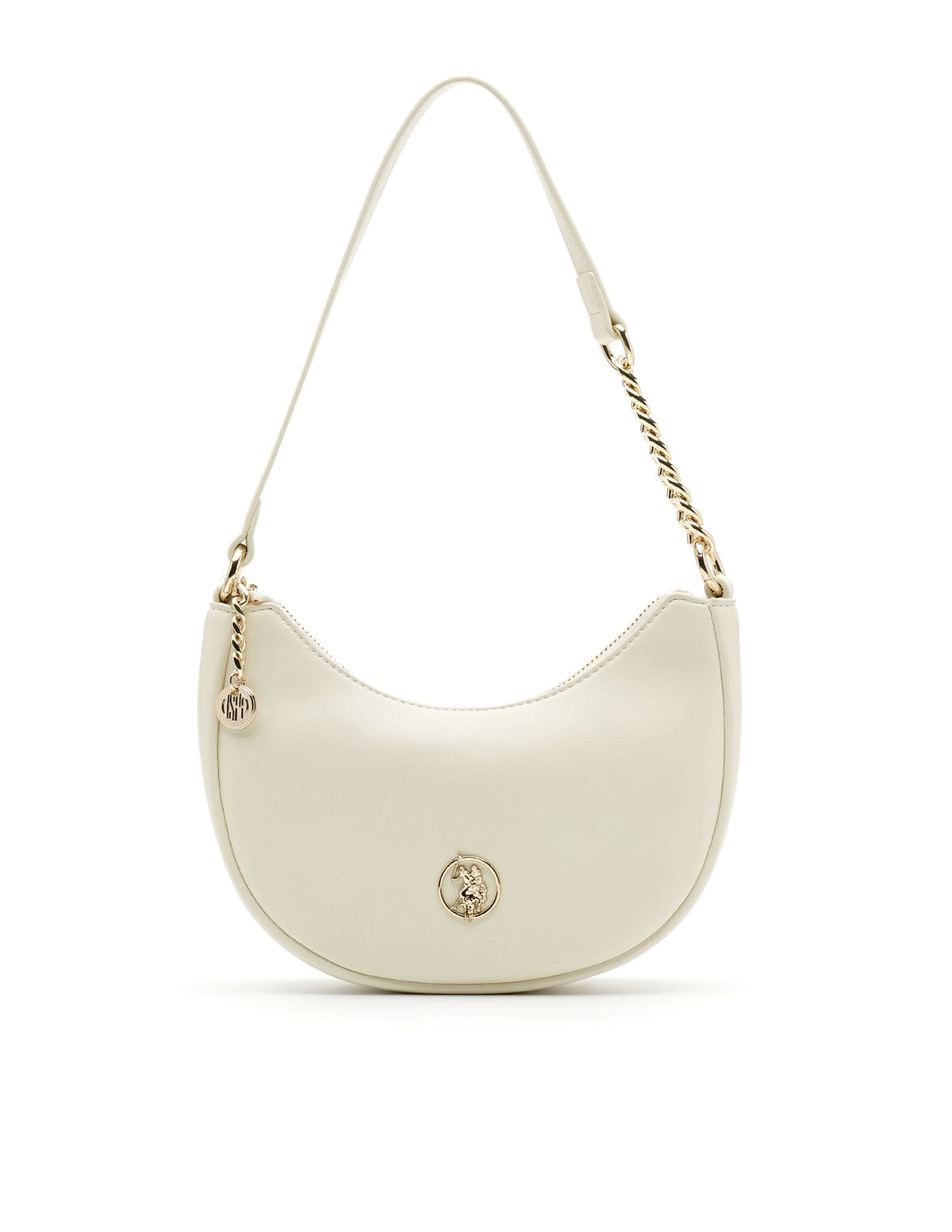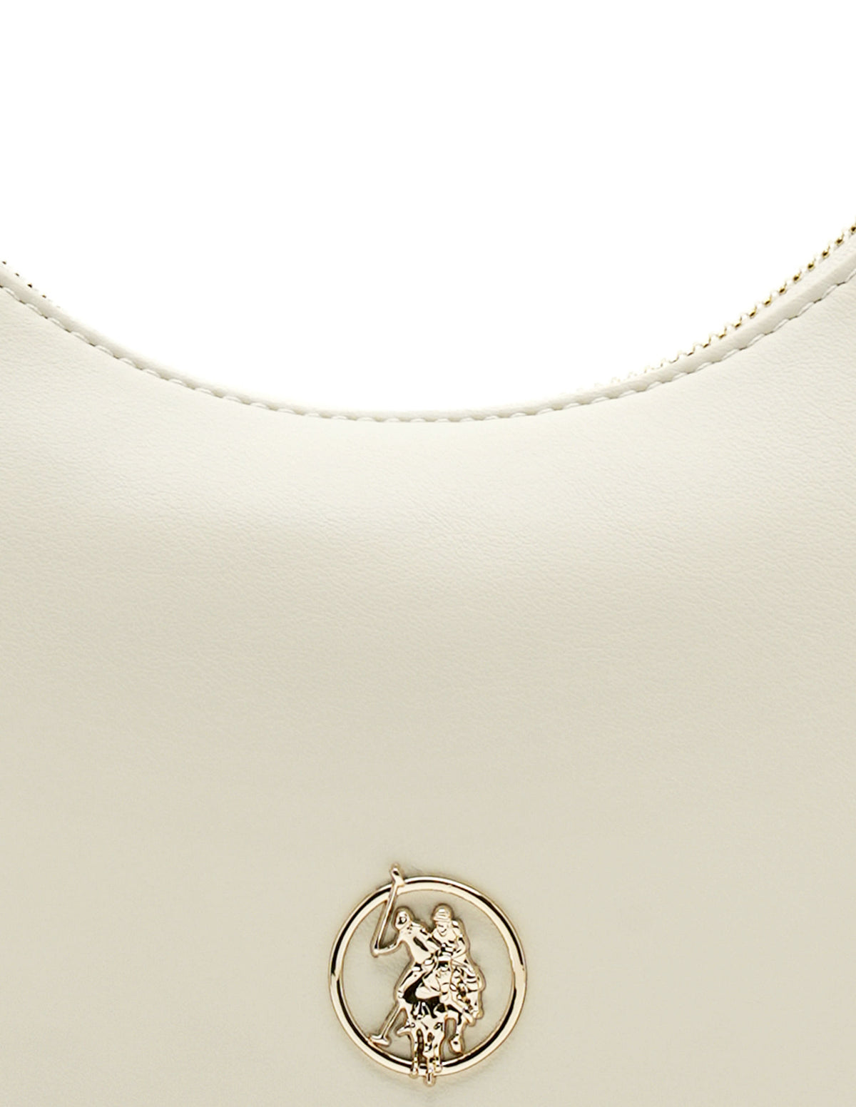 | Top handle | Metallic monogram accent at front | One main compartment with zipper closure | Textured pattern |