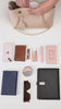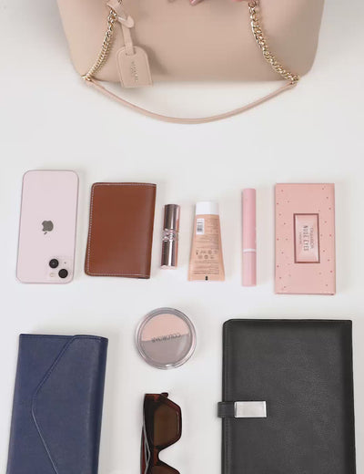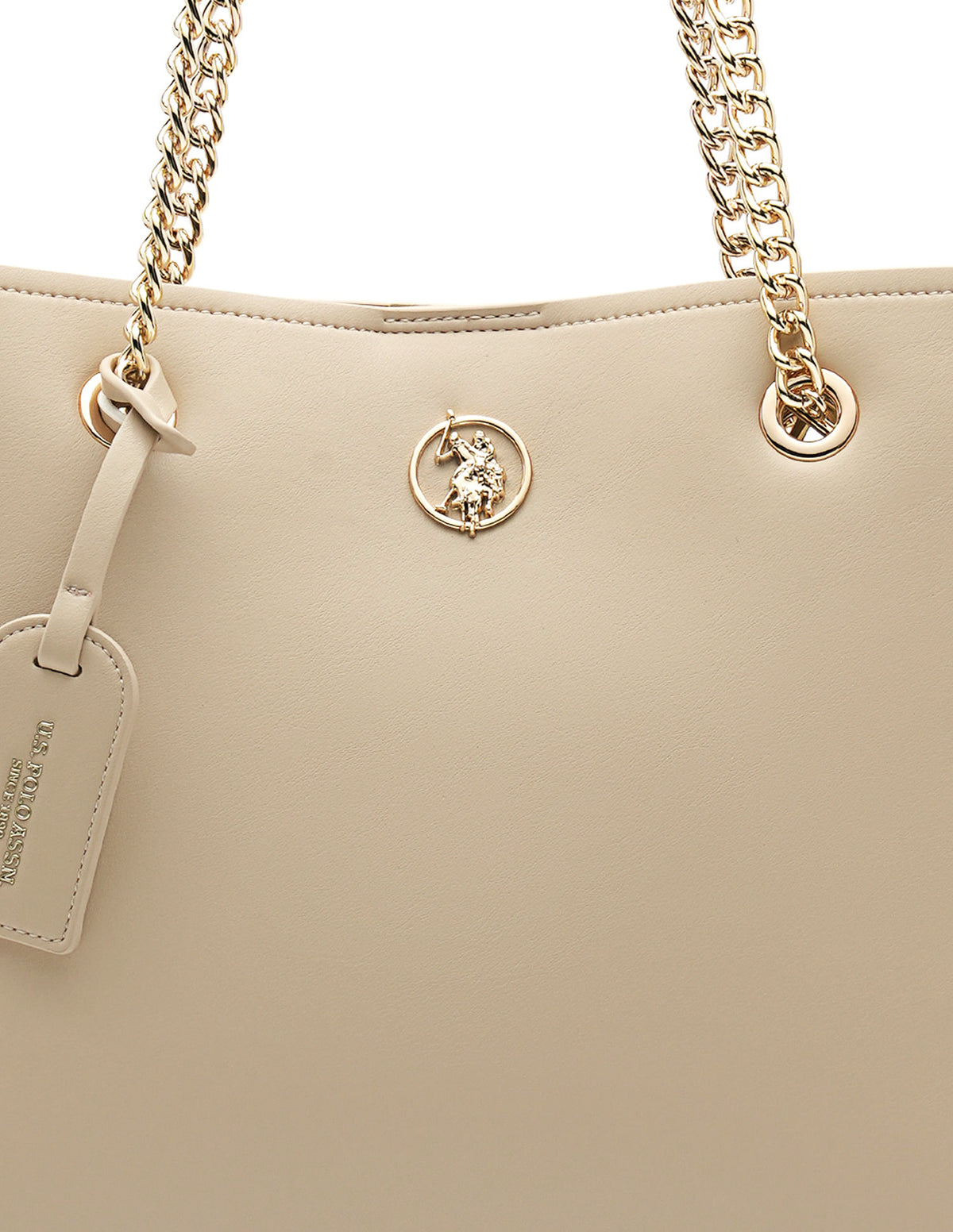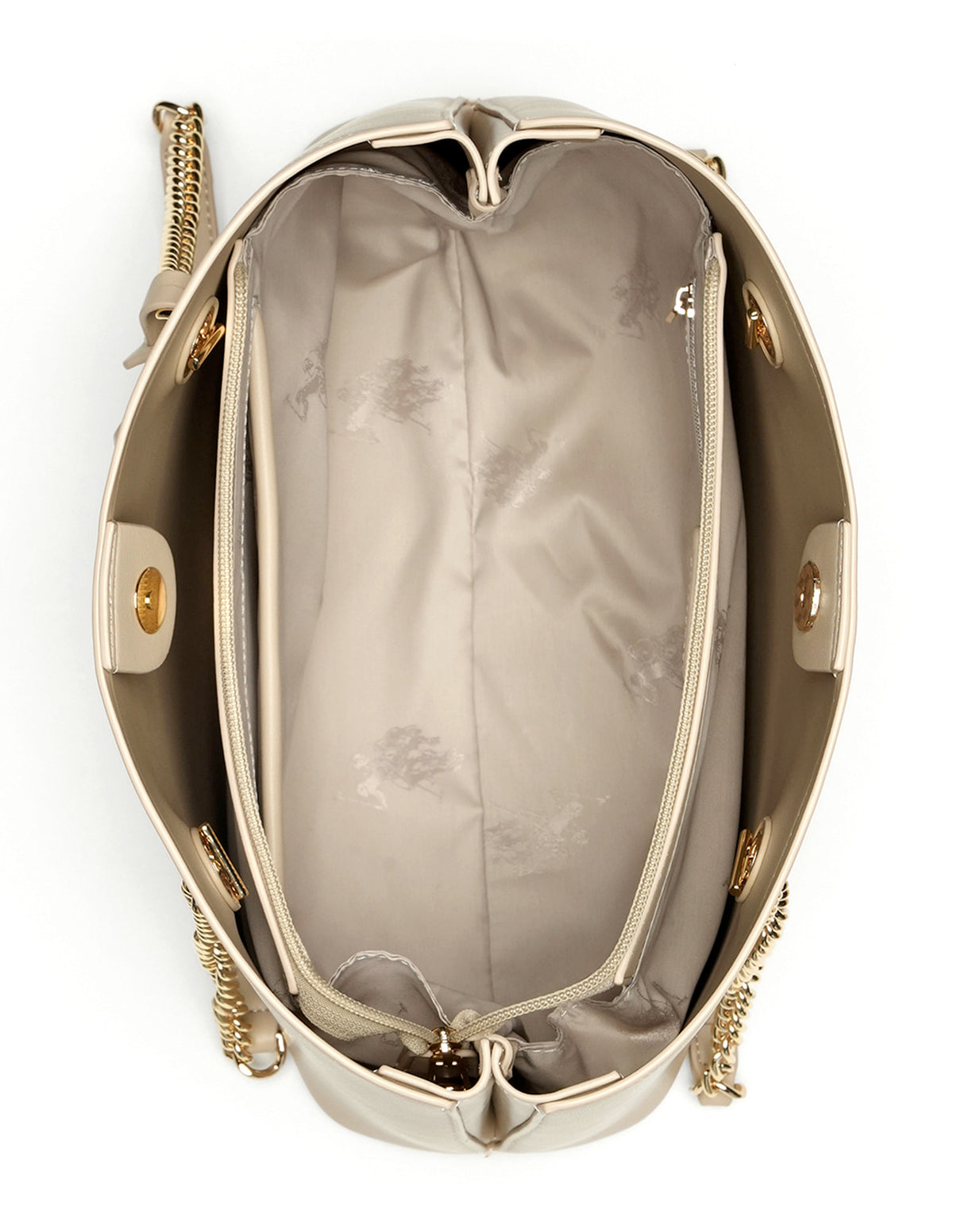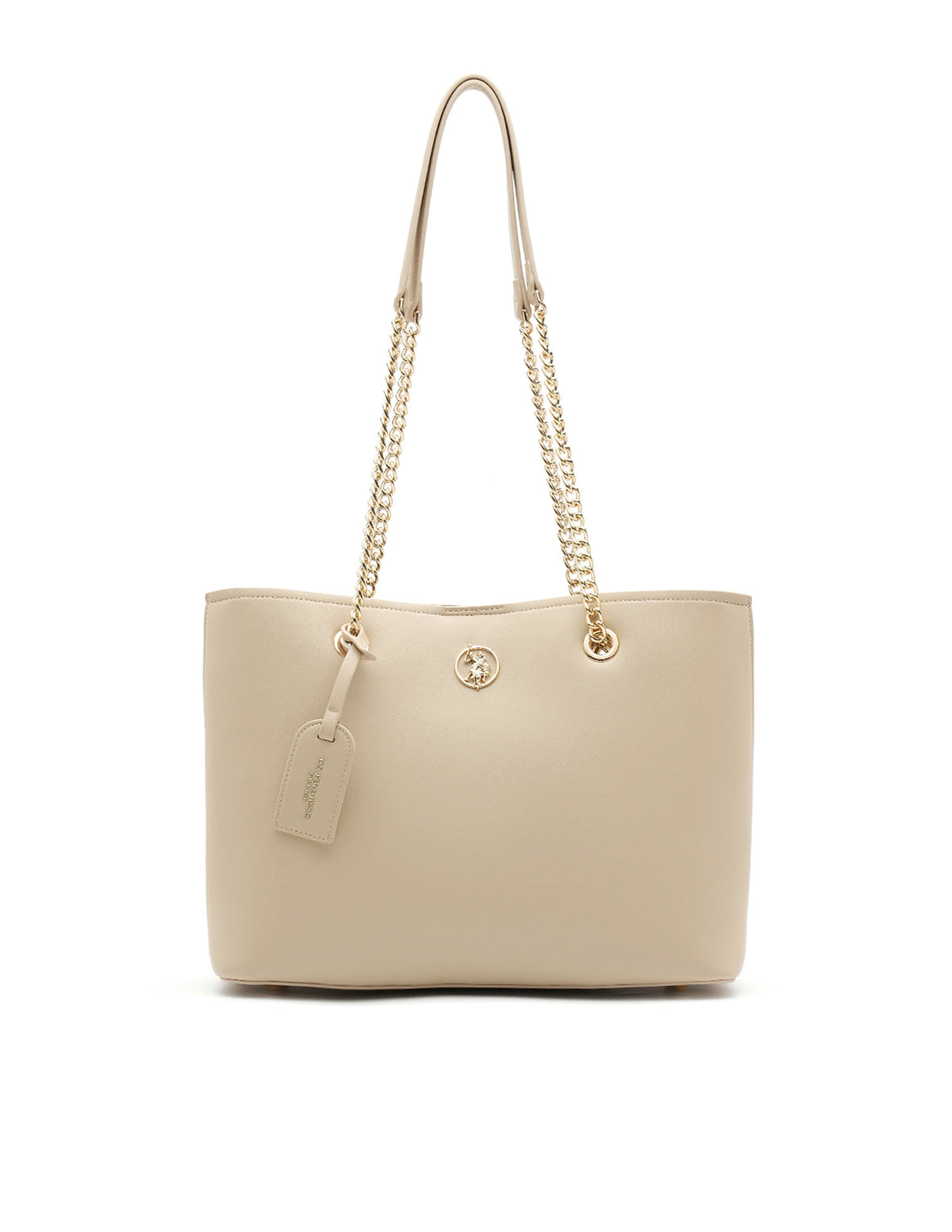 | Top handles | Metallic monogram accent at front | One main compartment with zipper closure | Solid pattern |