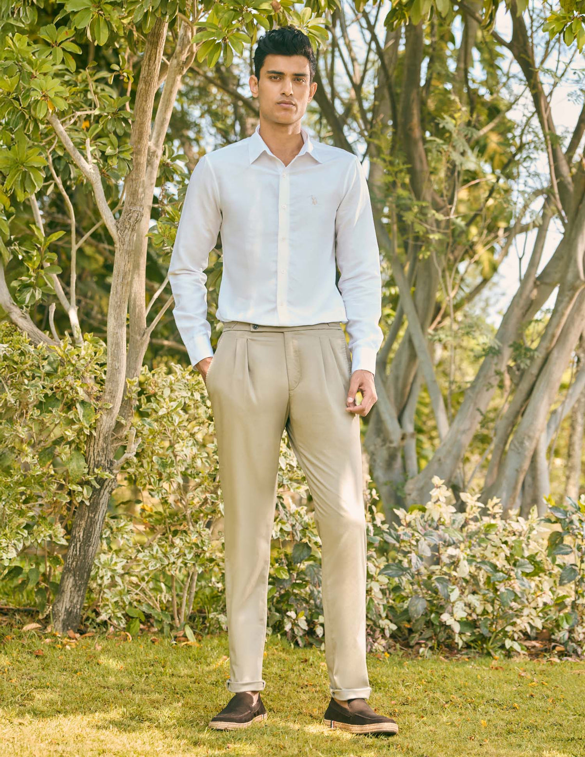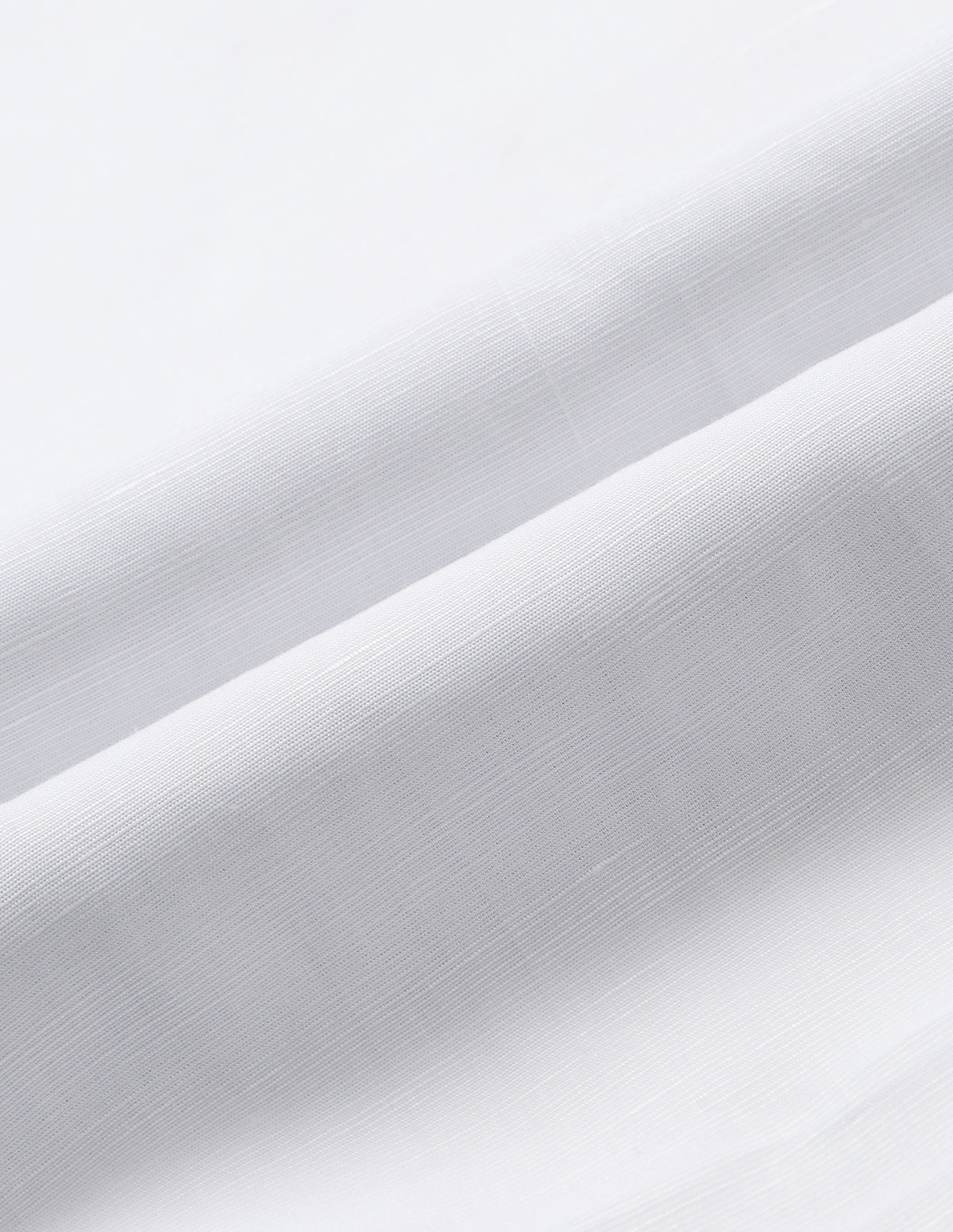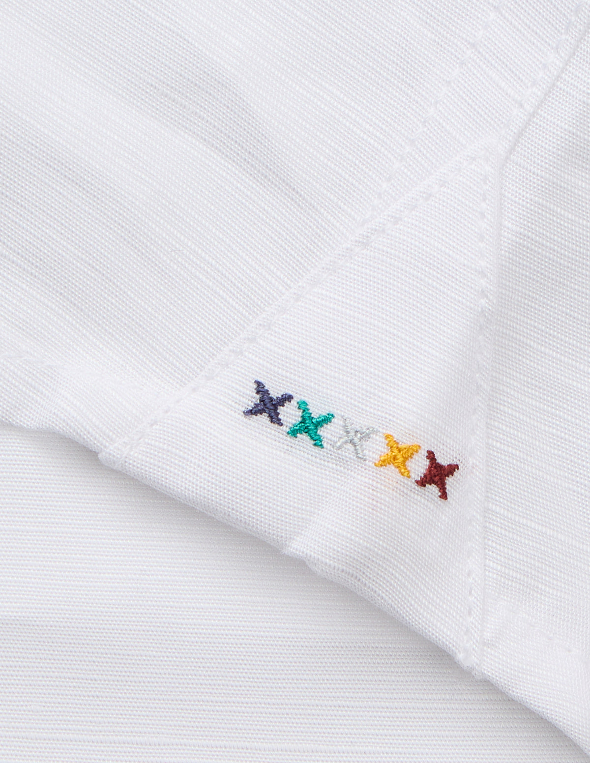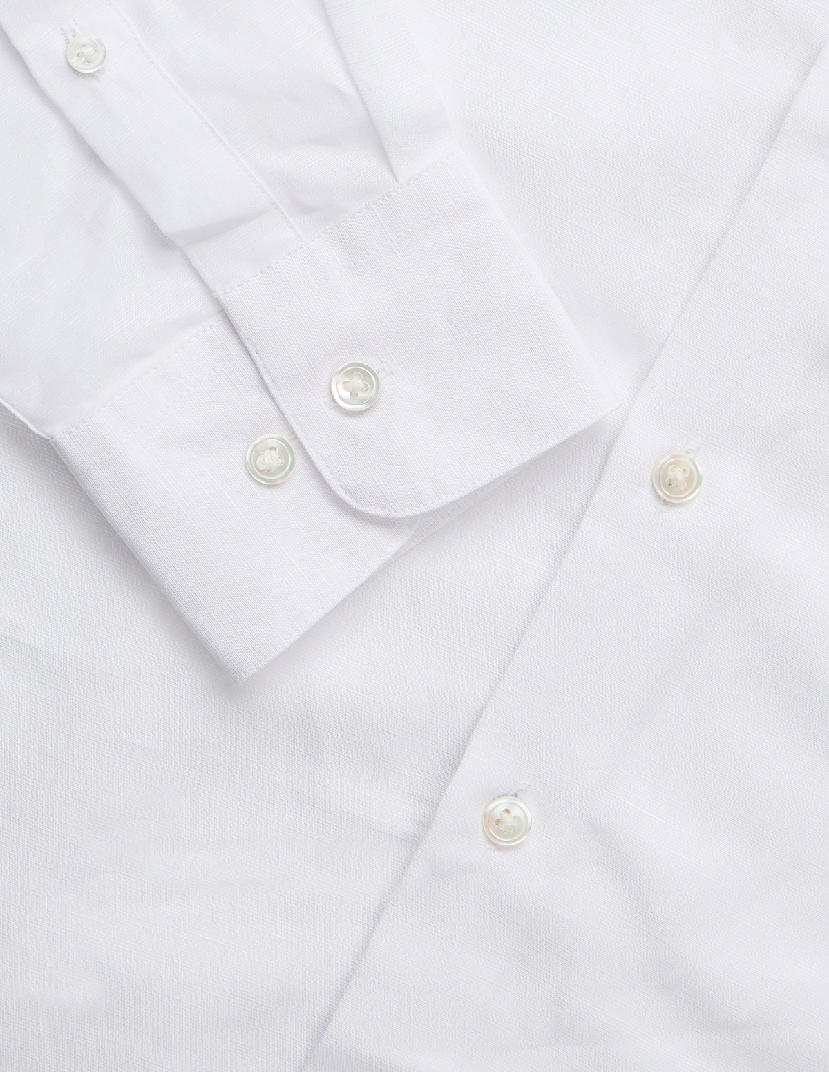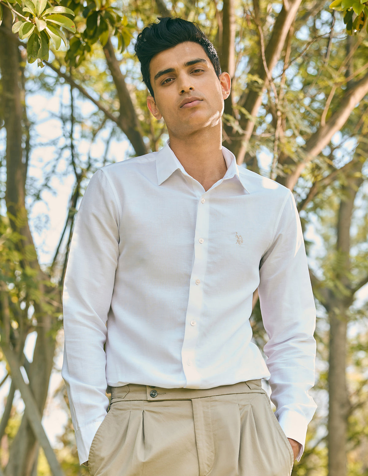 | Spread collar | Embroidered logo at chest | French button placket | Long sleeves with rounded cuffs | Curved hemline | Solid pattern | Regular weave | Tailored fit |