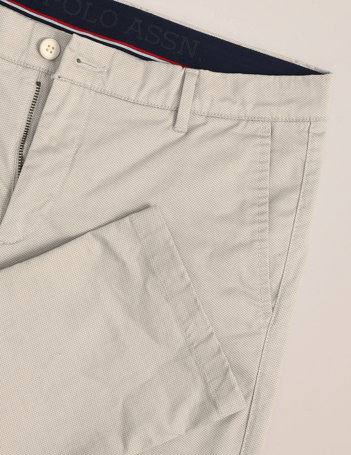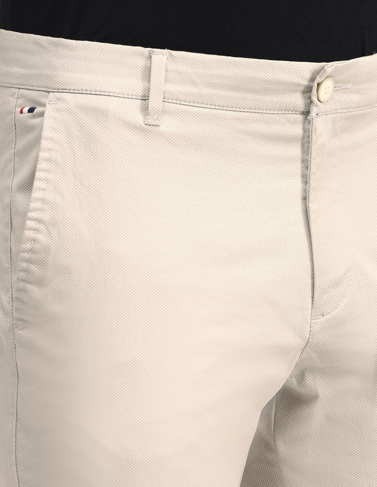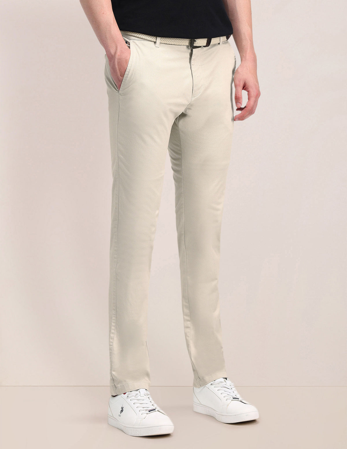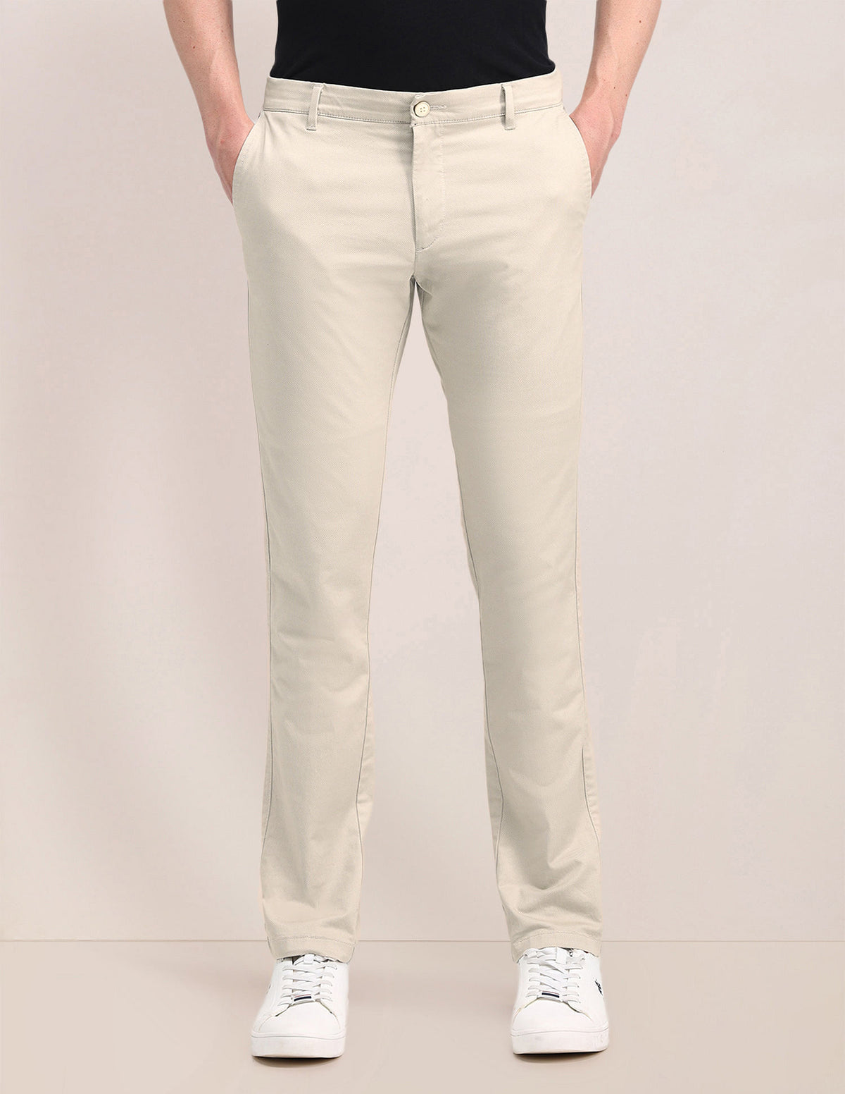 | Mid-rise waist | Button and zip fly closure | Four pockets | Flat front | Solid pattern | Slim fit