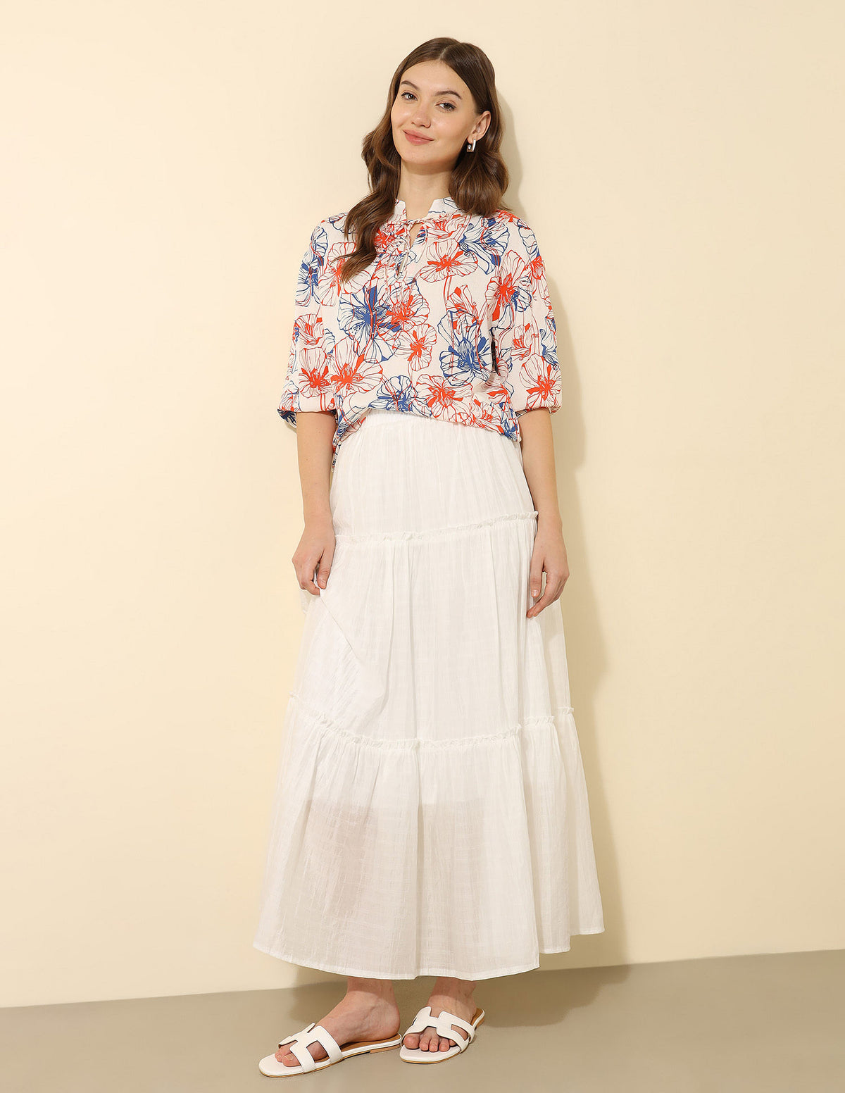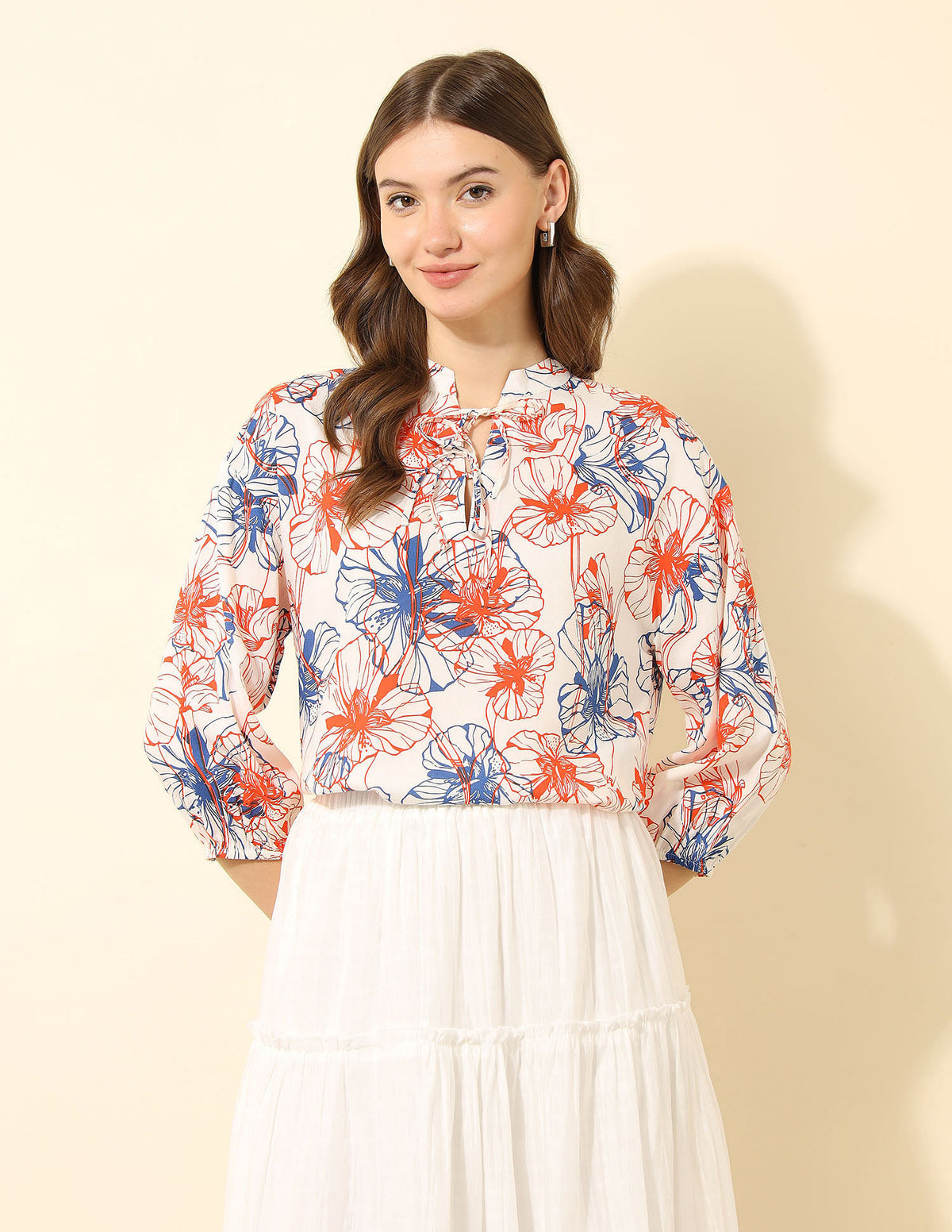 | Round neck | Tie-up closure at front | Short sleeves | Straight hemline | Floral printed pattern | Regular fit |