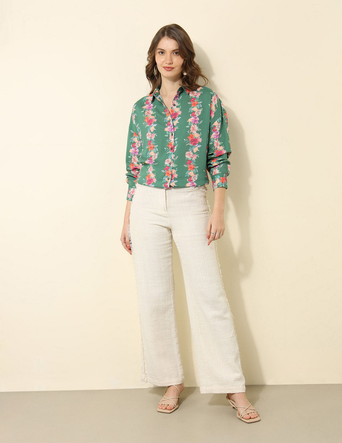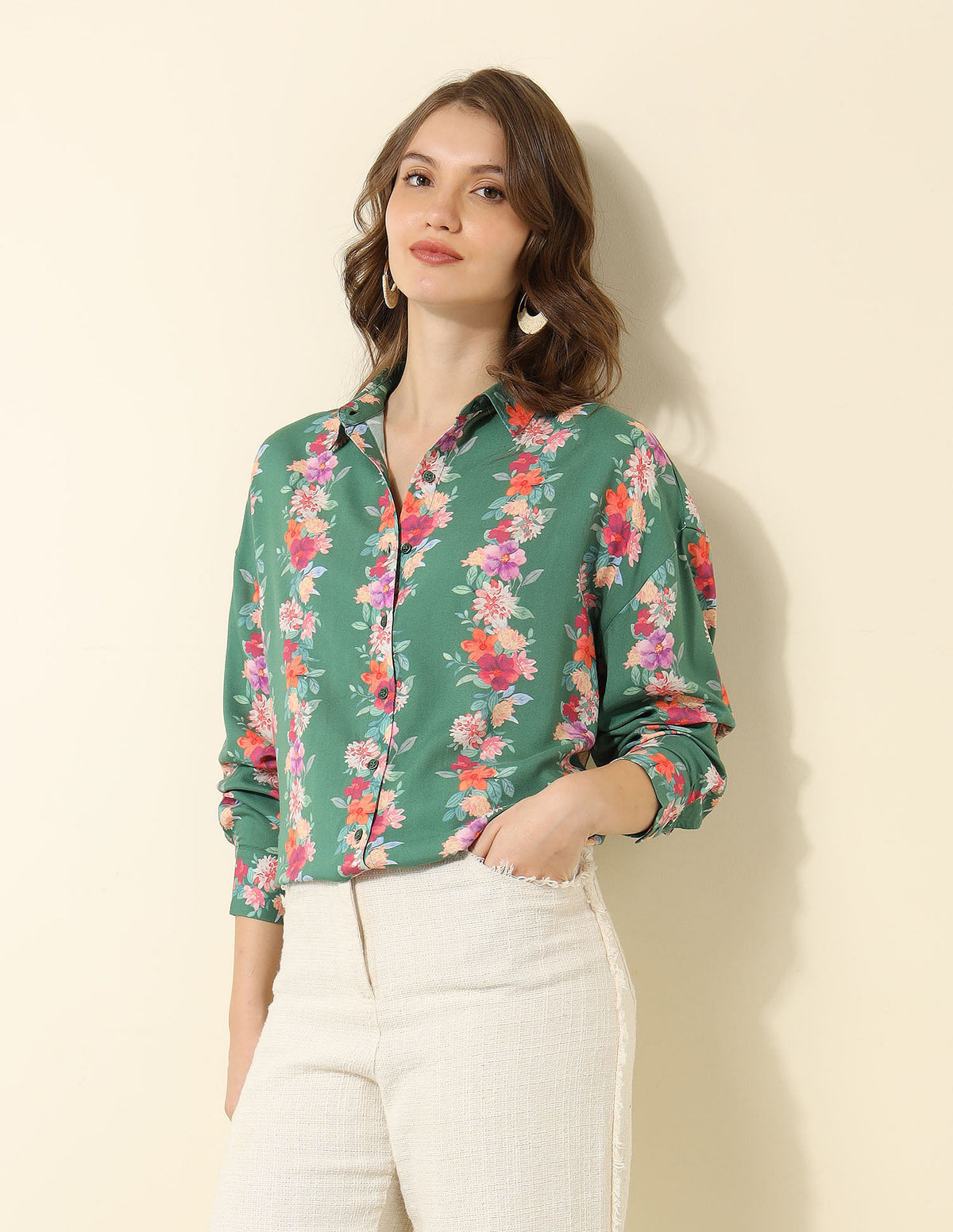 | Spread collar | Full button placket | Long sleeves with Barrel cuffs | Curved hemline | Floral pattern | Regular weave | Regular fit |