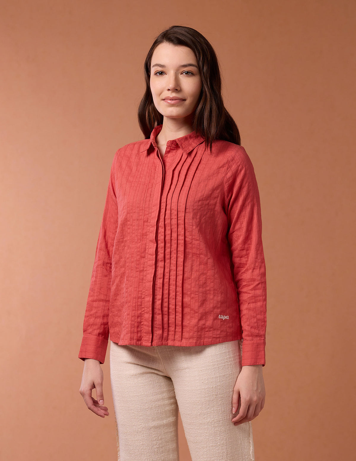 | Spread collar | Full button placket | Pin tuck detailing at front | Long sleeves with barrel cuffs | Curved hemline | Patterned dobby weave | Regular fit