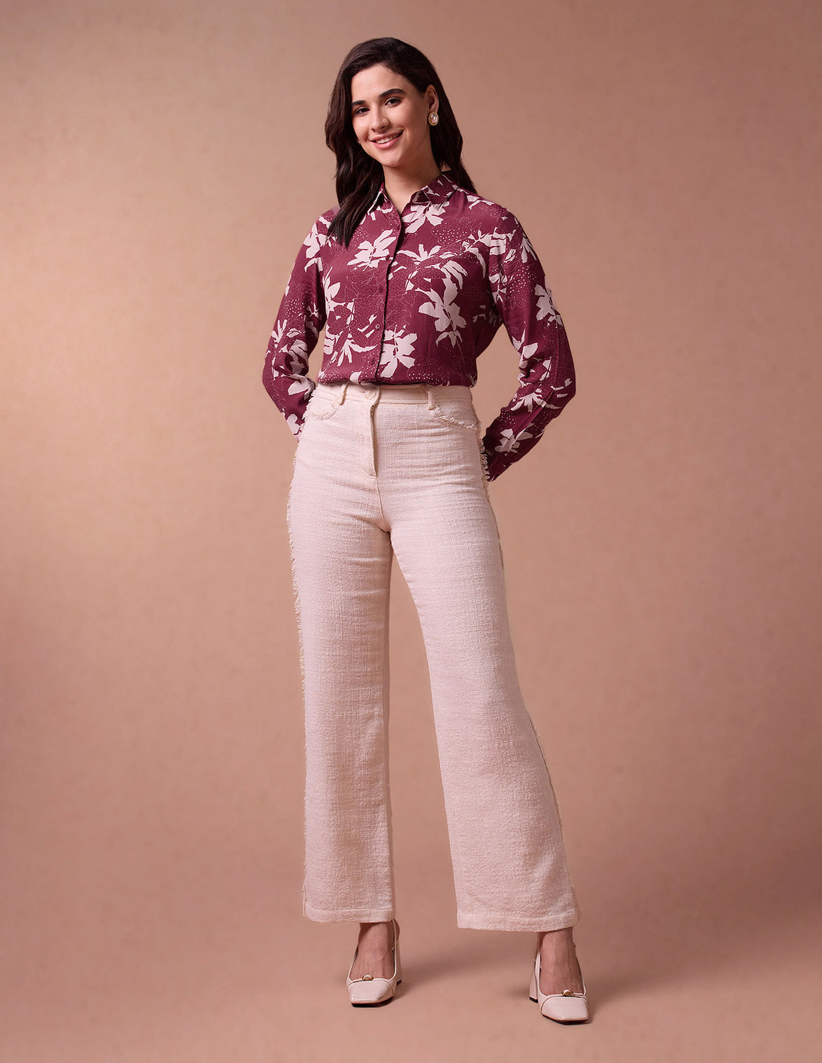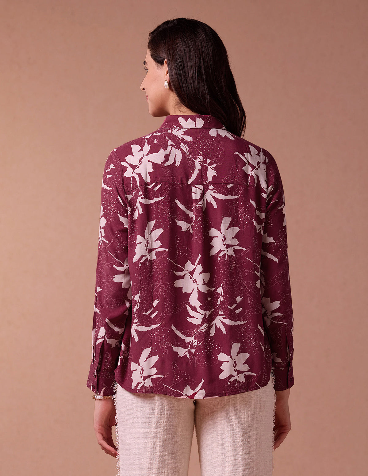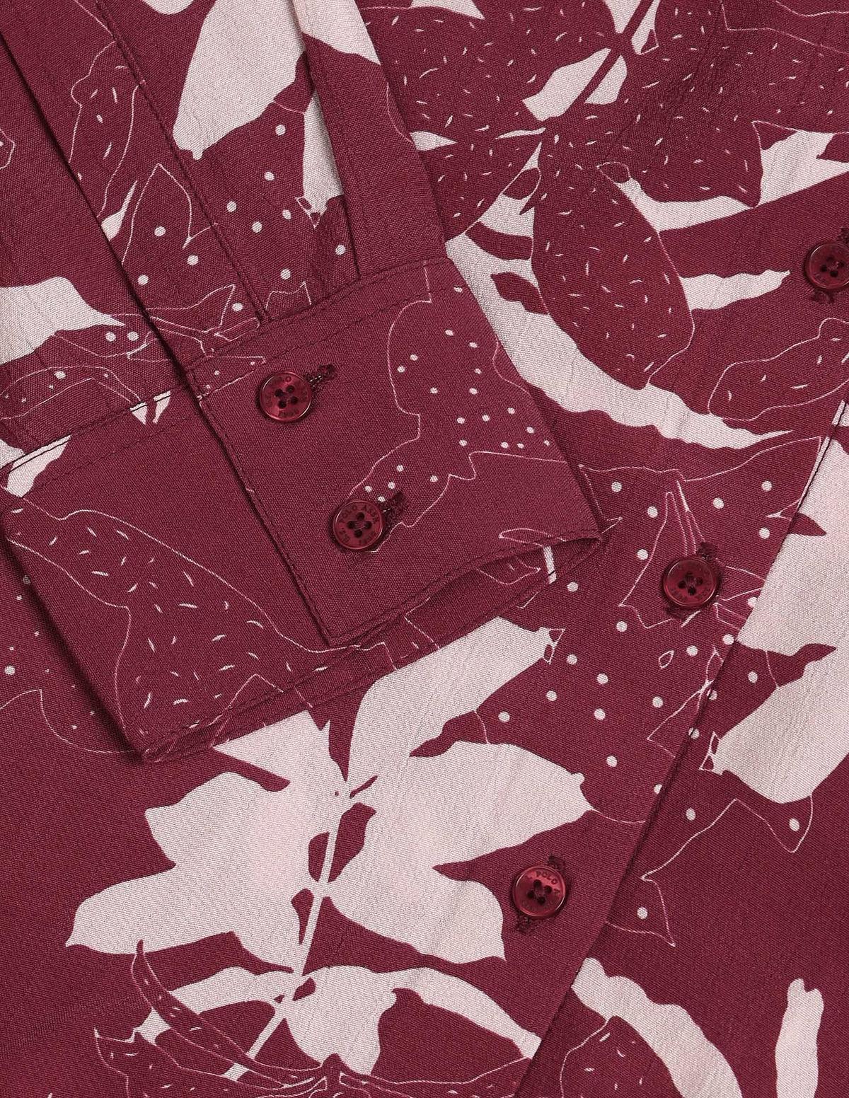 | Spread collar | Full button placket | Long sleeves with barrel cuffs | Curved hemline | Floral printed pattern | Regular weave | Relaxed fit