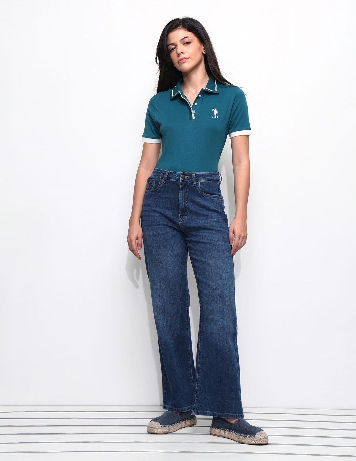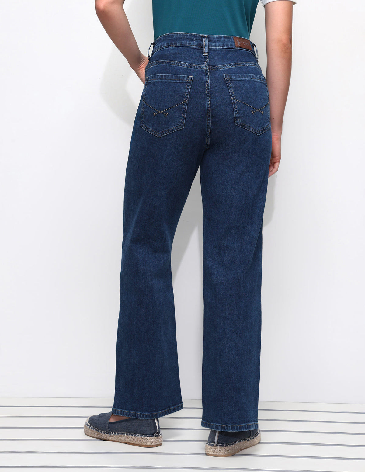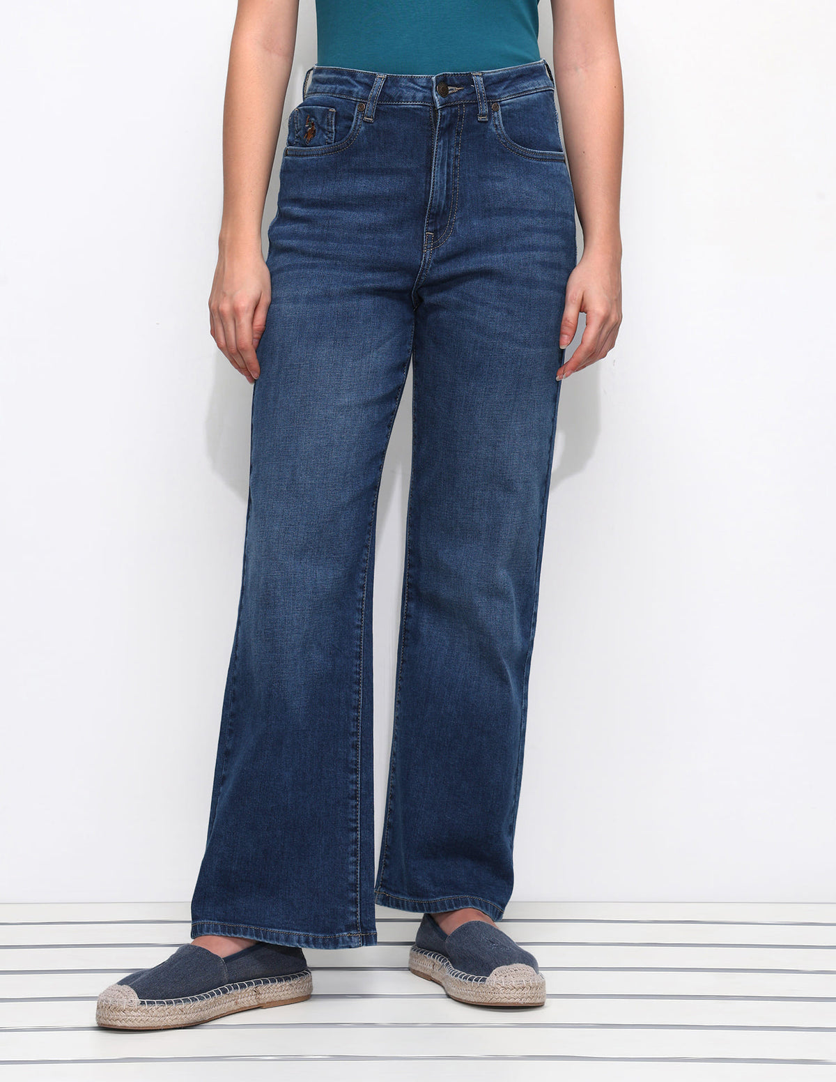 | High-rise waist | Button and zip fly closure | Five pockets | Whiskered | Denim weave | Wide leg fit