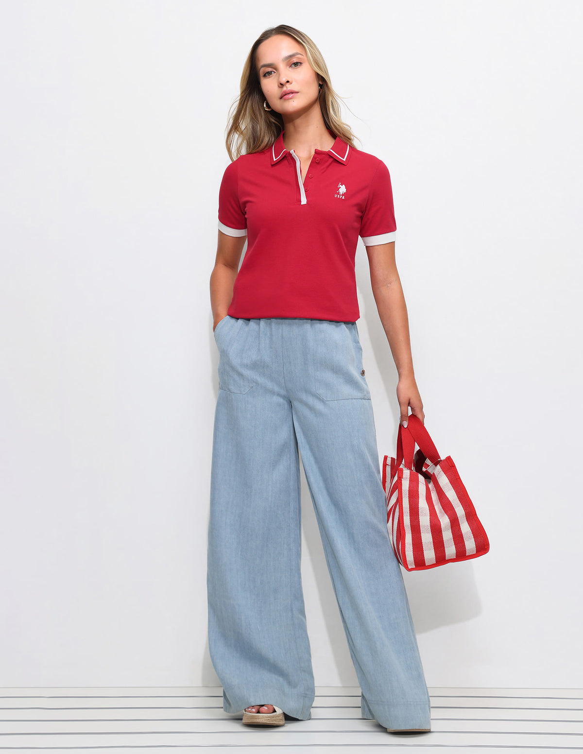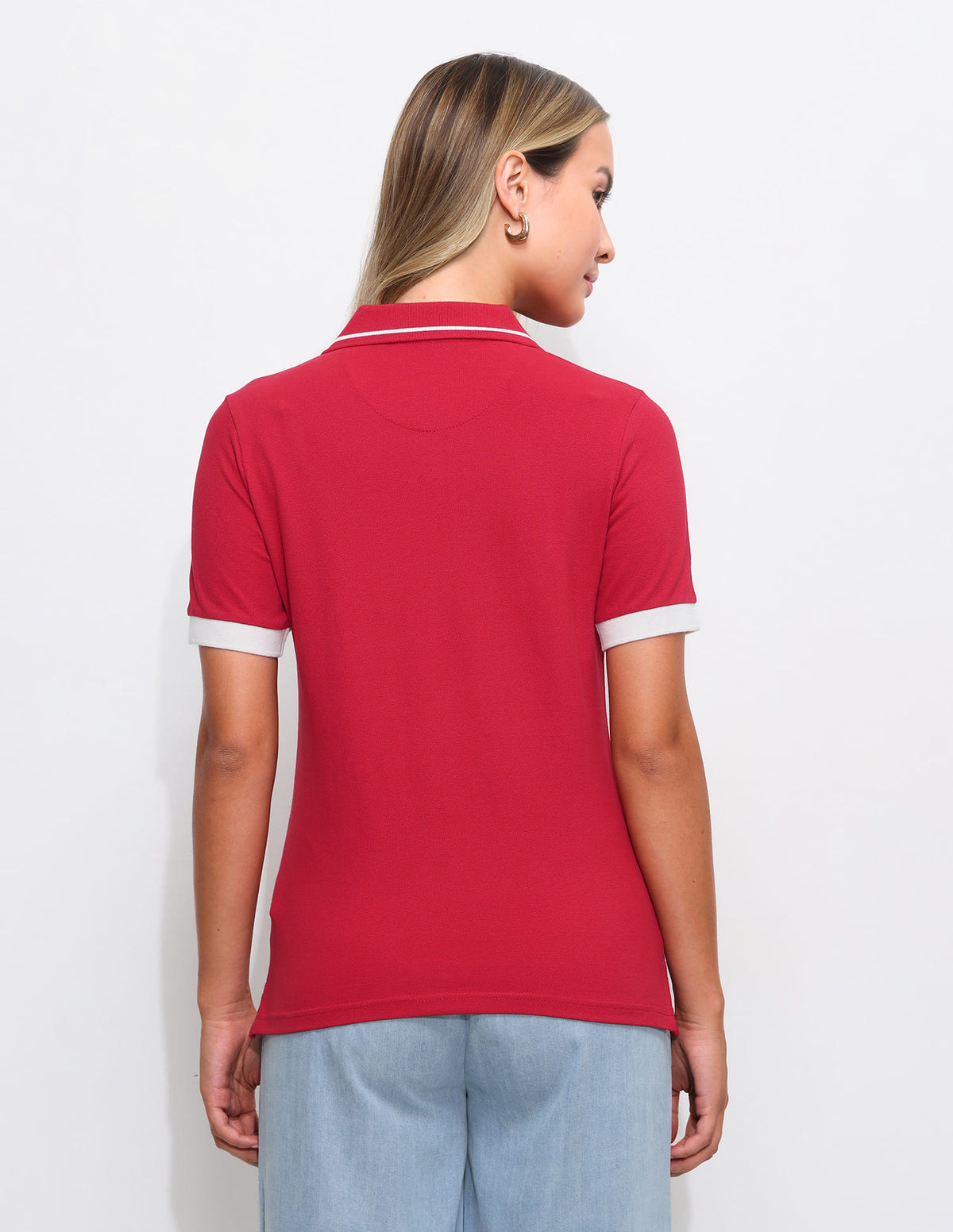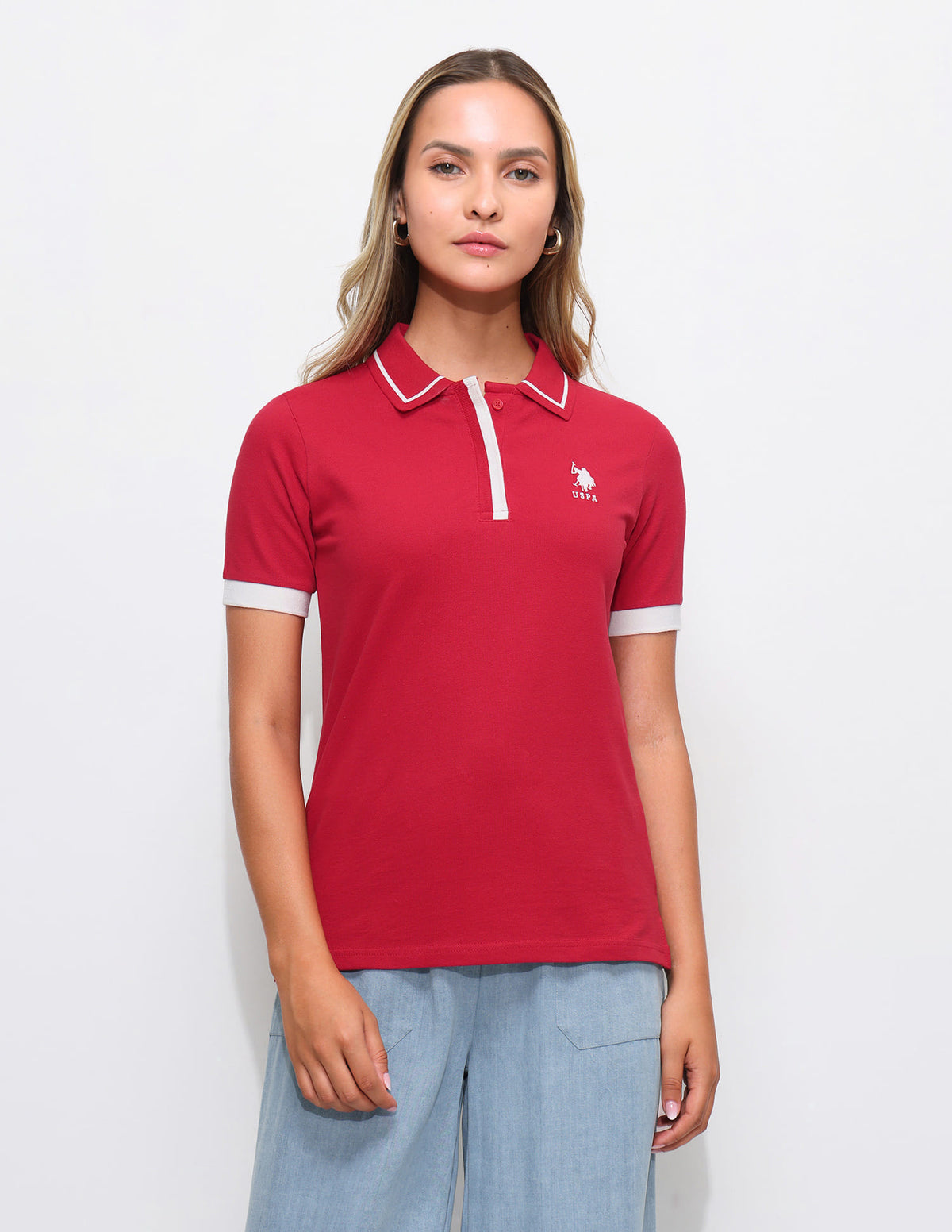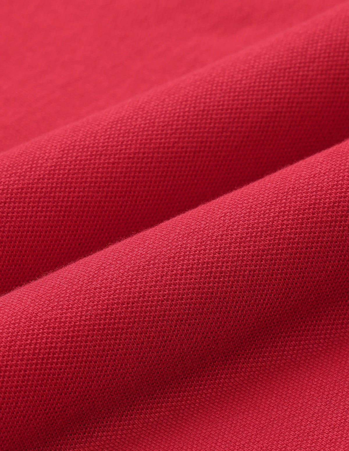 | Polo collar | Logo at chest | Short button placket | Short sleeves | Ribbed collar and sleeve hems | Even vented hem | Solid pattern | Pique knit | Regular fit