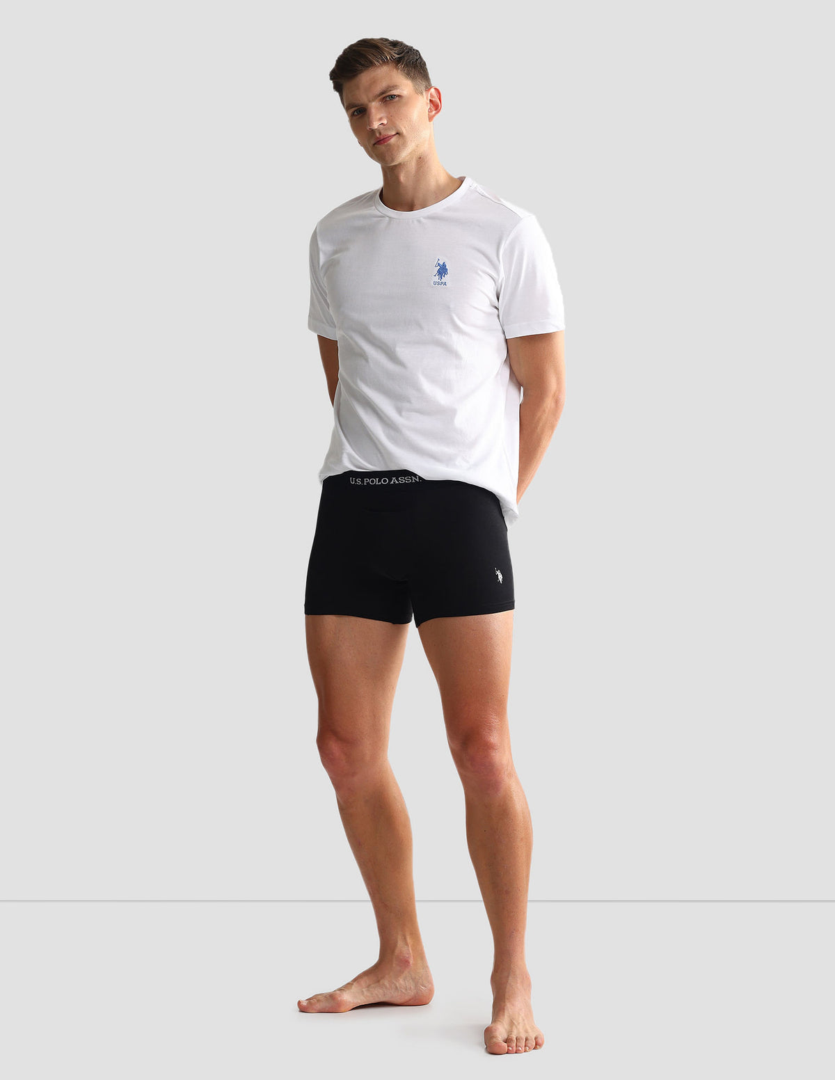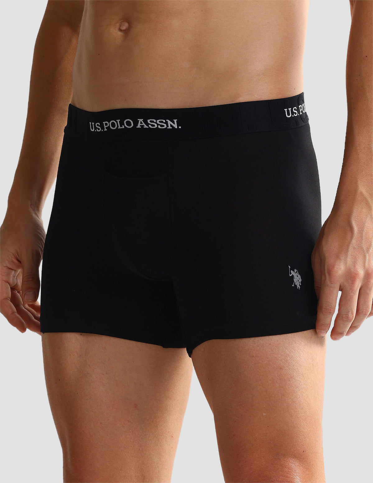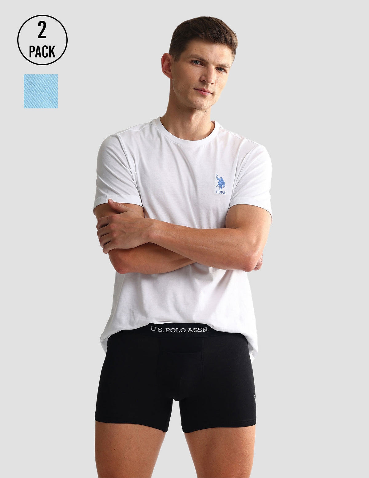 | Pack of 2: | Mid-rise sits comfortably at your waist | Soft stretch elasticised waistband with branding | Double-layered pouch provides enhanced support | Full front and rear coverage | Elastane ribbed with logo at hem | Solid pattern | One is heathered pattern | Country Of Origin - India