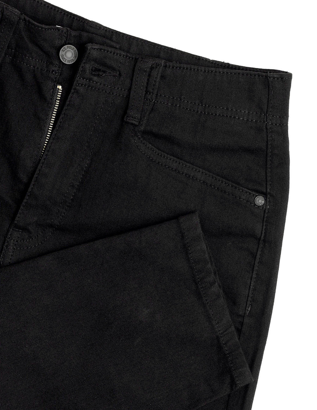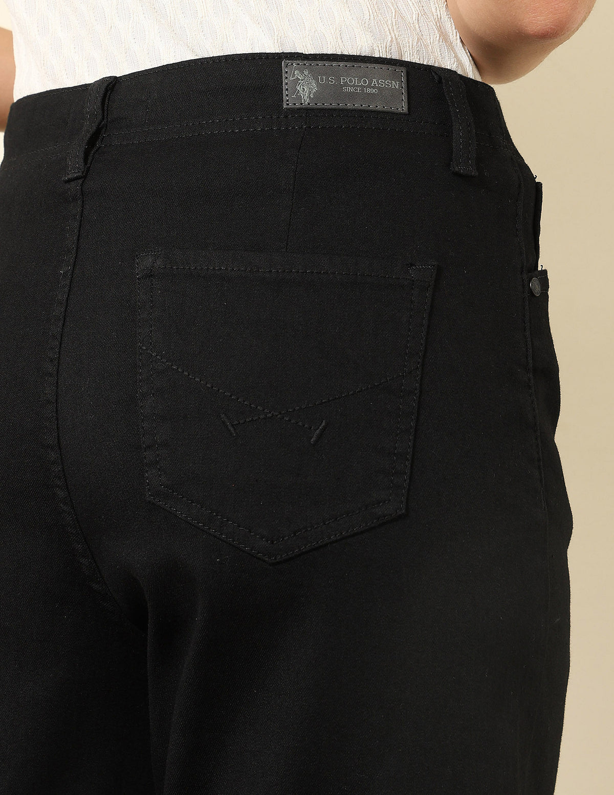 | High-rise waist | Button and zip fly closure | Five pockets | Denim weave | Carrot fit |