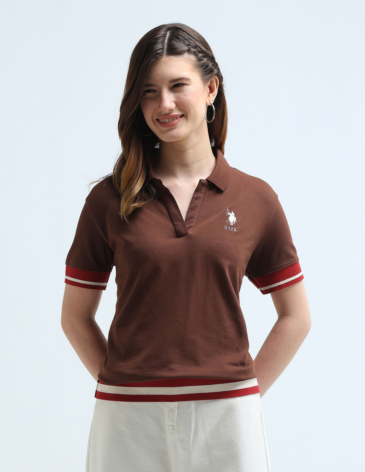 | Polo collar | Embroidered logo at chest | Open placket | Short sleeves | Ribbed and tipped sleeve hems and hemline | Straight hem | Solid pattern | Pique knit | Boxy fit