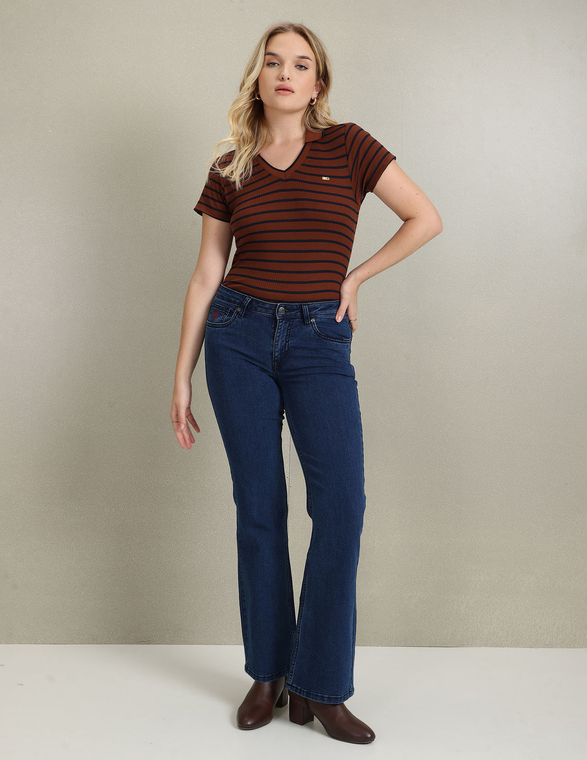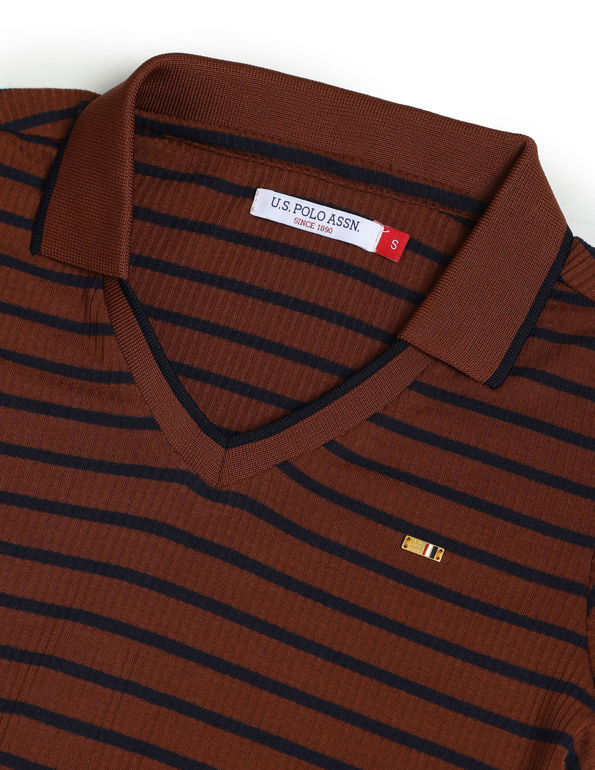 - Ribbed and tipped v-neck with polo collar