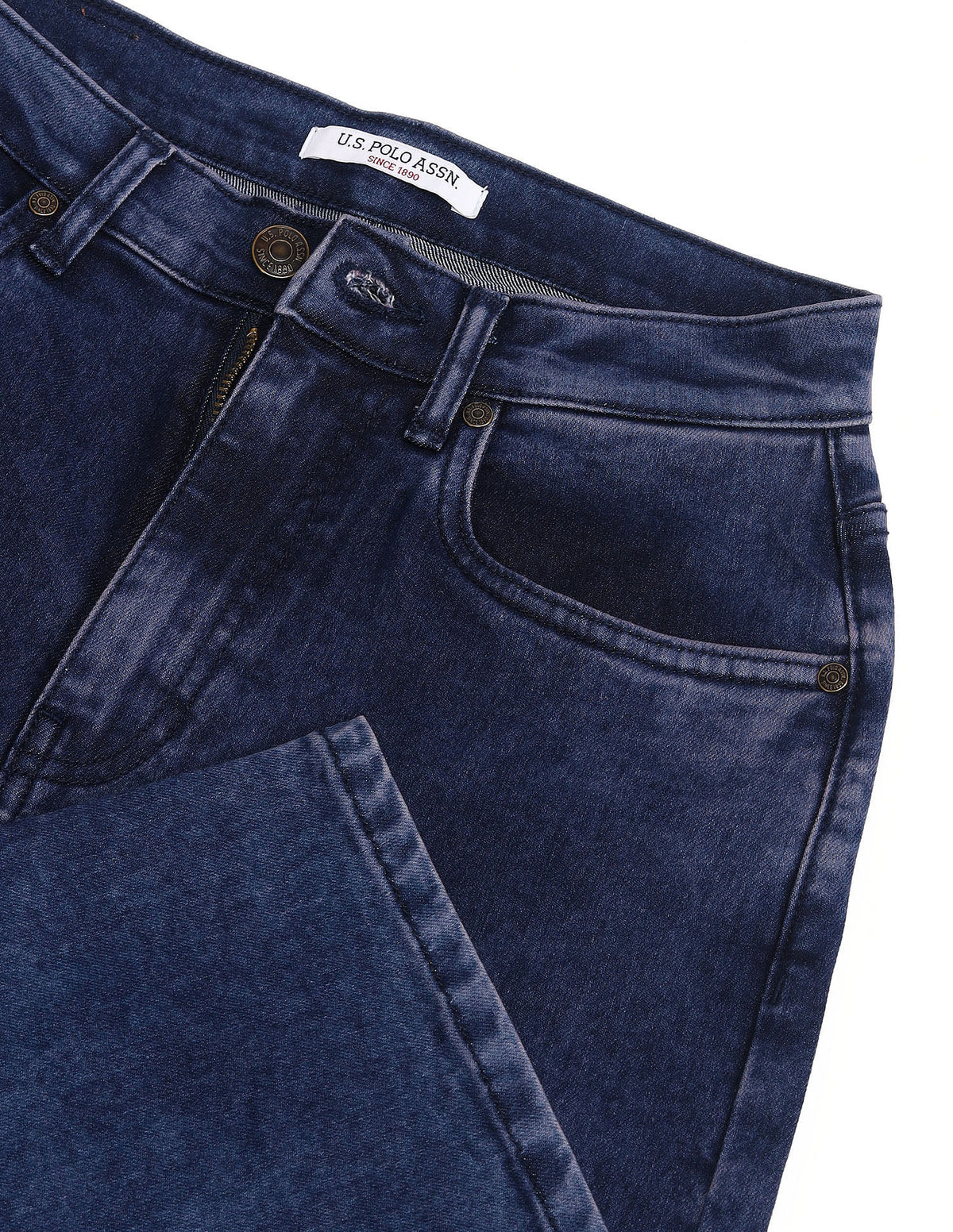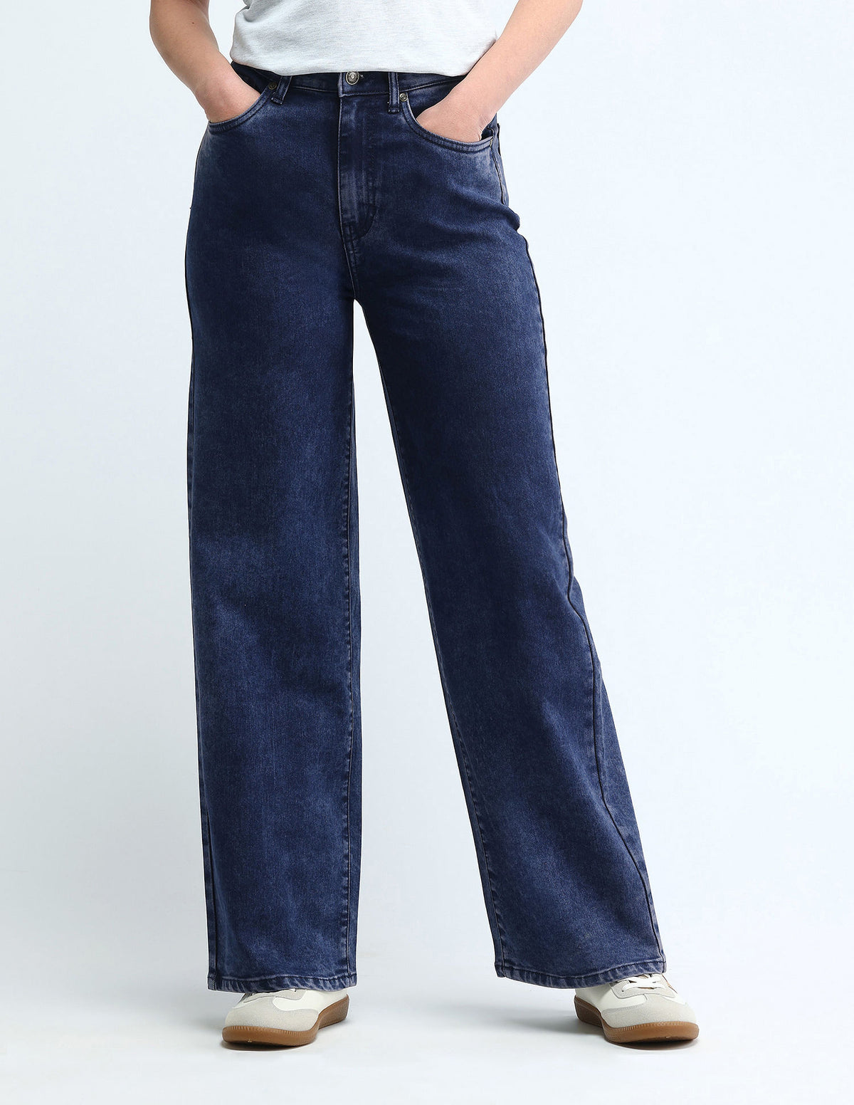 High-rise waist | Button and zip fly closure | Five pockets | Dark washed | Clean look | Denim weave | Wide leg fit |