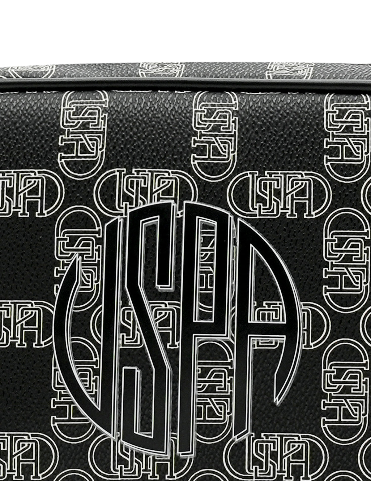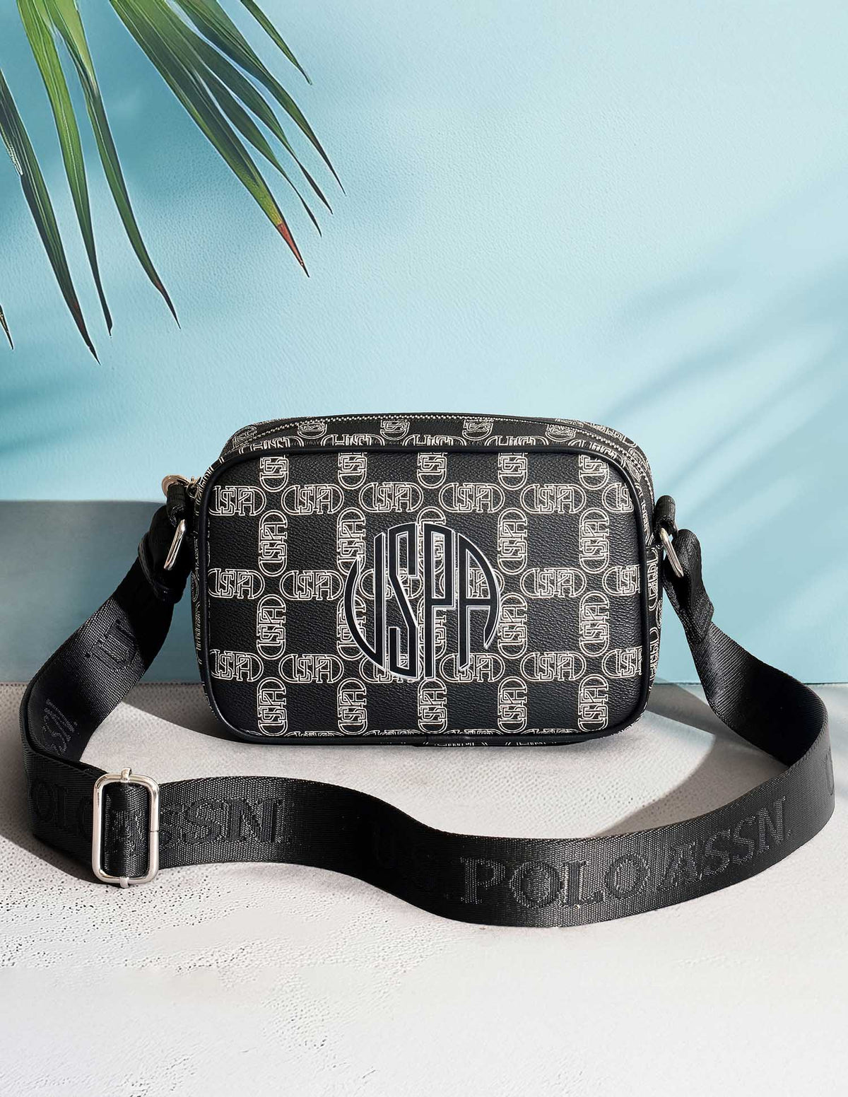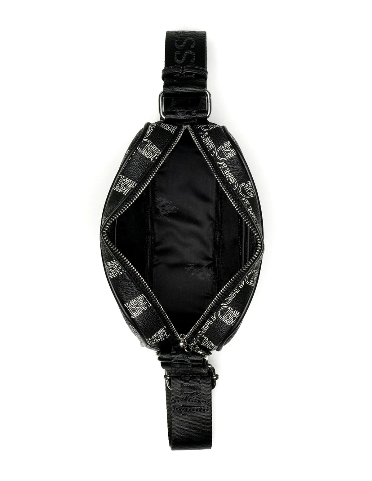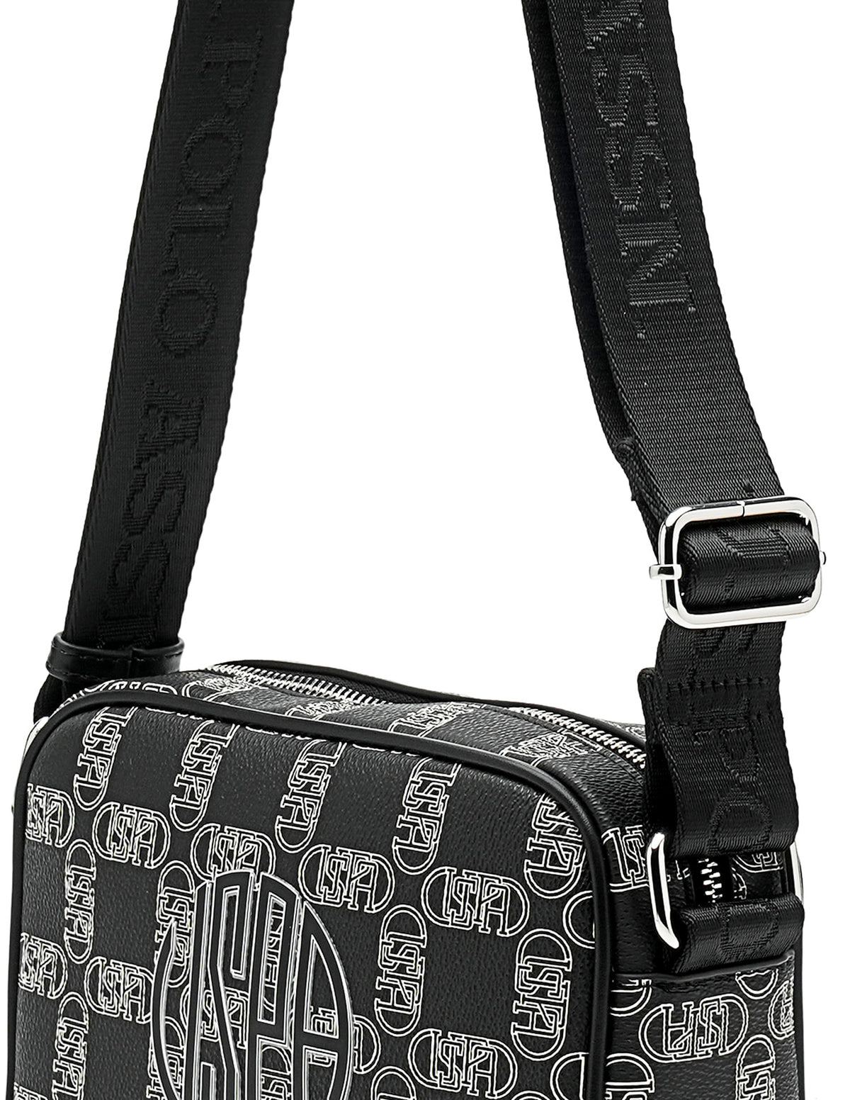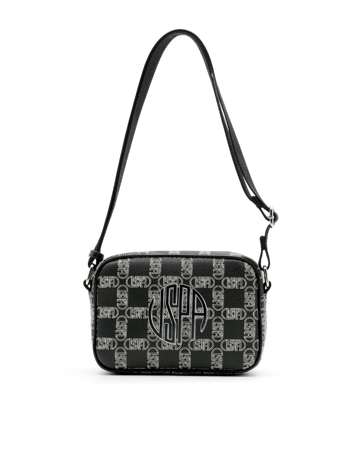 | Adjustable shoulder strap | Metallic logo accent at front | One main compartment with zipper closure | Brand printed pattern |