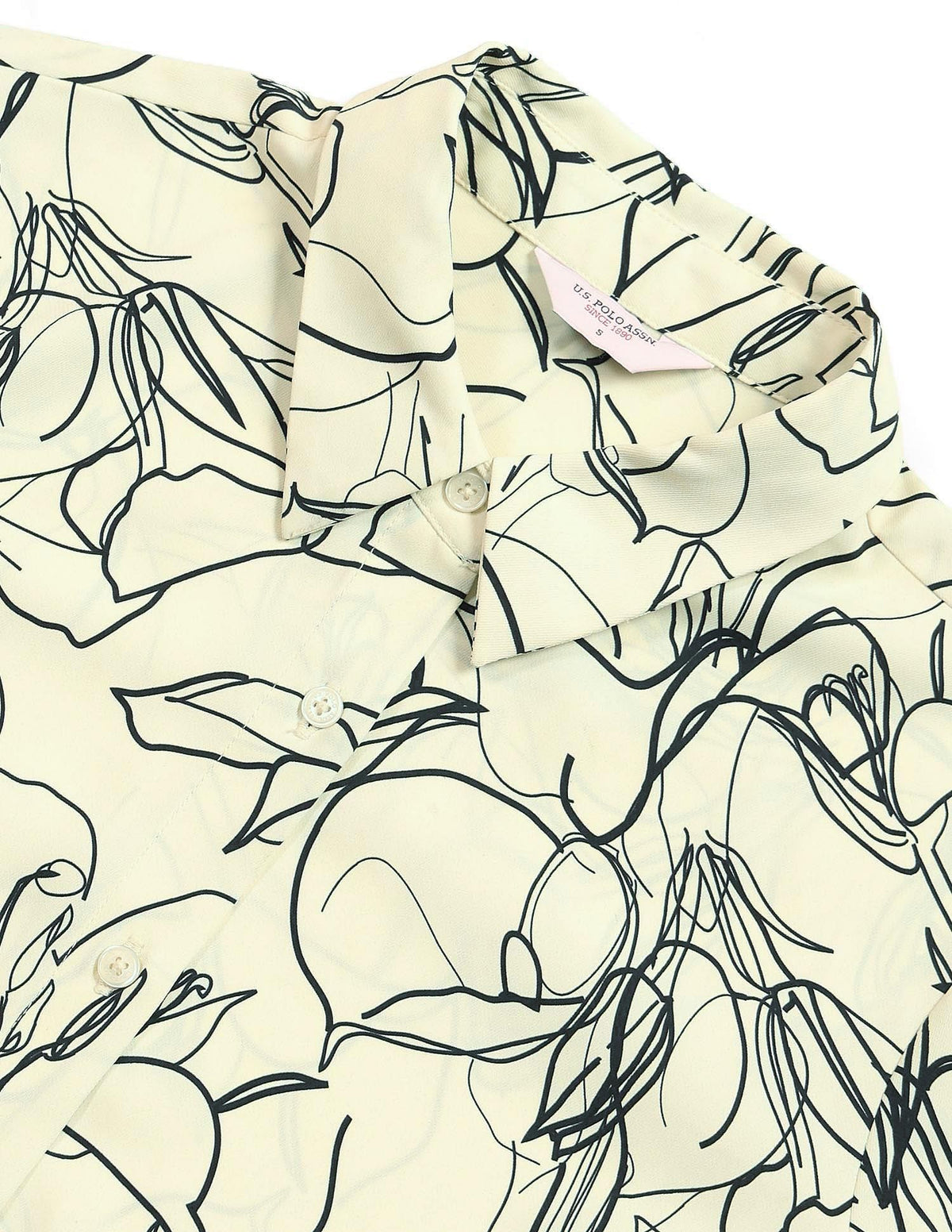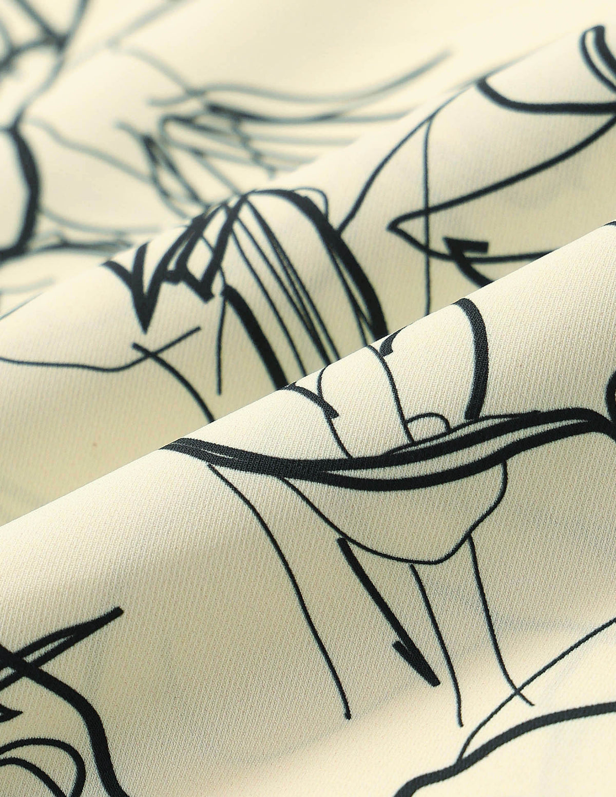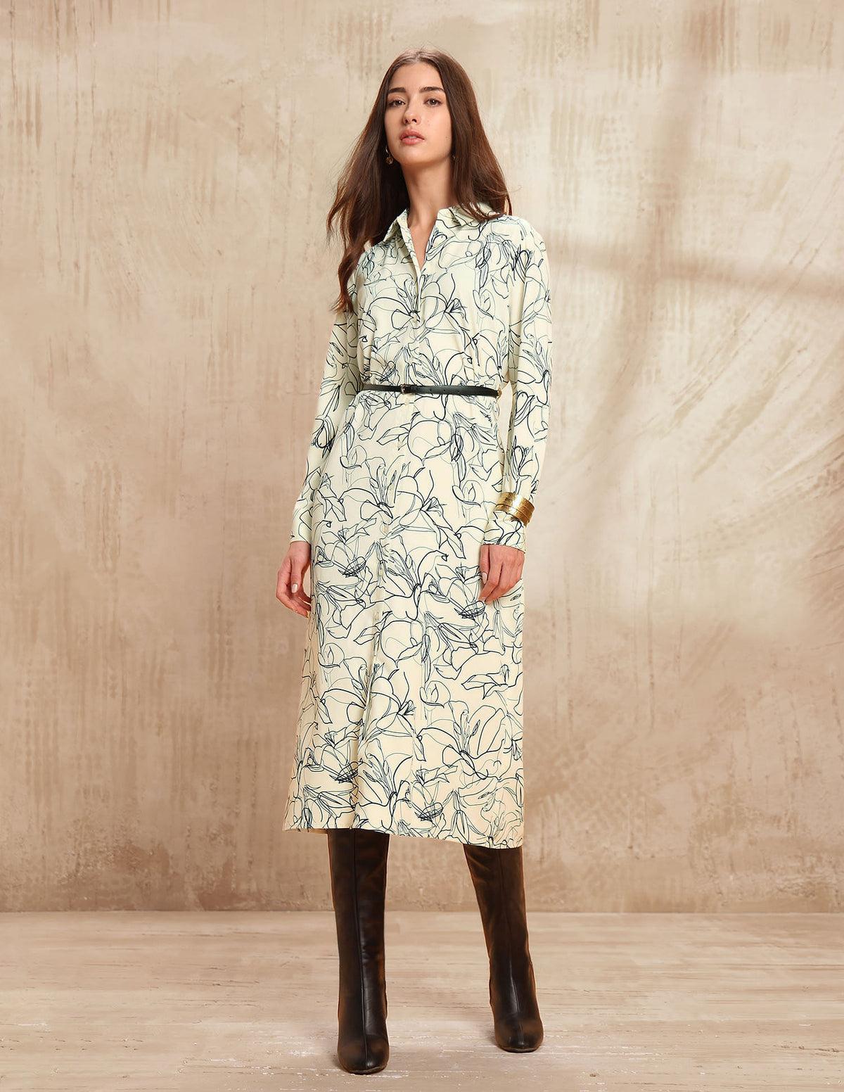 | Spread collar | Long sleeves | Abstract printed pattern | Midi length |