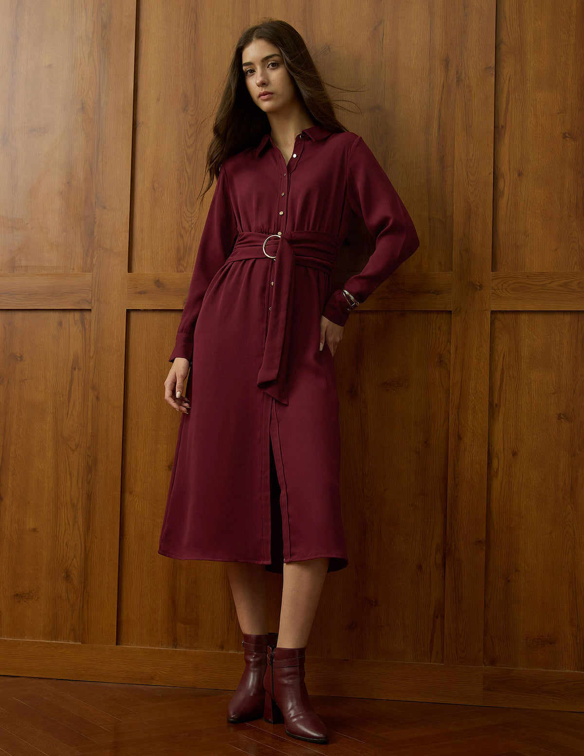 | Shirt collar | Full button placket | Full sleeve | Solid pattern | Shirt dress |