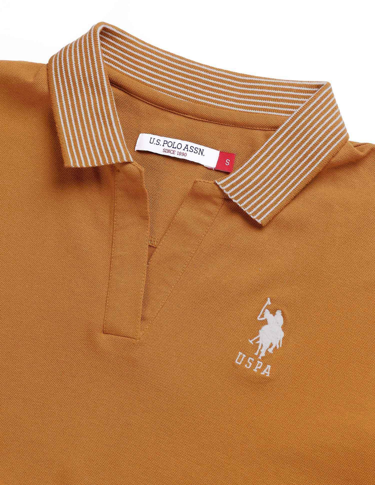 | Polo collar | Logo at chest | Open placket | Short sleeves | Ribbed collar and sleeve hems | Uneven vented hem | Solid pattern | Pique knit | Boxy fit |