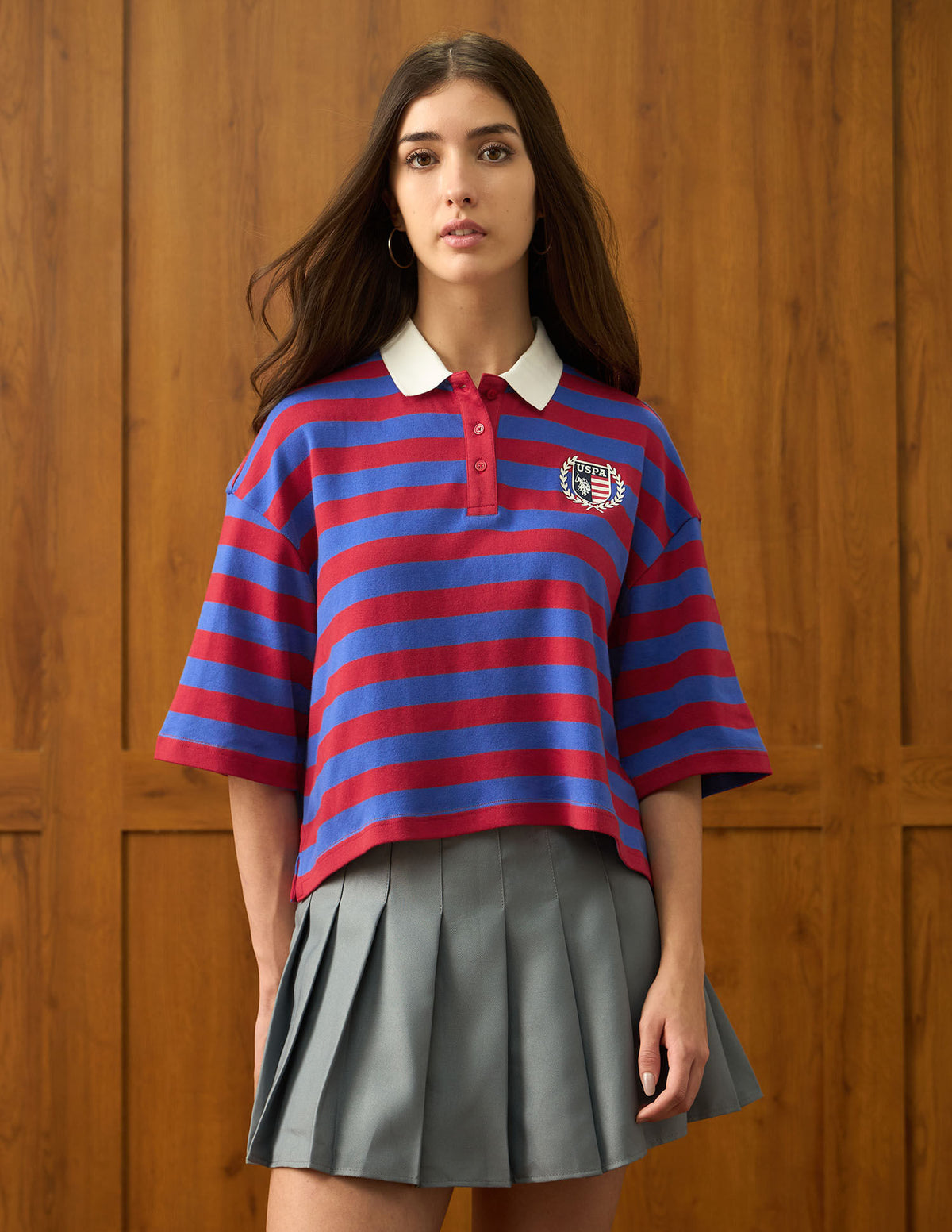 | Polo collar | Logo at chest | Short button placket | Short sleeves | Ribbed collar and sleeve hems | Uneven vented hem | Horizontal striped pattern | Pique knit | Regular fit |