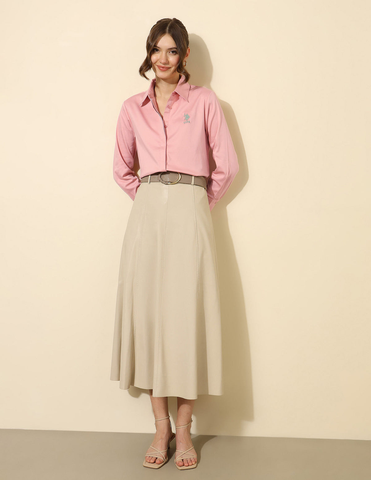 | Spread collar | Logo at chest | Full concealed button placket | Long sleeves with barrel cuffs | Curved hemline | Solid pattern | Satin weave | Regular fit |