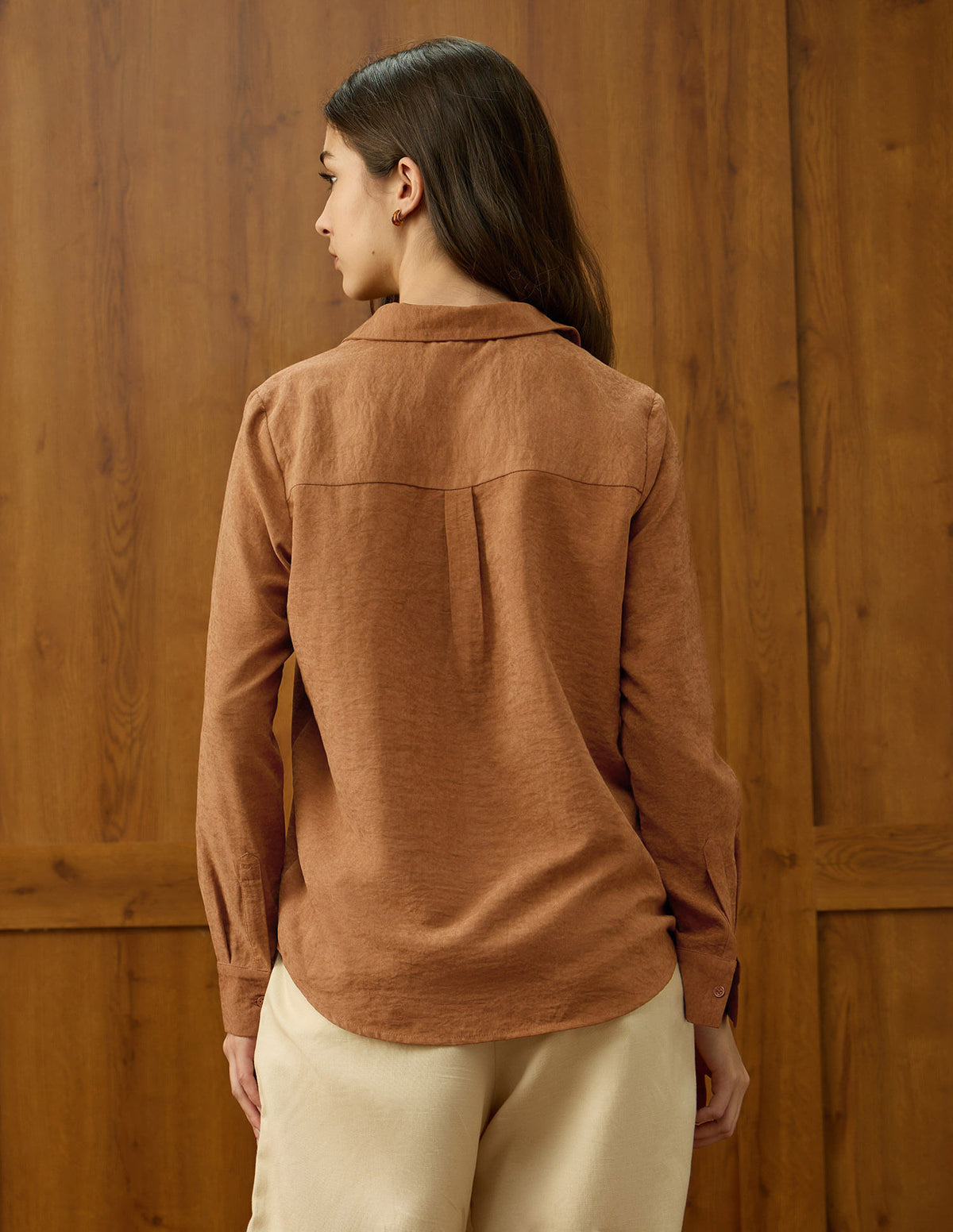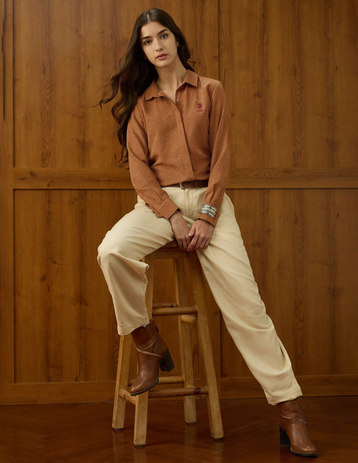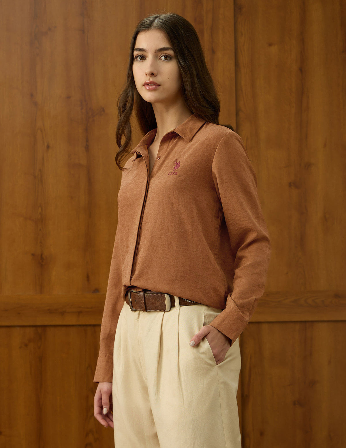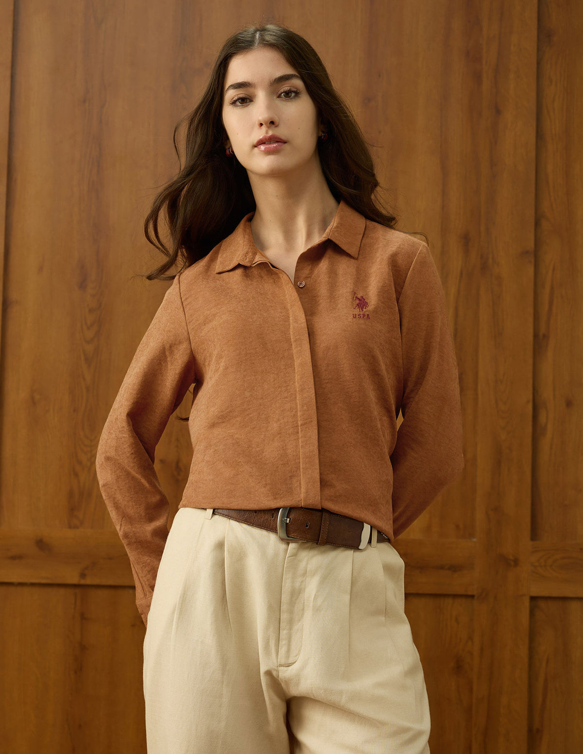 | Spread collar | Logo at chest | Full concealed button placket | Long sleeves with barrel cuffs | Curved hemline | Solid pattern | Regular fit |
