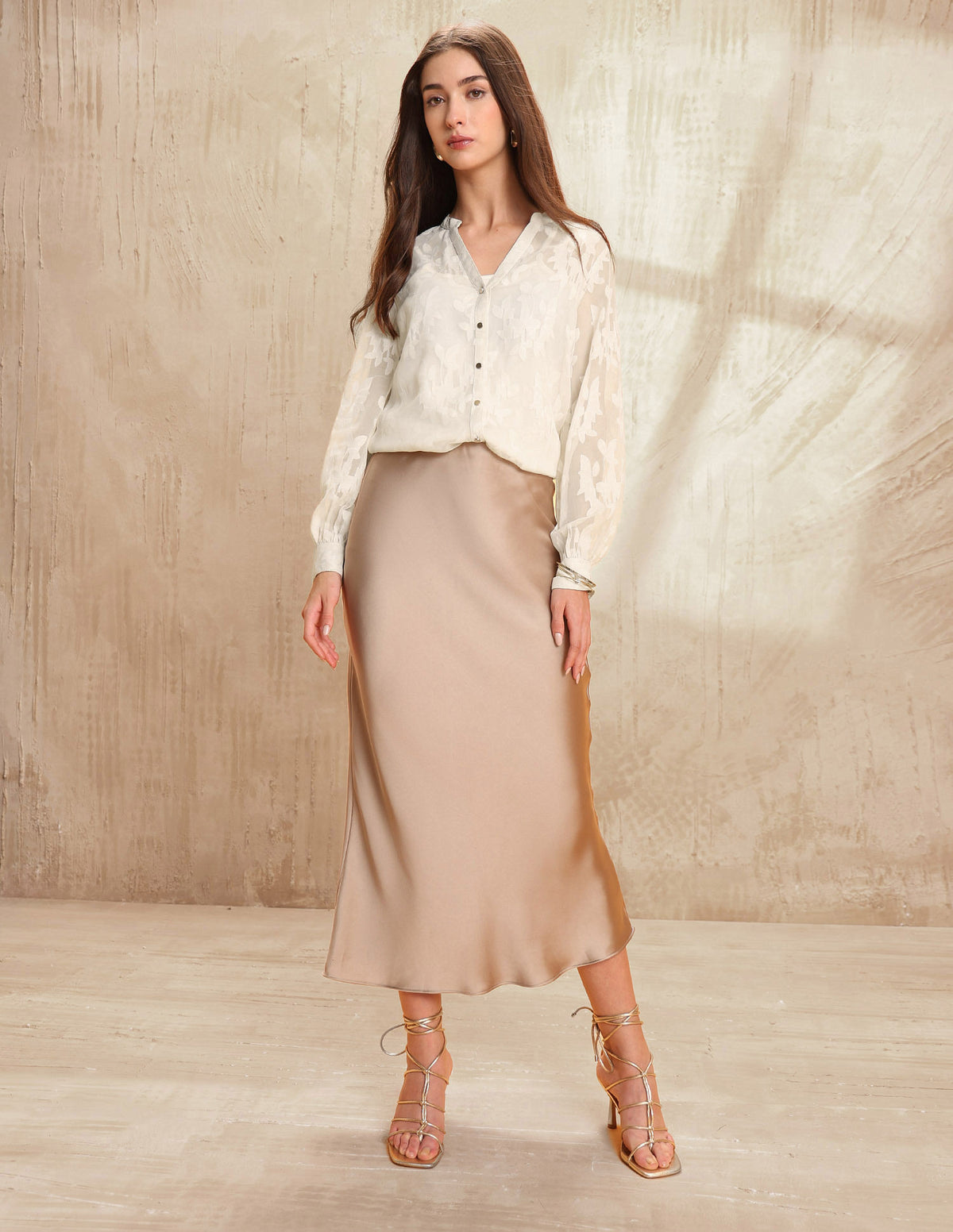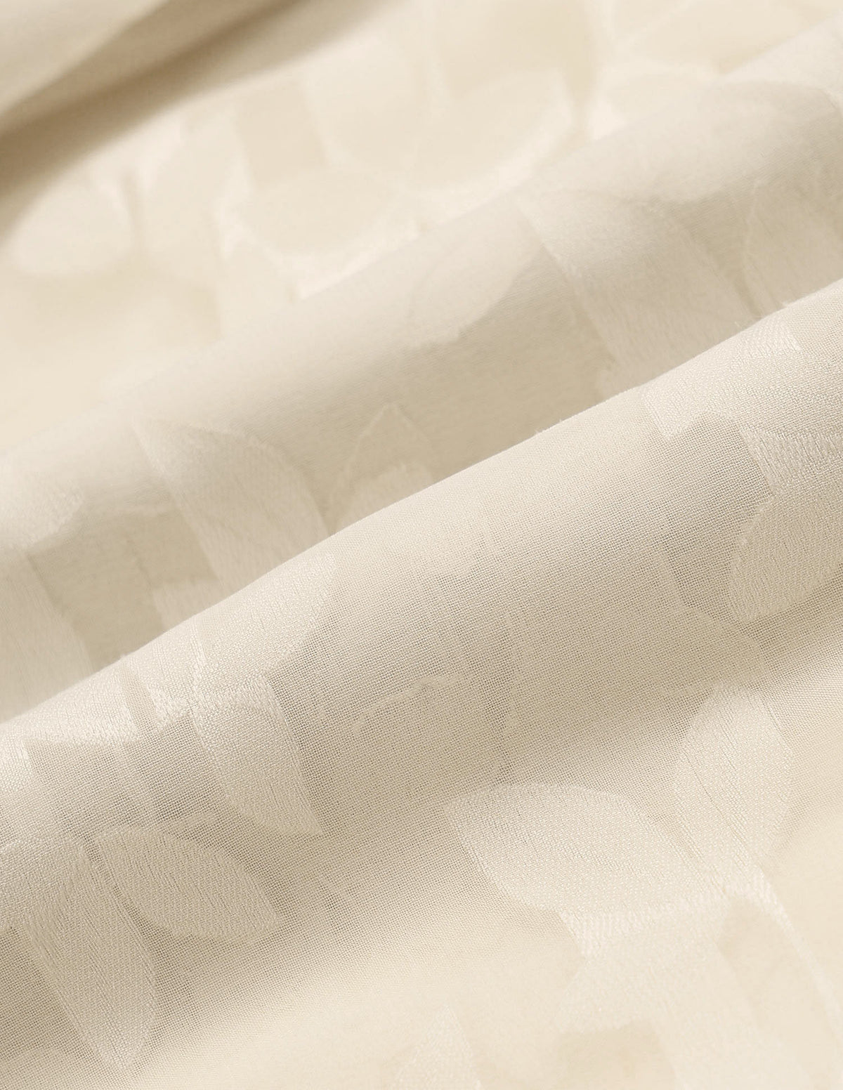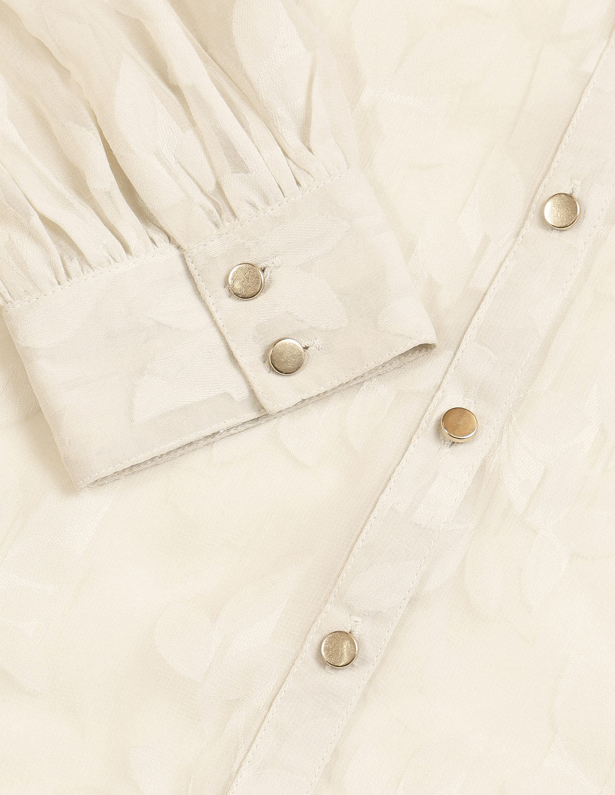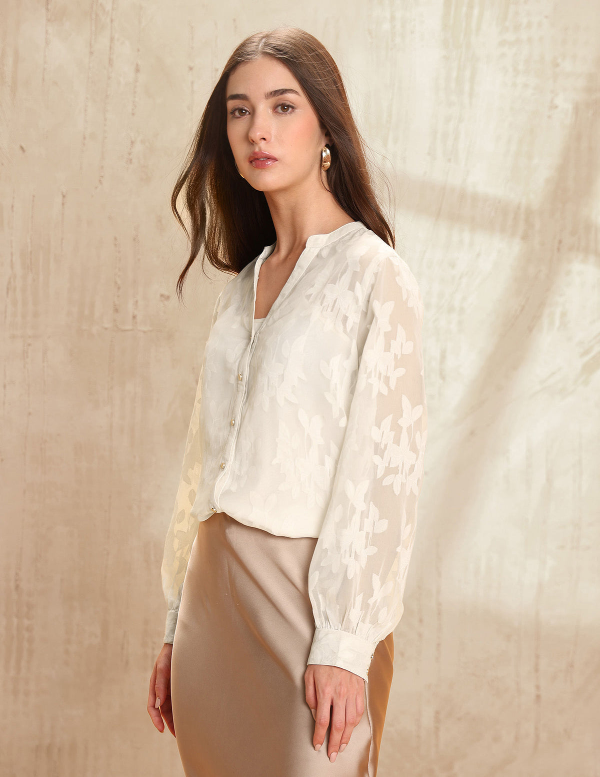 | Mandarin collar | Full button placket | Long sleeves with barrel cuffs | Curved hemline | Floral self design pattern | Regular weave | Regular fit |