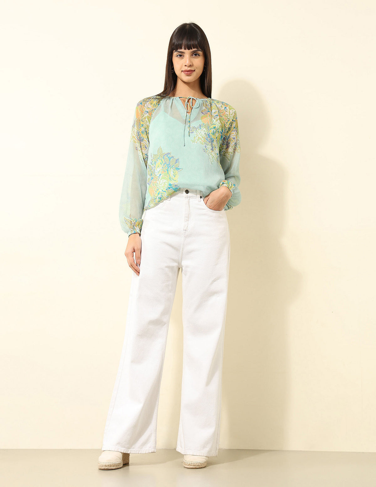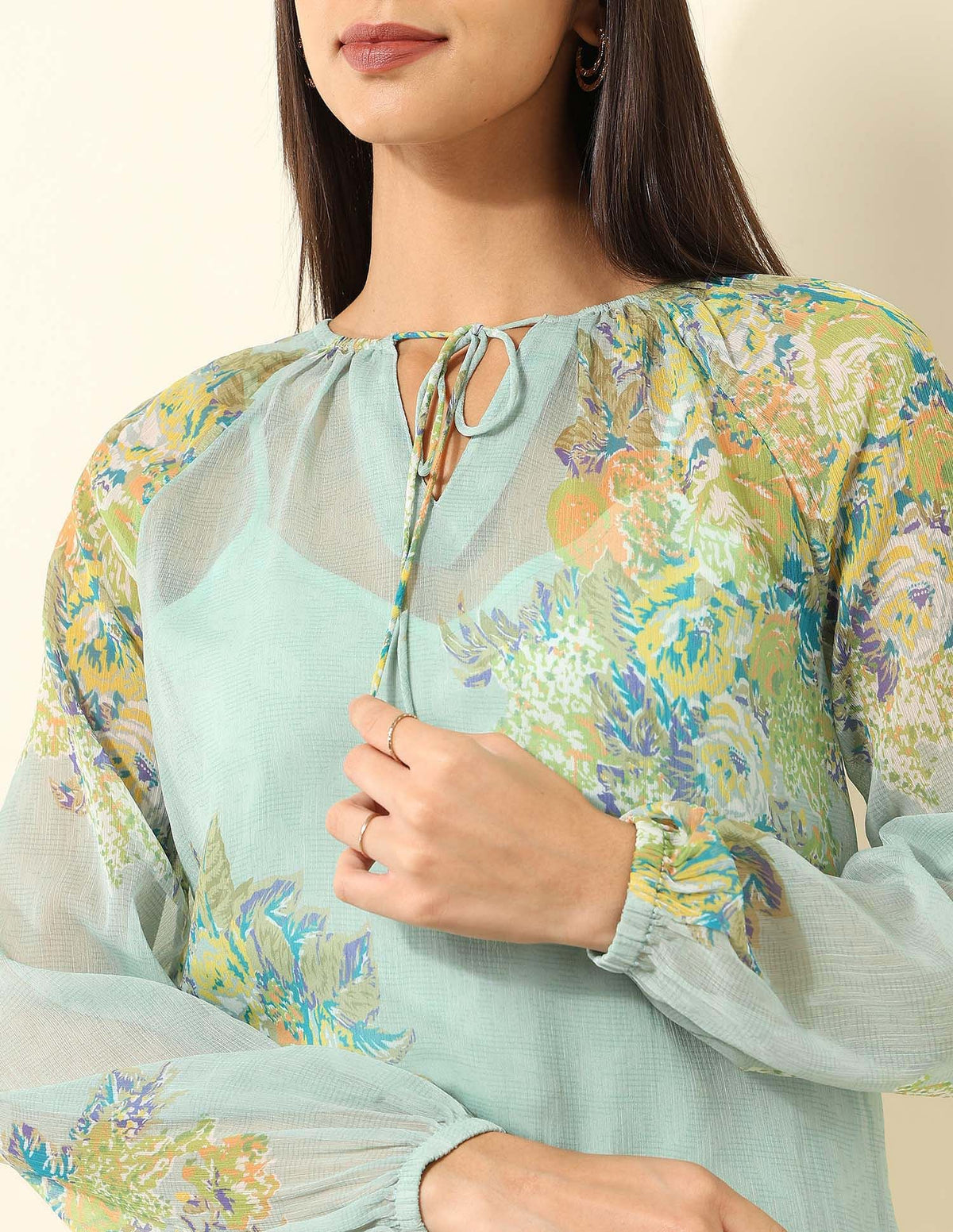 | Round neck with tie-up details | Long sleeves with elasticized hems | Straight hemline | Abstract printed pattern | Regular weave | Regular fit |