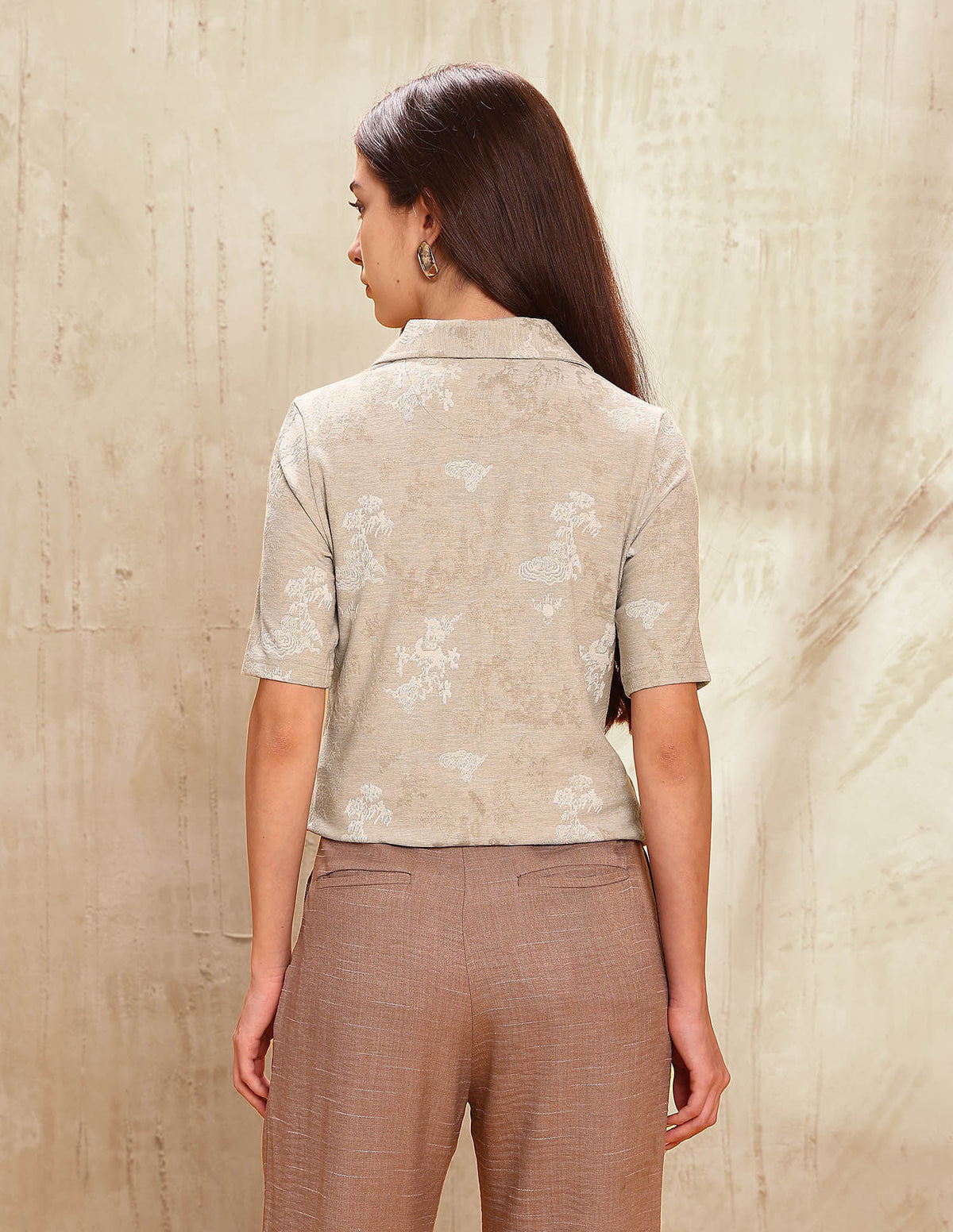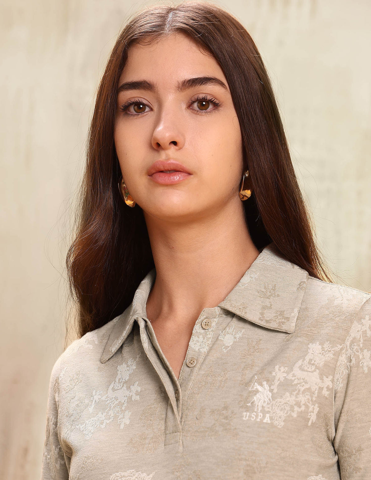 | Polo collar | Logo at chest | Short concealed button placket | Short sleeves | Ribbed collar and sleeve hems | Uneven vented hem | Floral self design pattern | Pique knit | Regular fit |