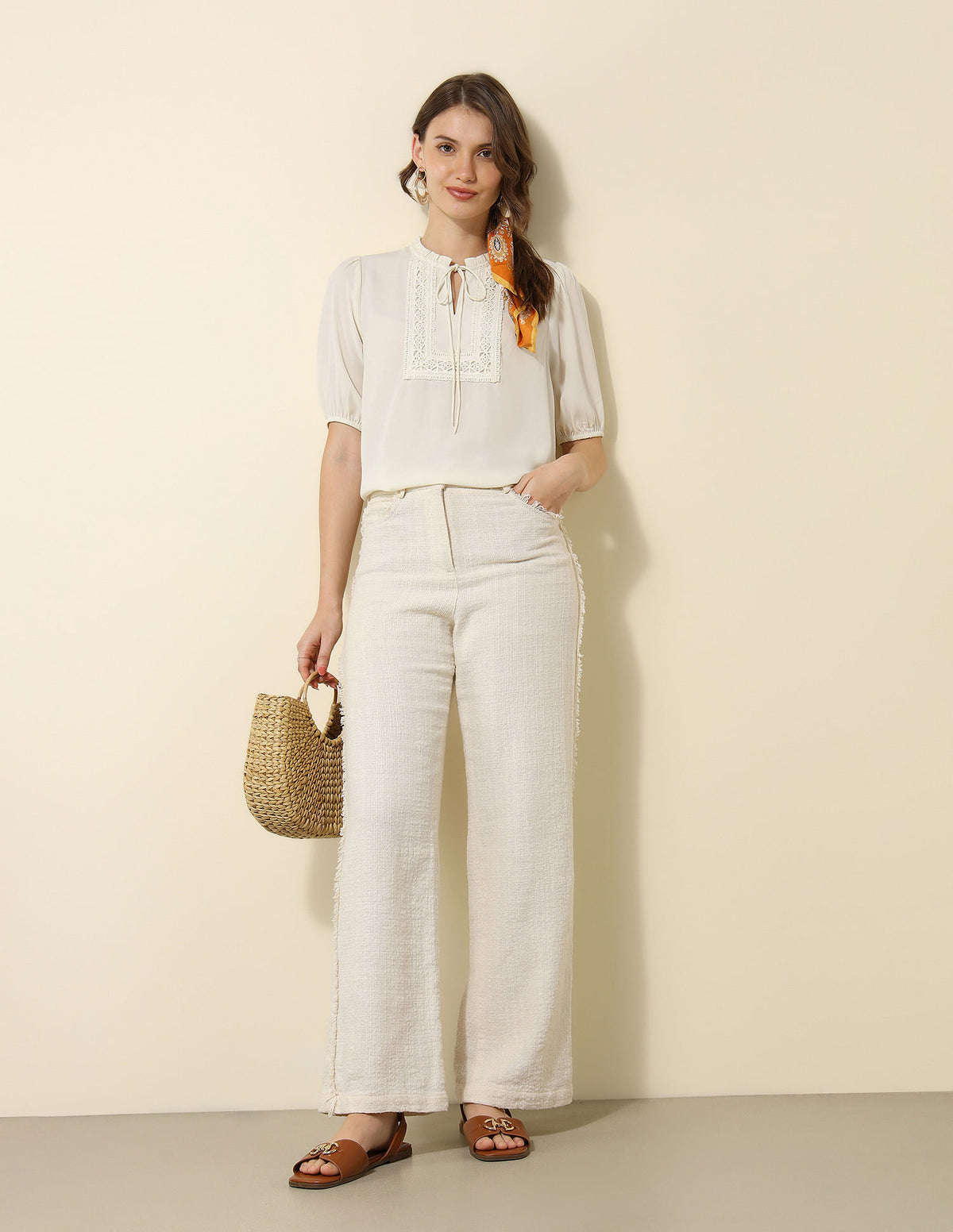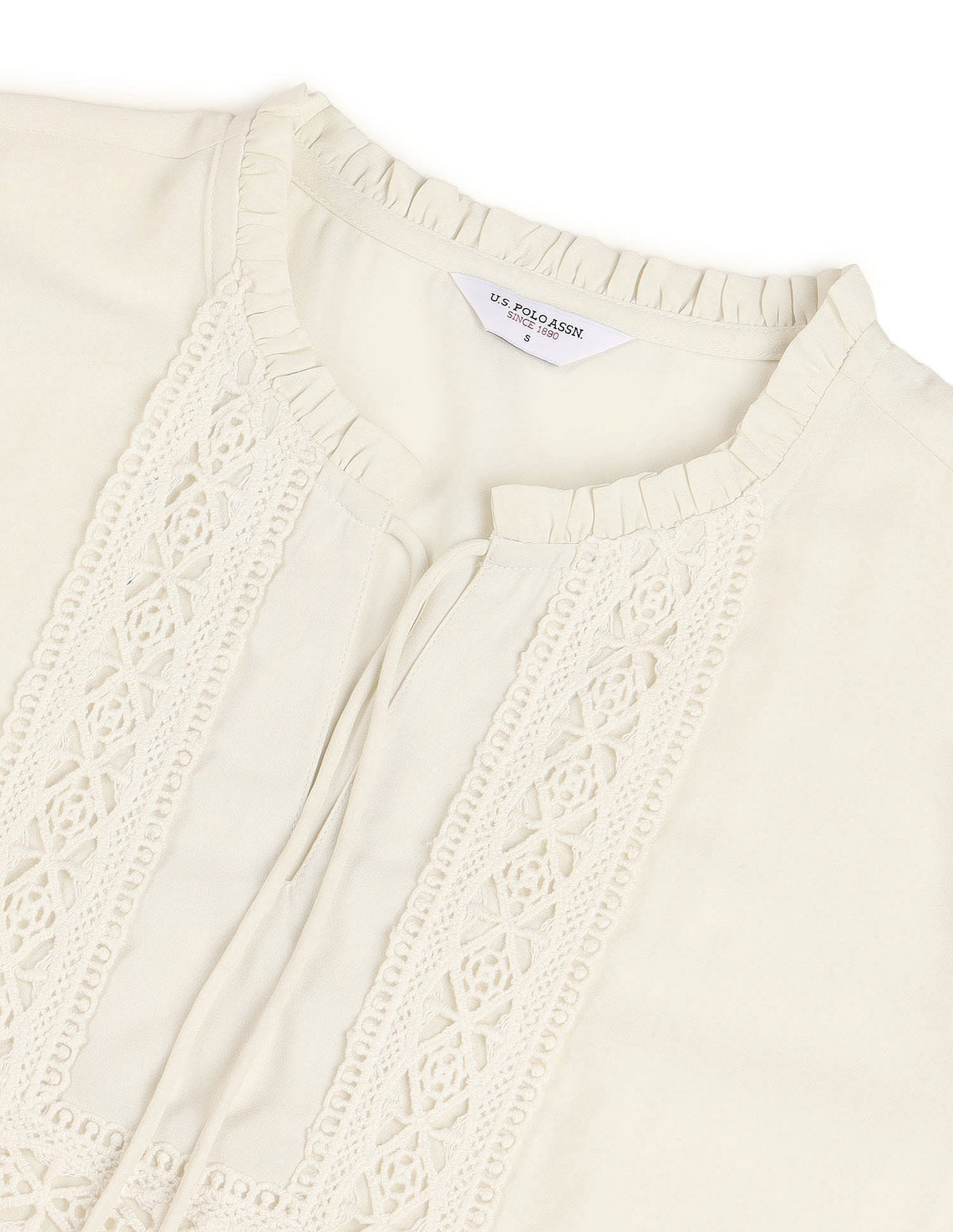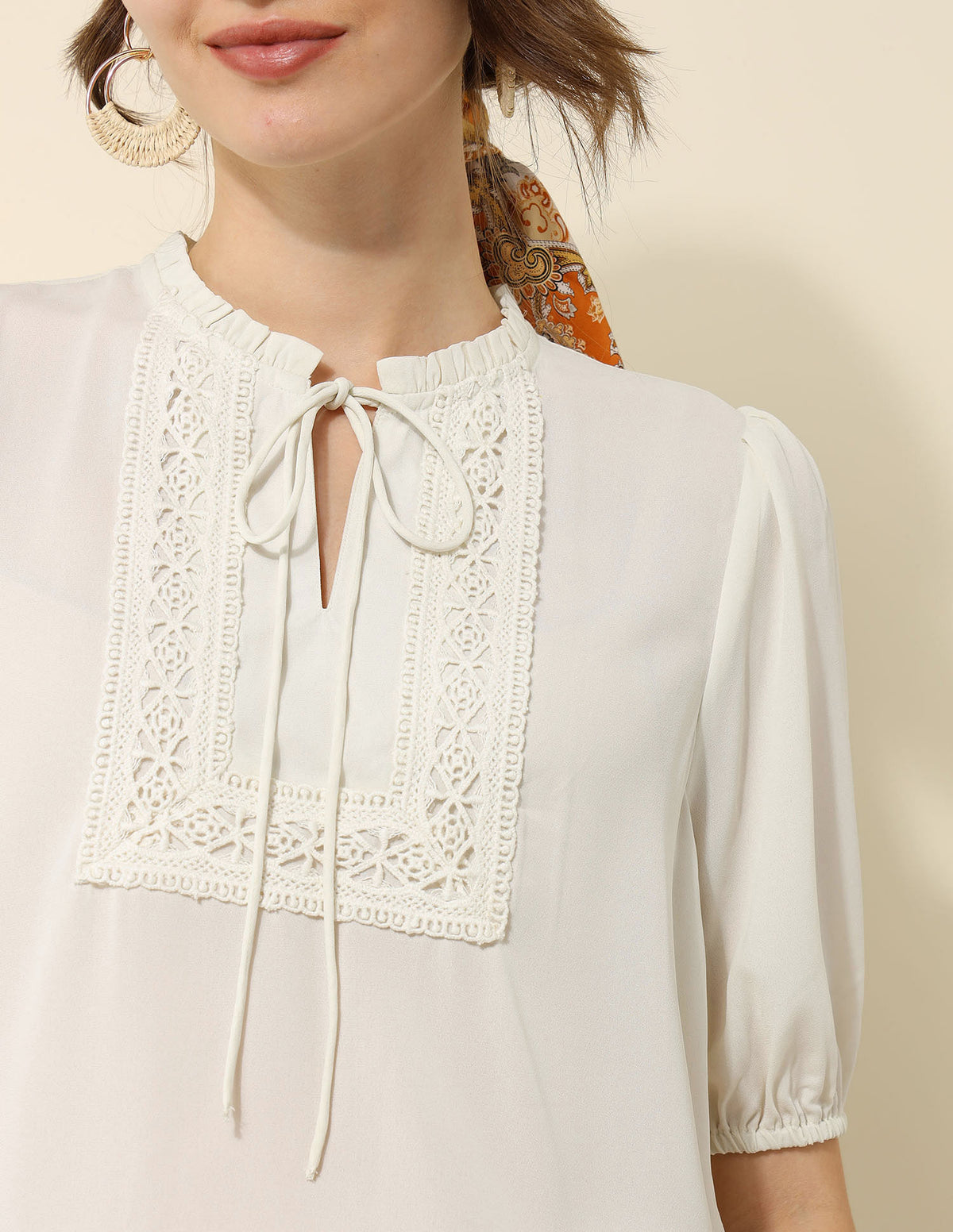 | Round neck with tie-up closure | Lace detailed yoke at chest | Gathered near yoke | Short sleeves | Straight hemline | Solid pattern | Regular weave | Regular fit |