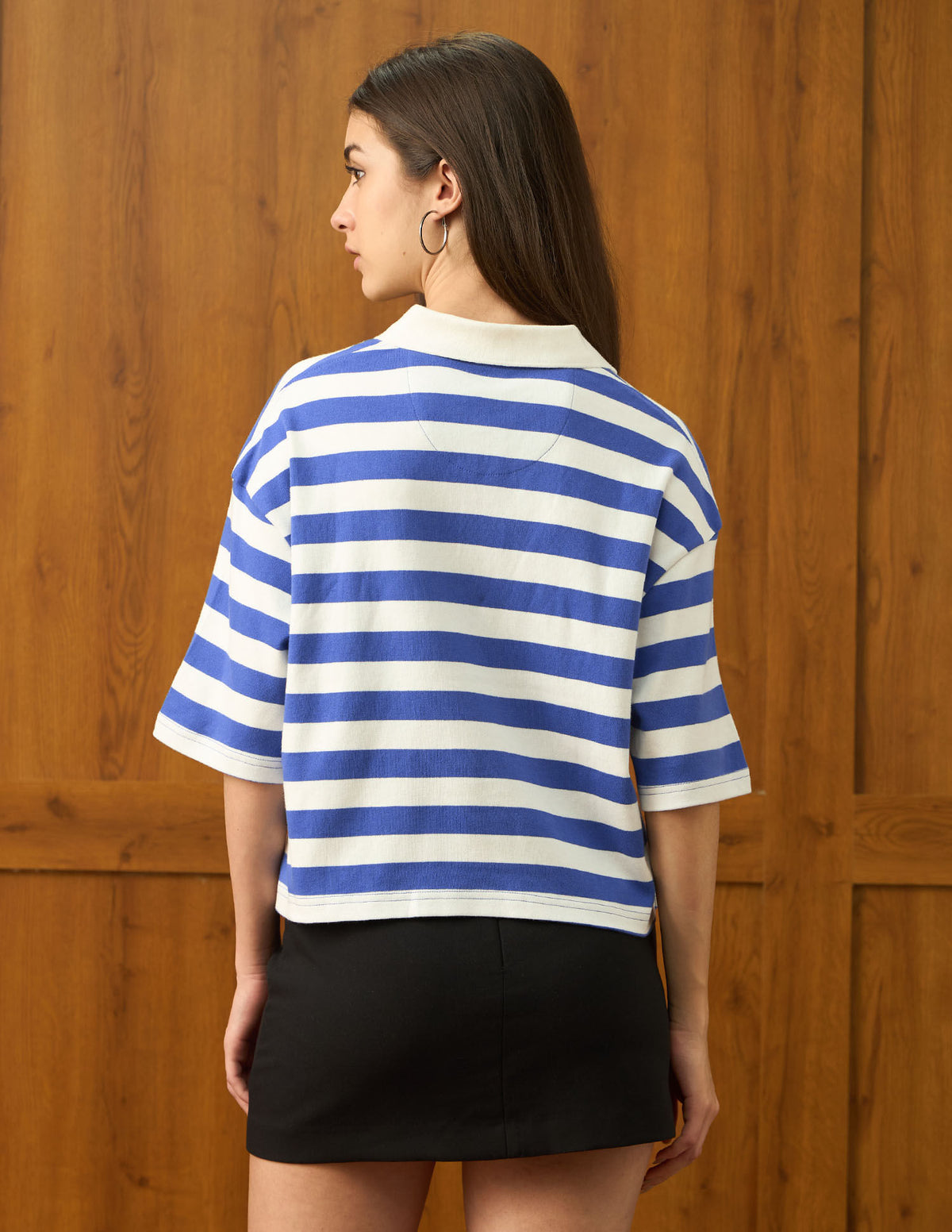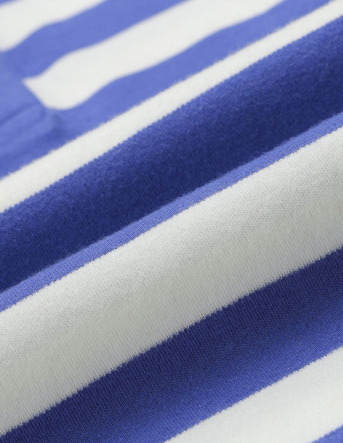 | Polo collar | Logo at chest | Short button placket | Short sleeves | Ribbed collar and sleeve hems | Uneven vented hem | Horizontal striped pattern | Pique knit | Oversized fit |