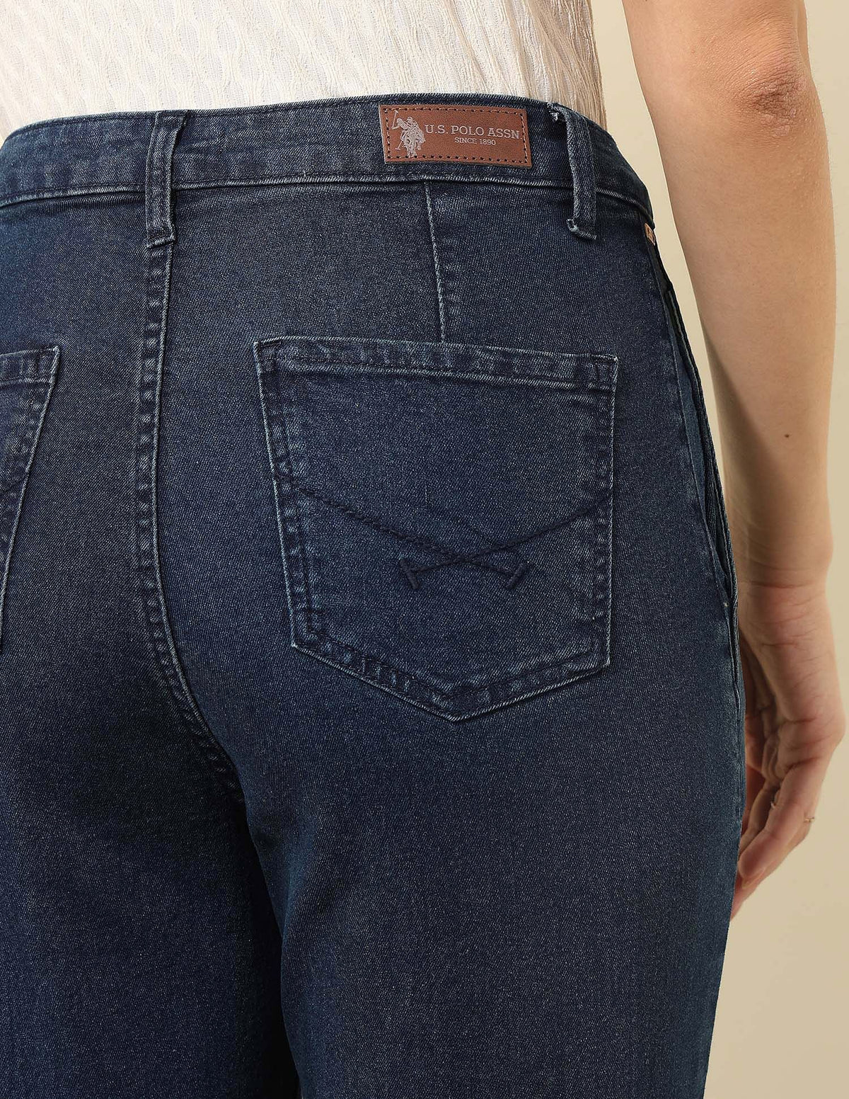 | High-rise waist | Button and zip fly closure | Five pockets | Denim weave | Mom fit |