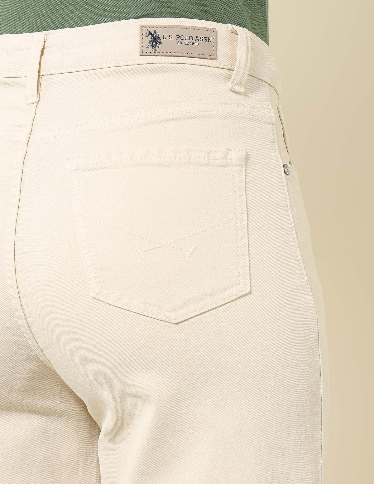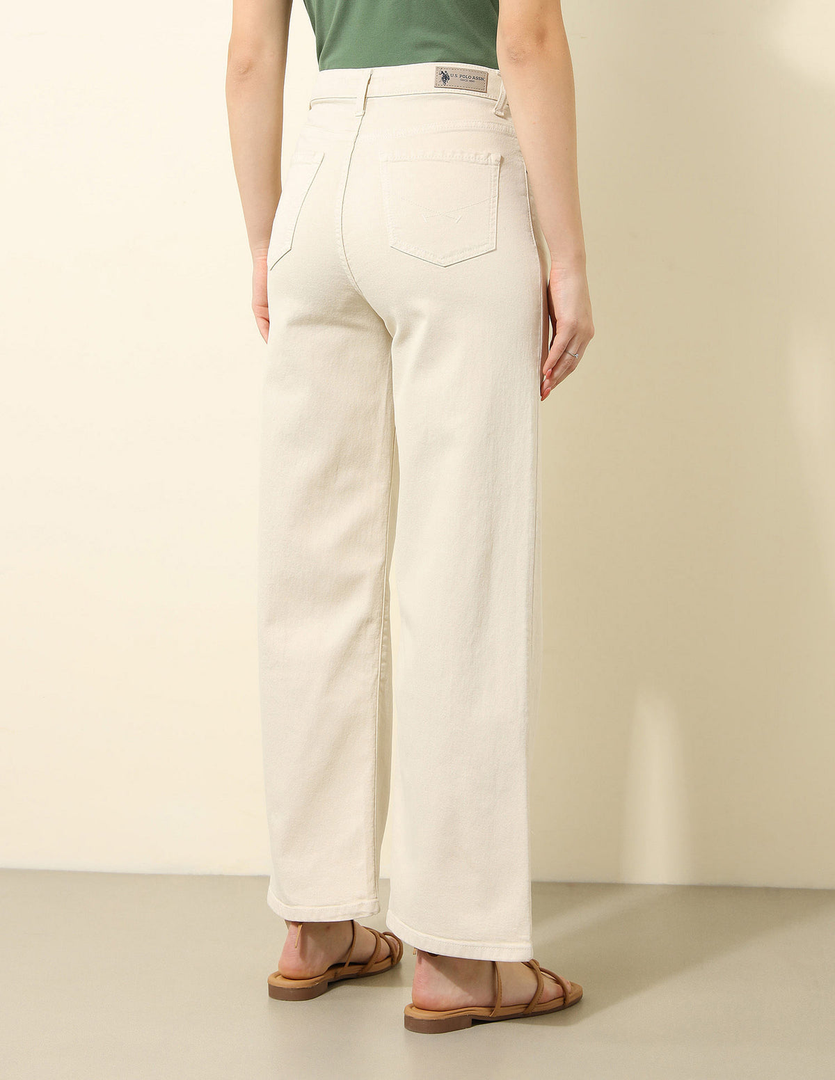 | High-rise waist | Button and zip fly closure | Five pockets | Denim weave | Wide leg fit |