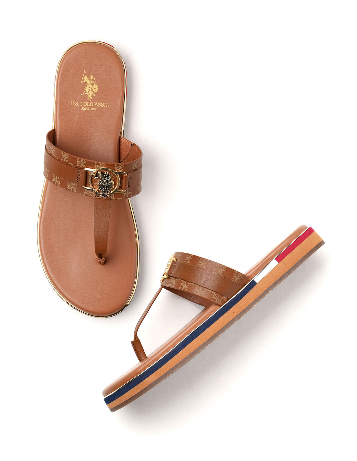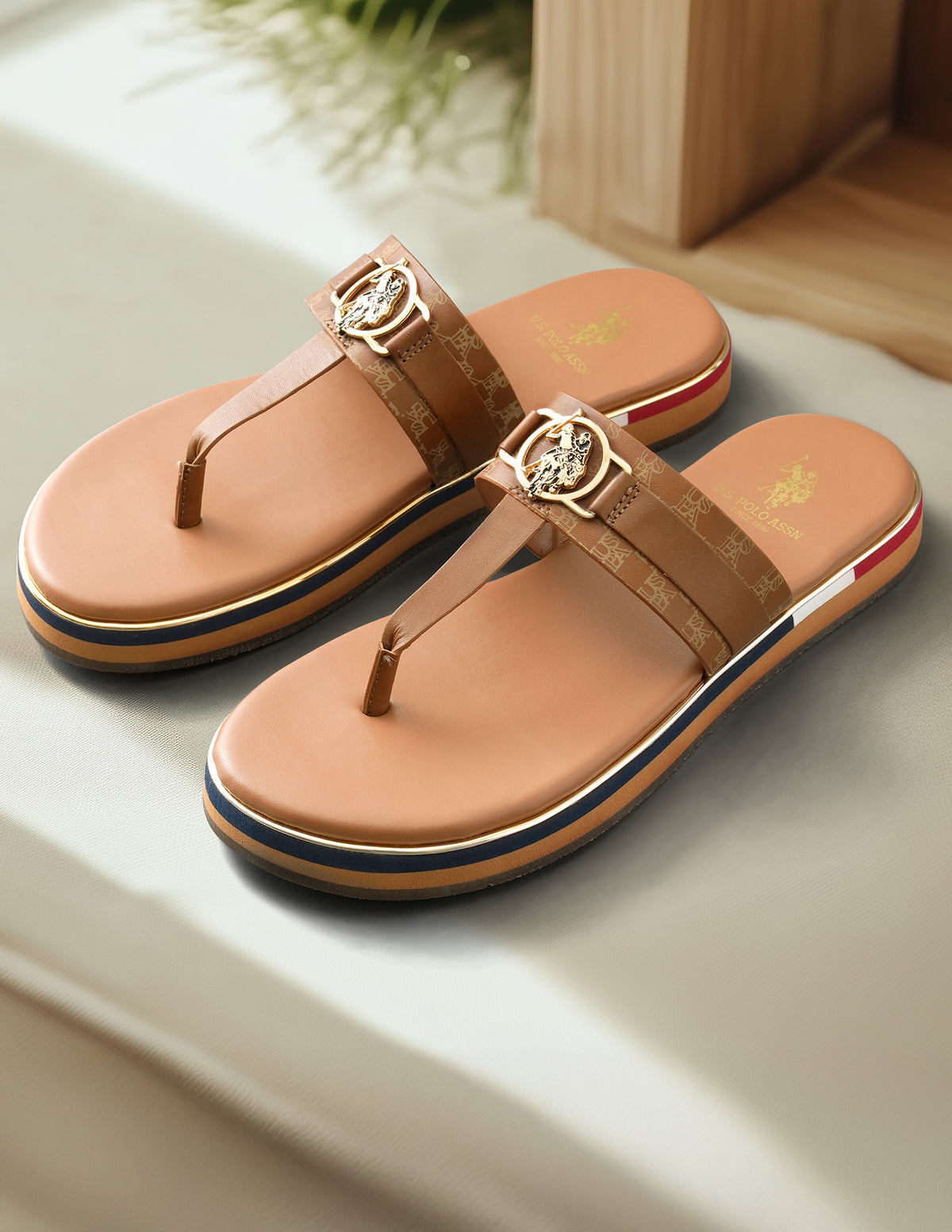 | Broad strap | Metallic logo at top | Cushioned footbed | Textured outsole |