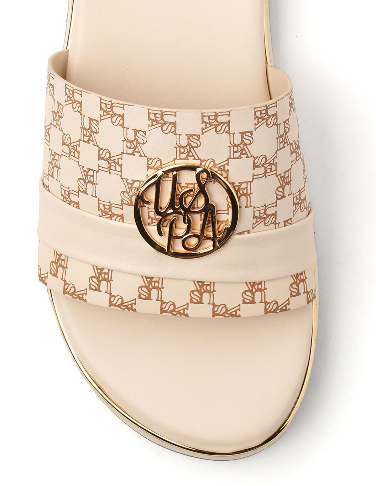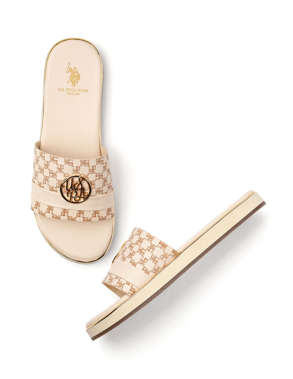 | Open toe | Metallic logo at vamp strap | Cushioned insole with logo | Textured outsole | Brand printed pattern |