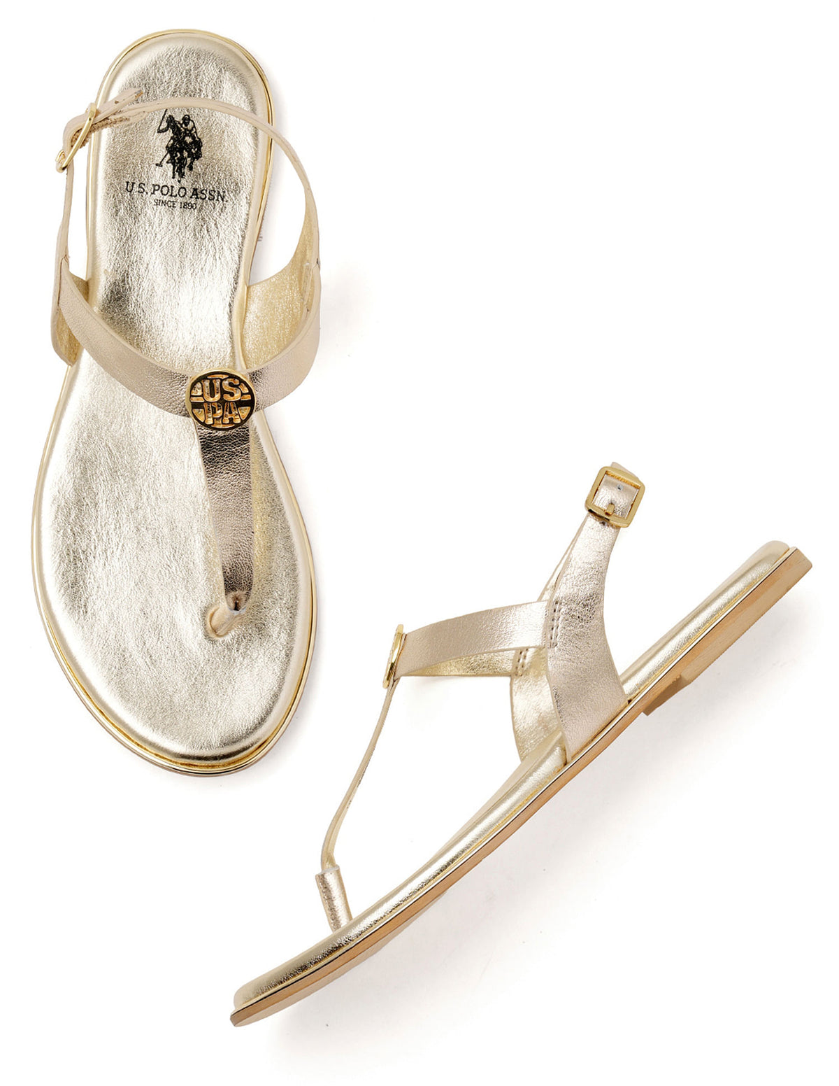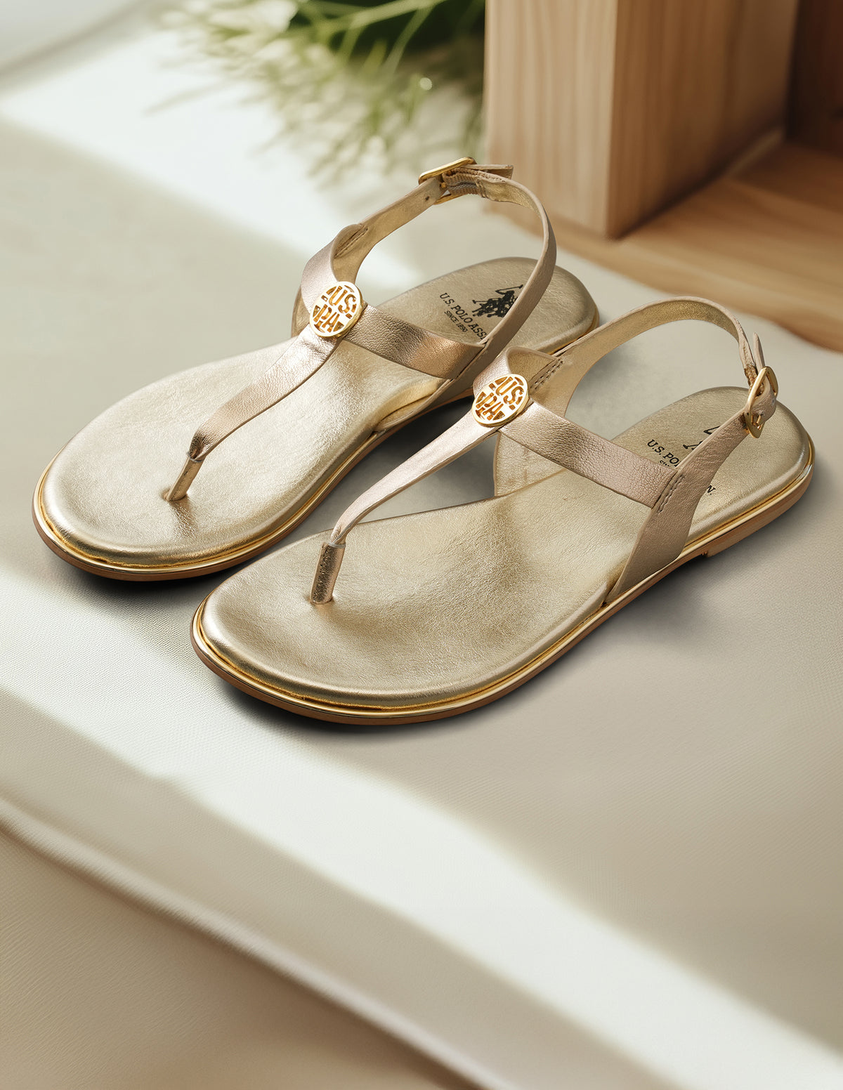 | Open toe | Metallic logo at strap | Cushioned insole with logo | Textured outsole | Adjustable strap at back | Solid pattern |