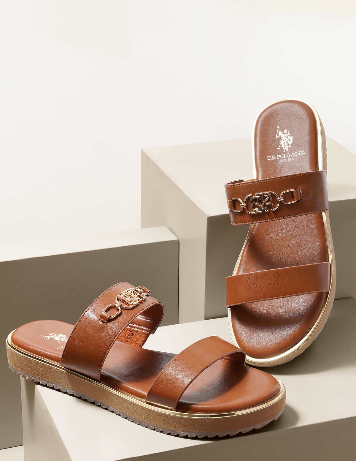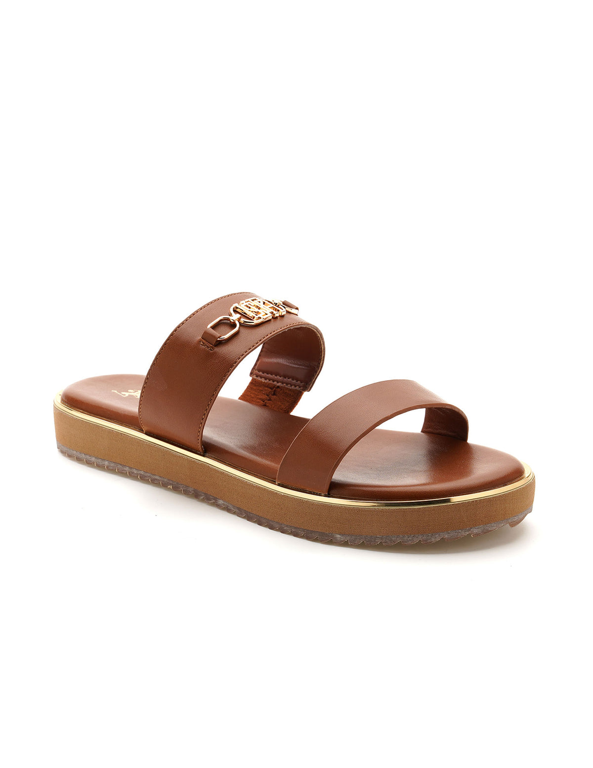 | Open toe | Vamp strap with brand metallic accent | Cushion footbed with branding | Striped outsole | Solid pattern