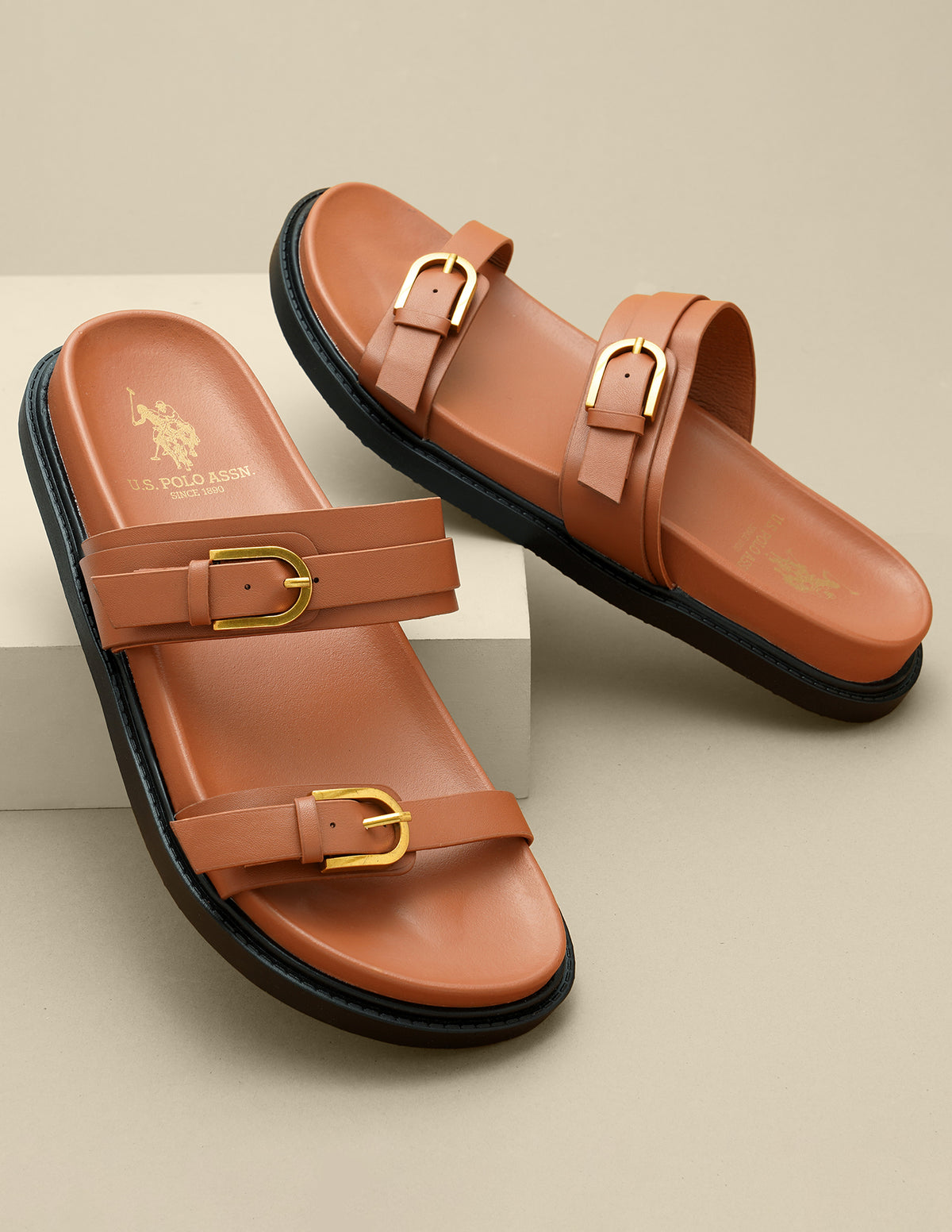| Open toe | Double strap with adjustable buckle closure across vamp | Ankle strap with elasticized gusset | Cushioned footbed | Textured outsole