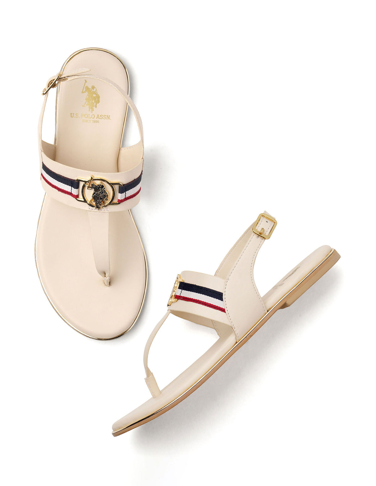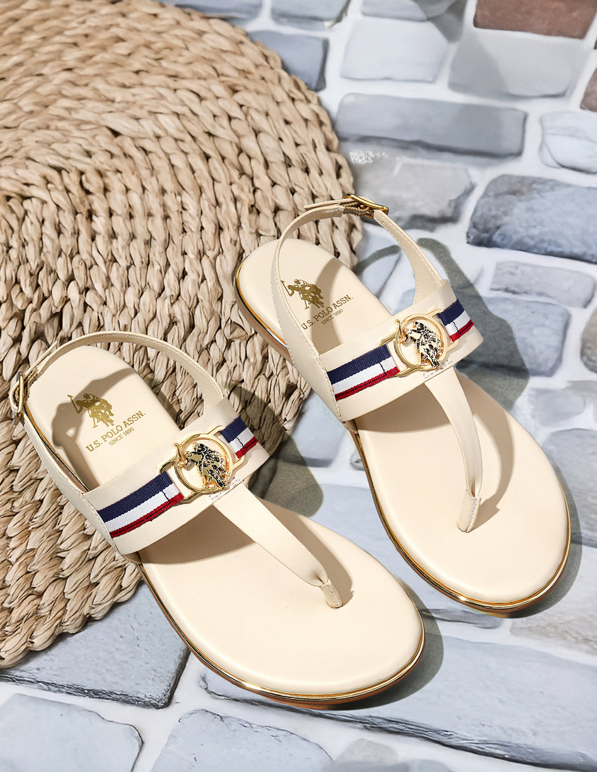 | Open toe | Metallic logo at strap | Cushioned insole with logo | Textured outsole | Adjustable strap at back | Solid pattern |