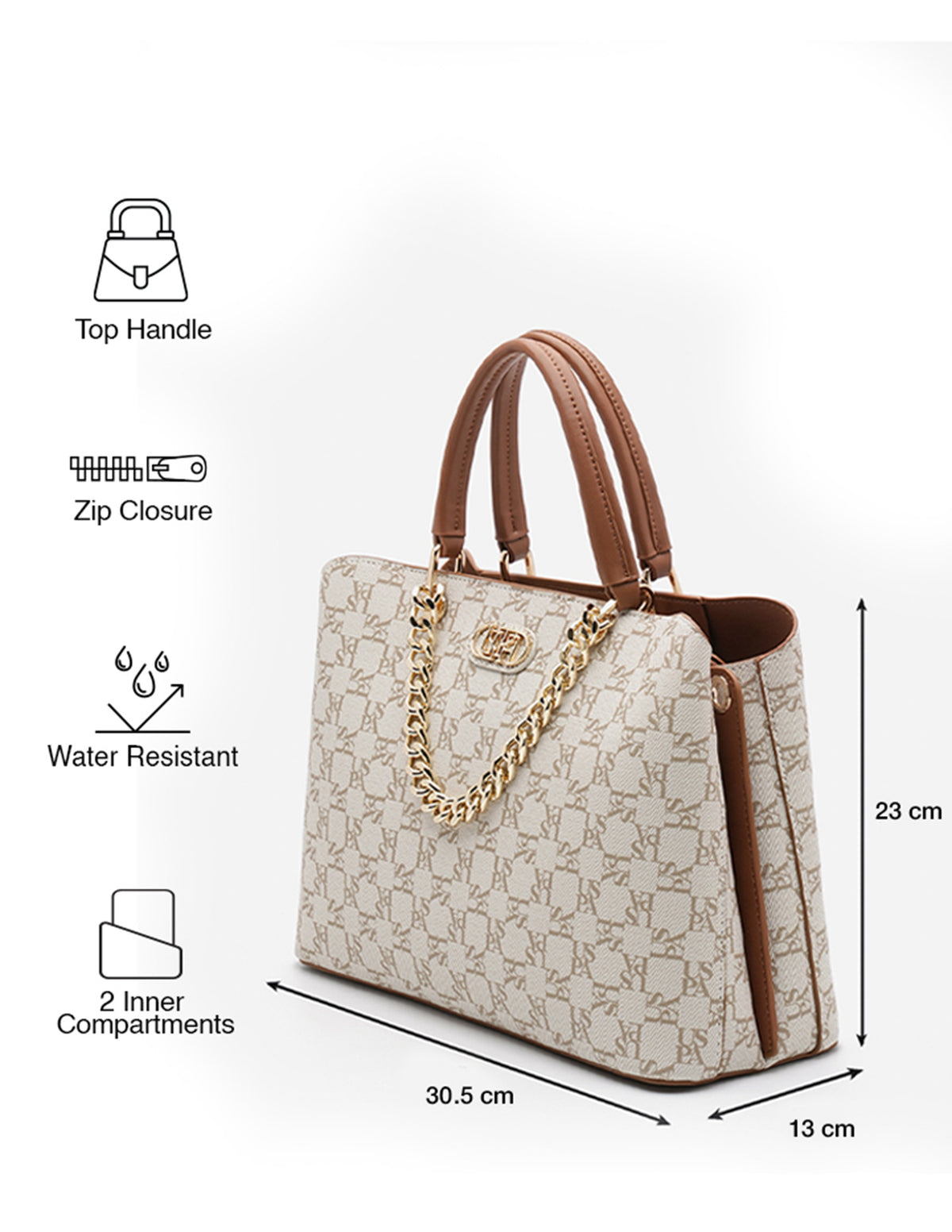 Story: The Zoe Off White Satchel Bag combines modern aesthetics with ultimate practicality. Designed in a large size, this bag offers ample space for all your essentials while maintaining a sleek, stylish appearance. Its clean off-white tone ensures timeless appeal, making it a versatile addition to any wardrobe. High-quality materials and sturdy construction make this bag a reliable companion for daily use. Dual carrying options—top handles and a sling strap—make it adaptable to various occasions, from business meetings to casual outings.