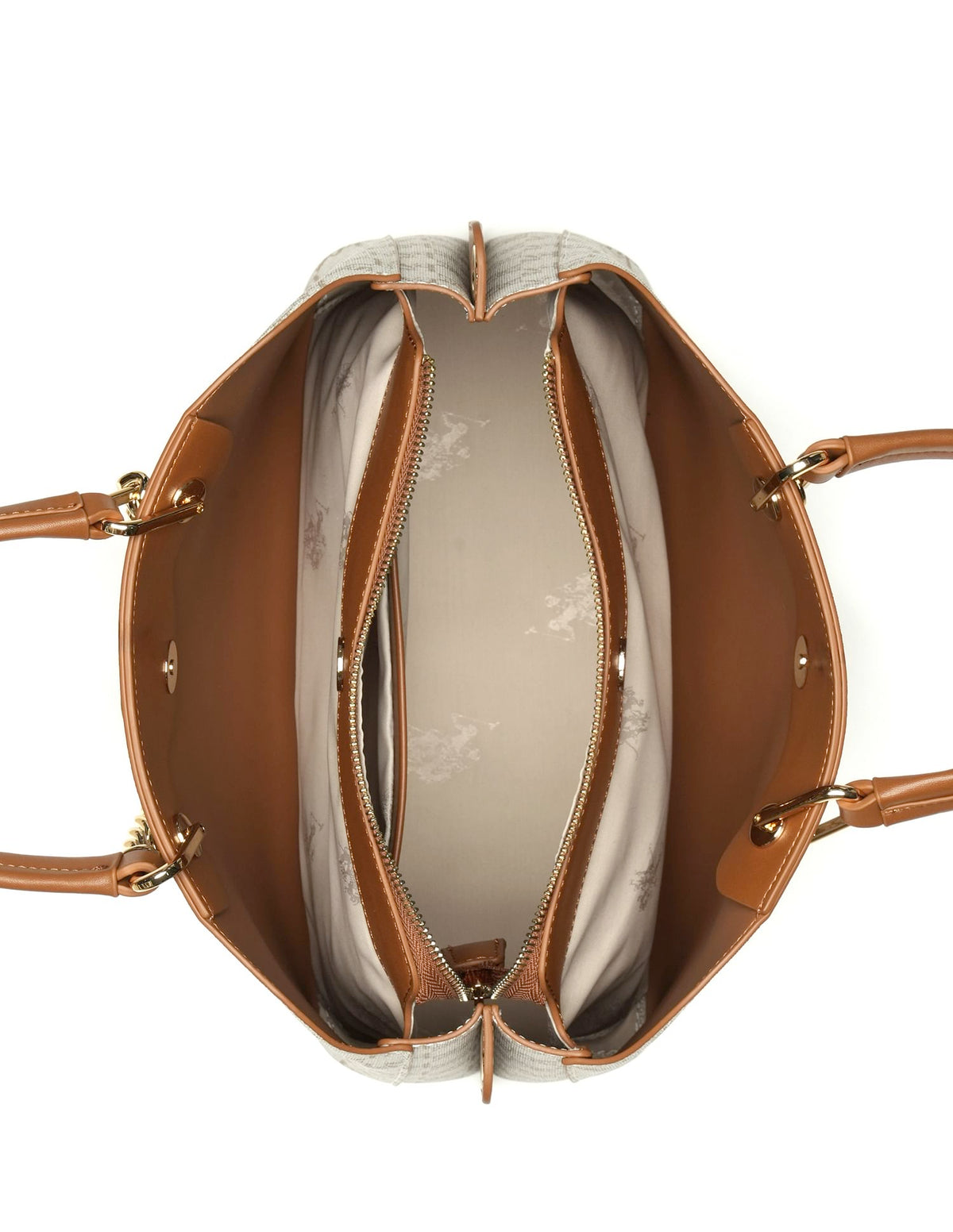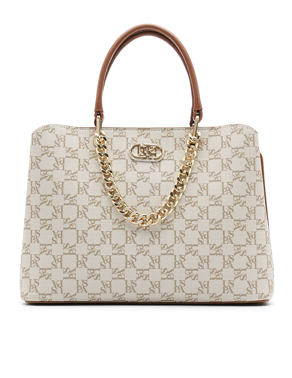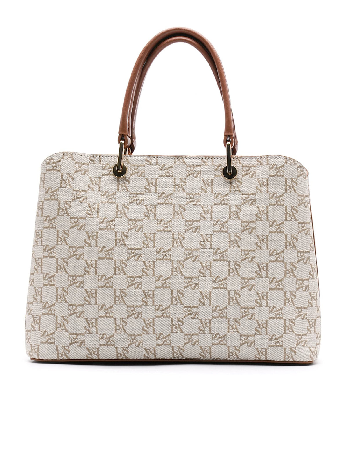 | Top handles | One main compartment with zipper closure | One inner zipper pocket | Two exterior detachable pouch | Monogram printed pattern | Dimensions: 33.02 x 30.48 x 8.26 (approx. in cms) |