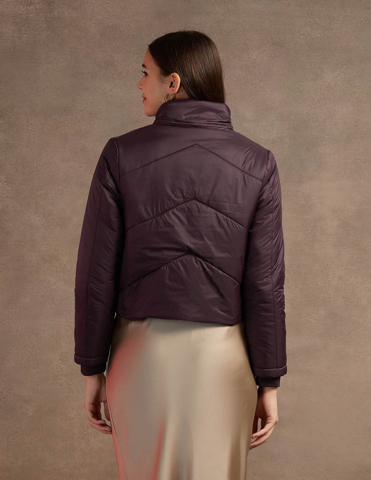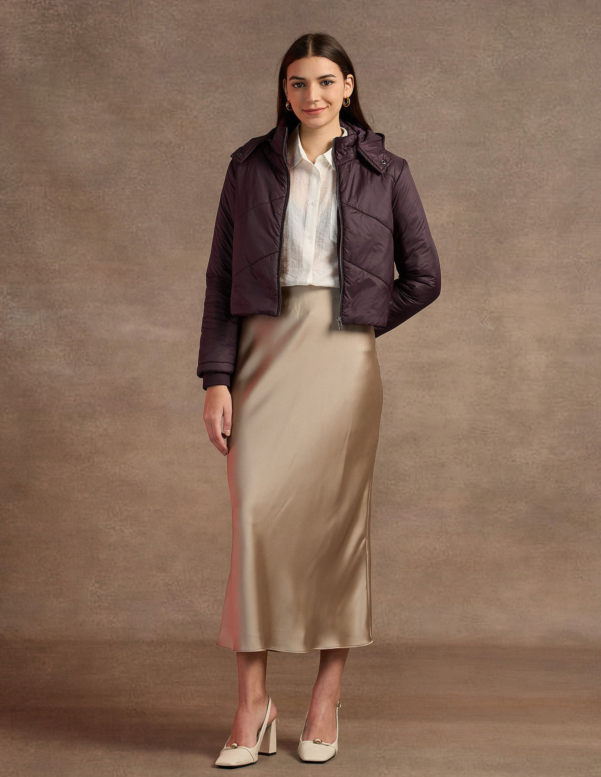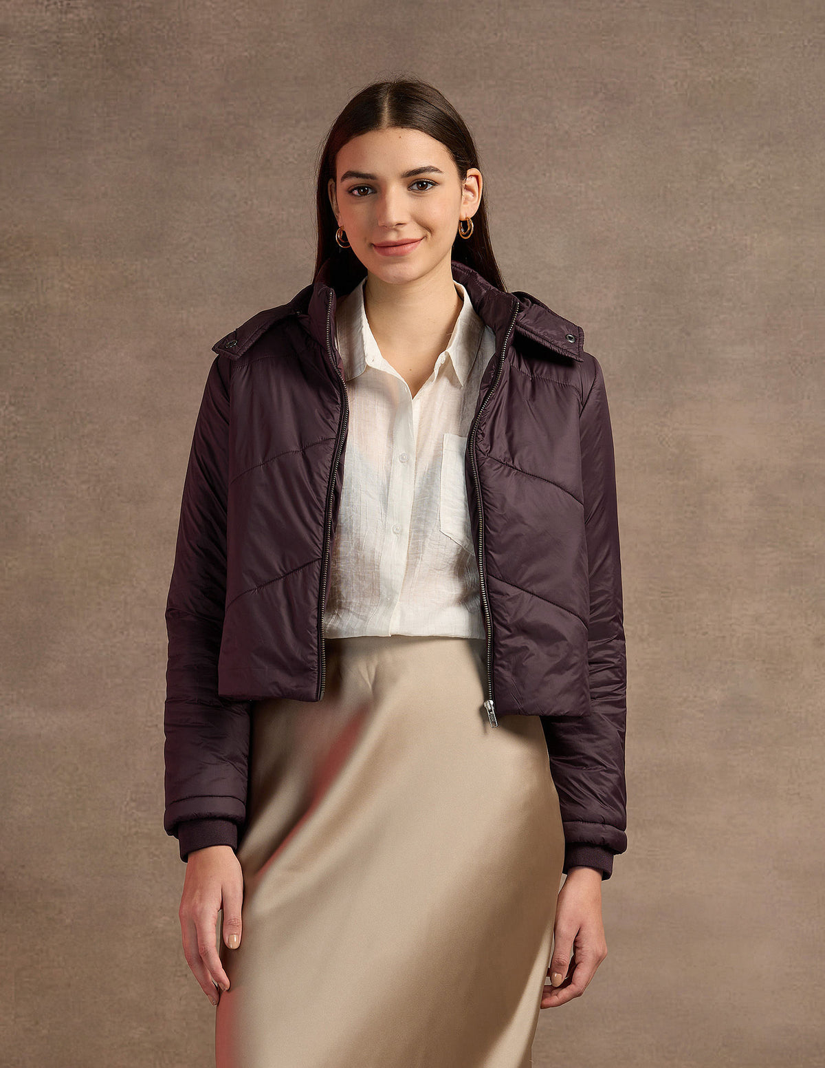 | Detachable hood | High neck | Full zipper closure | Long sleeves with ribbed hems | Two pockets | Quilted construction | Solid pattern |