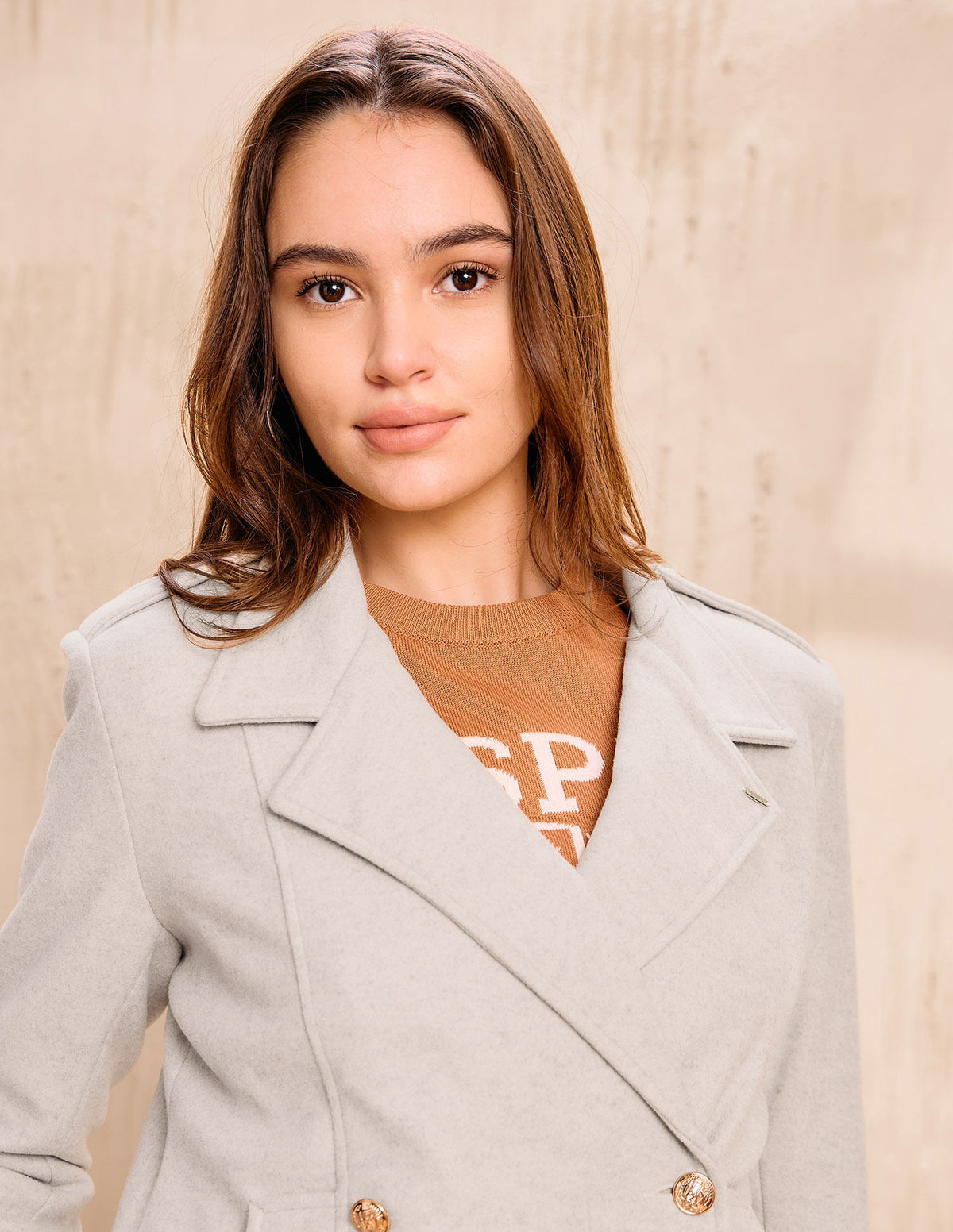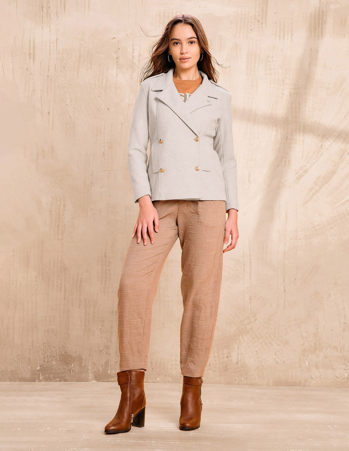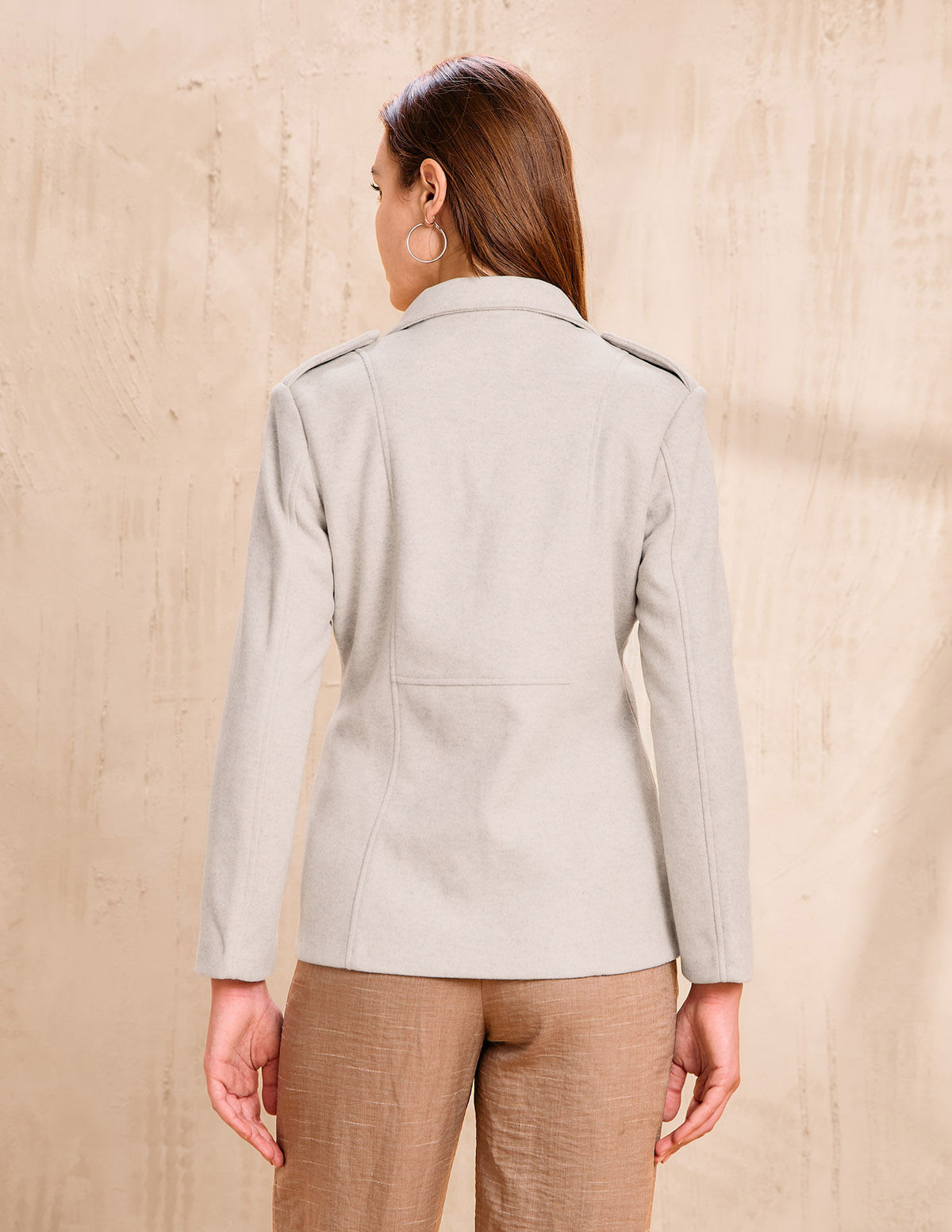 | Notch lapel neck | Button closure | Long sleeves | Elasticized sleeve hems and hemline | 2 pockets | Solid pattern | Regular fit |